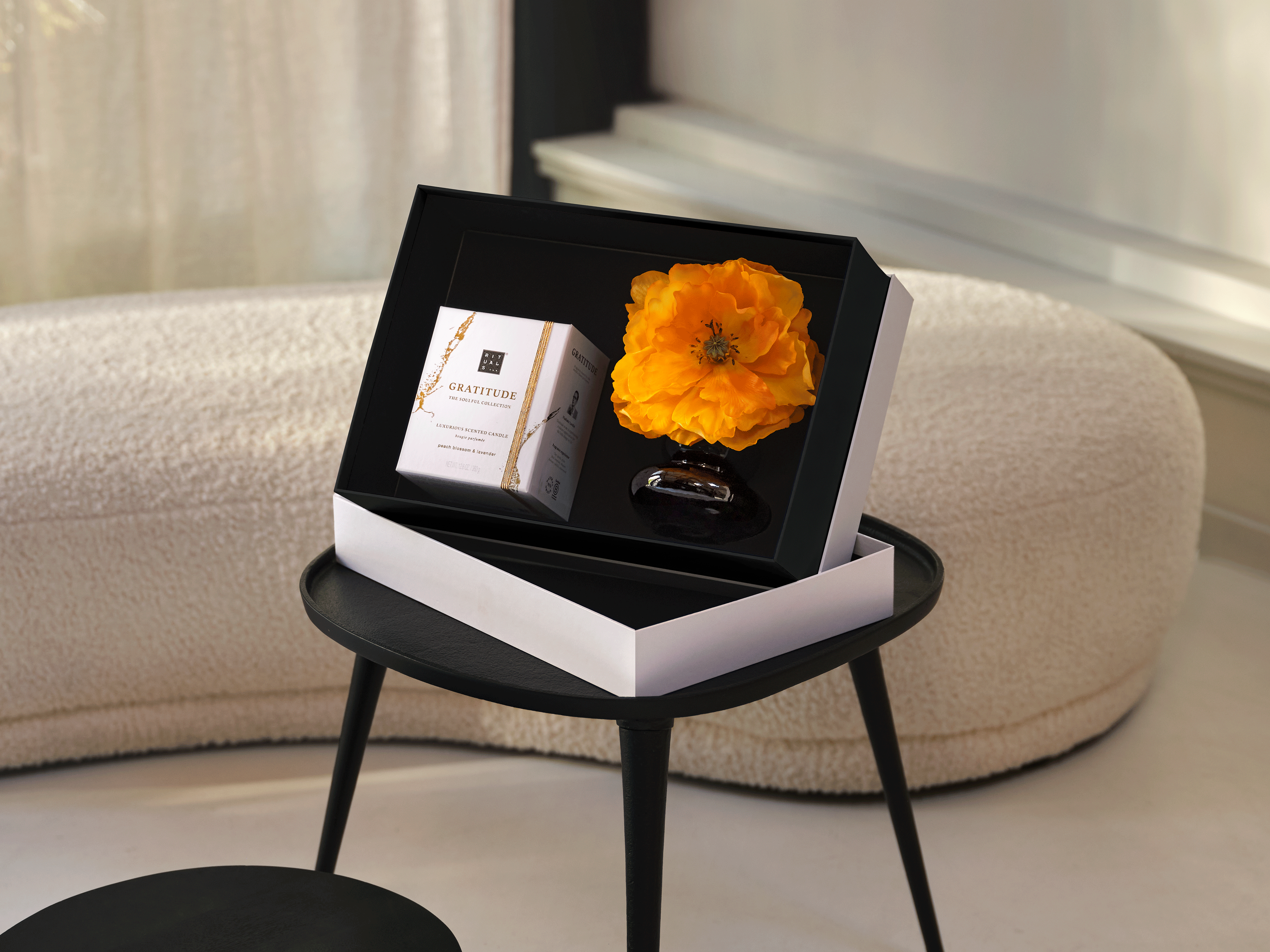 This limited edition box features our new, exclusive Mini: an elegant black vase with a lifelike yellow poppy. Paired with the Gratitude scented candle by Rituals.