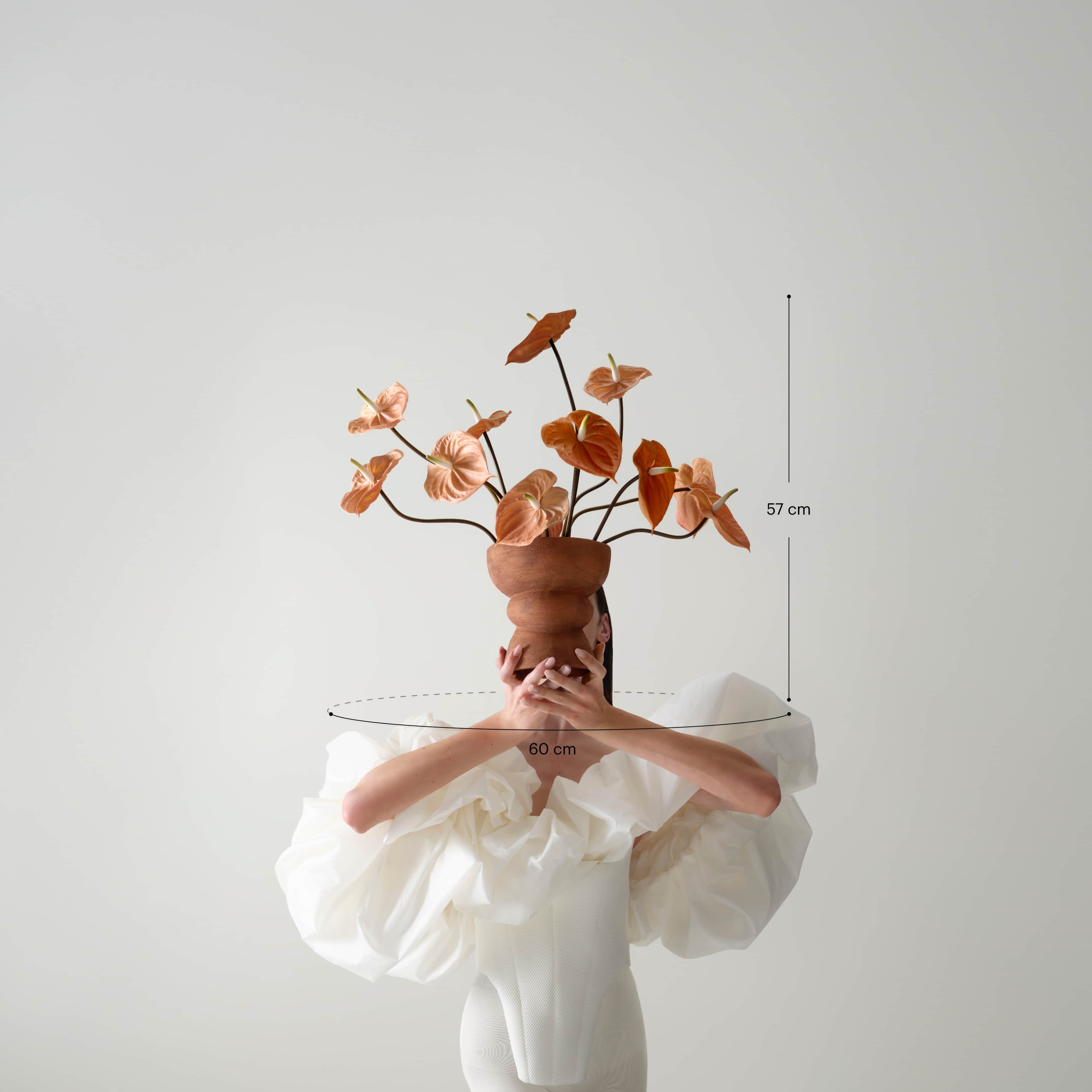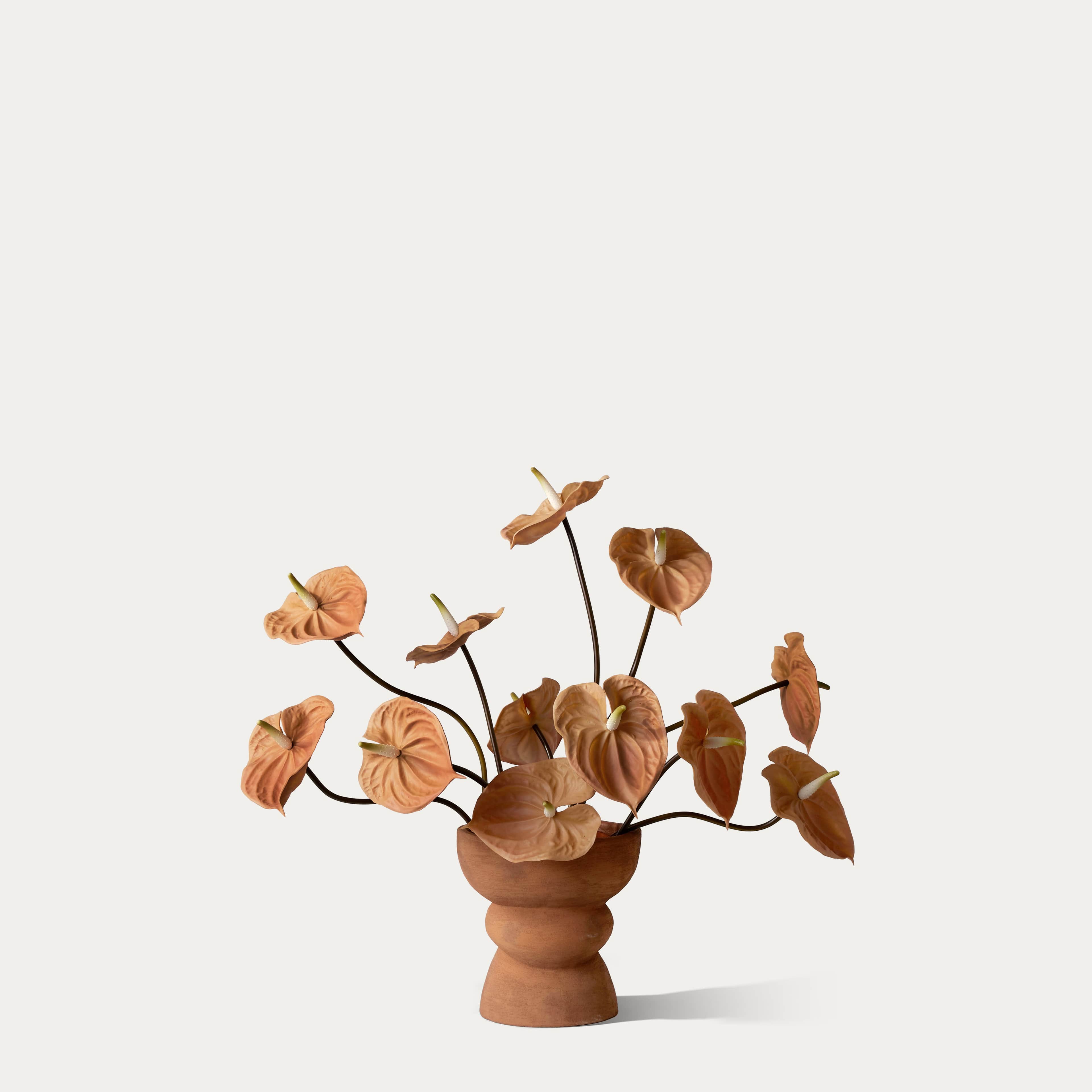 A bold and natural silk bouquet featuring beige anthuriums with a soft matte finish, arranged in a warm brown flower pot with an organic, sculptural shape. The bouquet comes with our complementary floral scent.