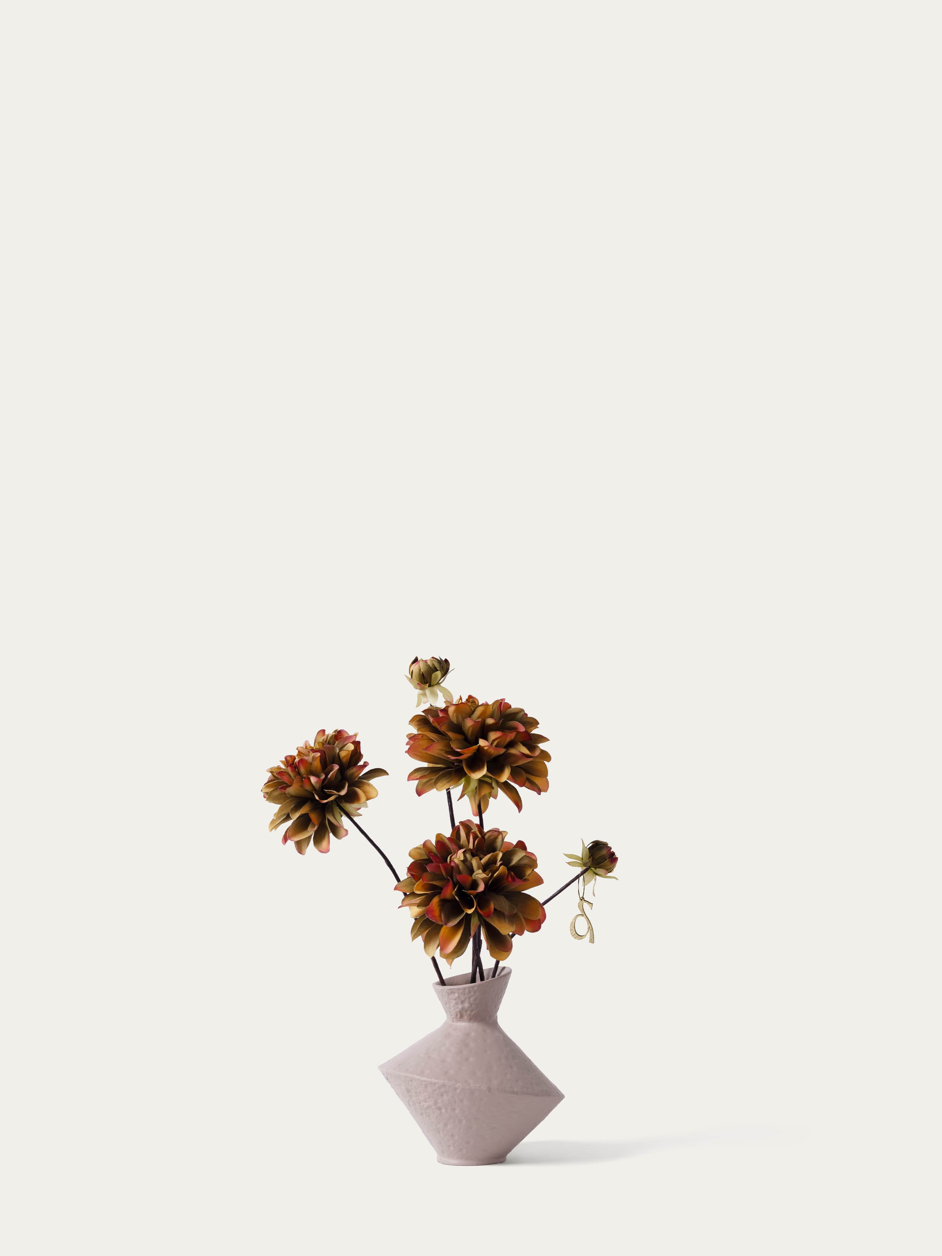 Three elegant silk dahlias in an organic beige vase. The bouquet comes with our complementary floral scent.