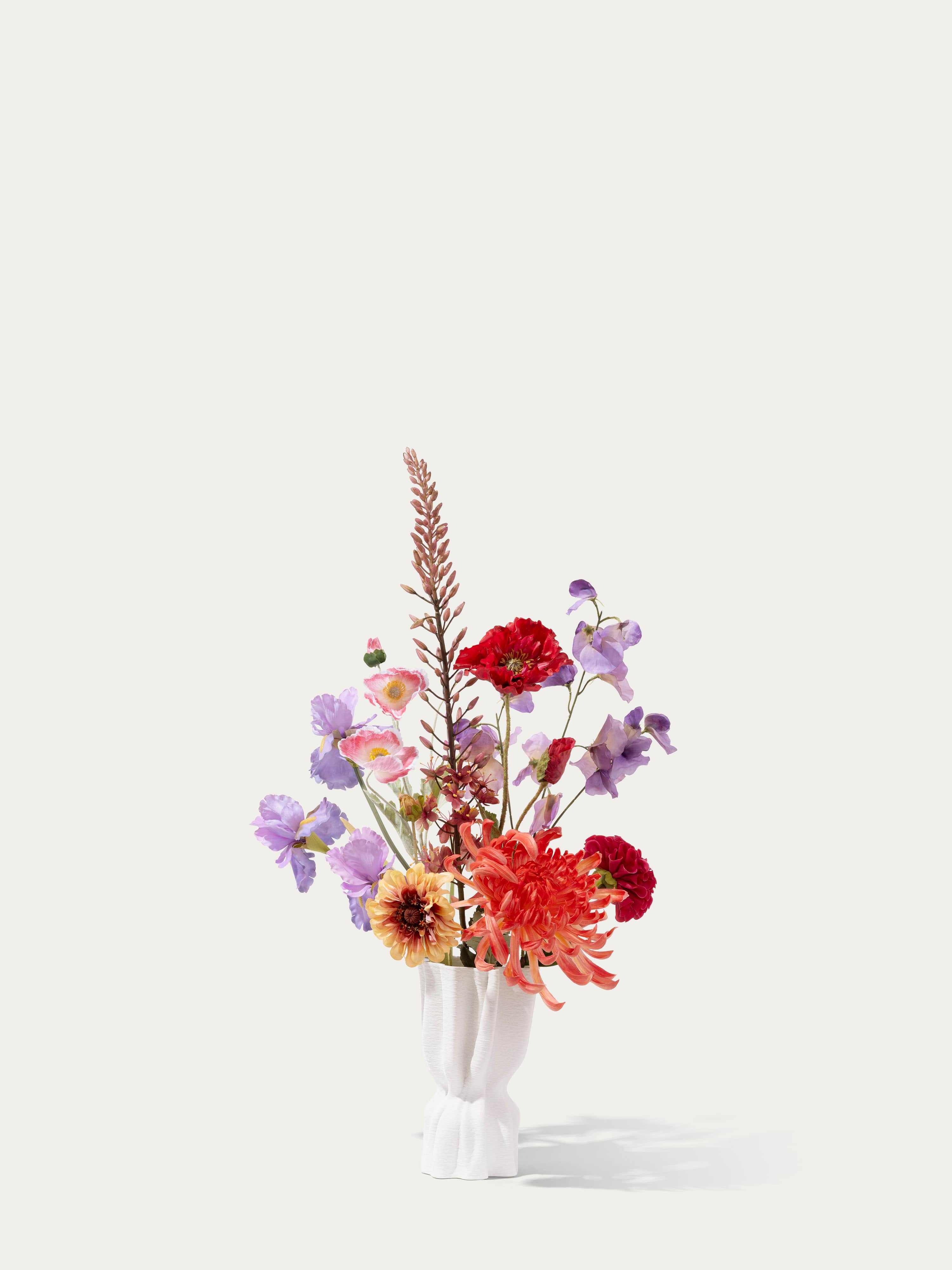 Elegant wildflower bouquet in an organically shaped vase, featuring red chrysanthemum, lilac silk sweet pea, purple eremurus, silk poppies, and real-touch iris and dahlia. The bouquet comes with our complementary floral scent.