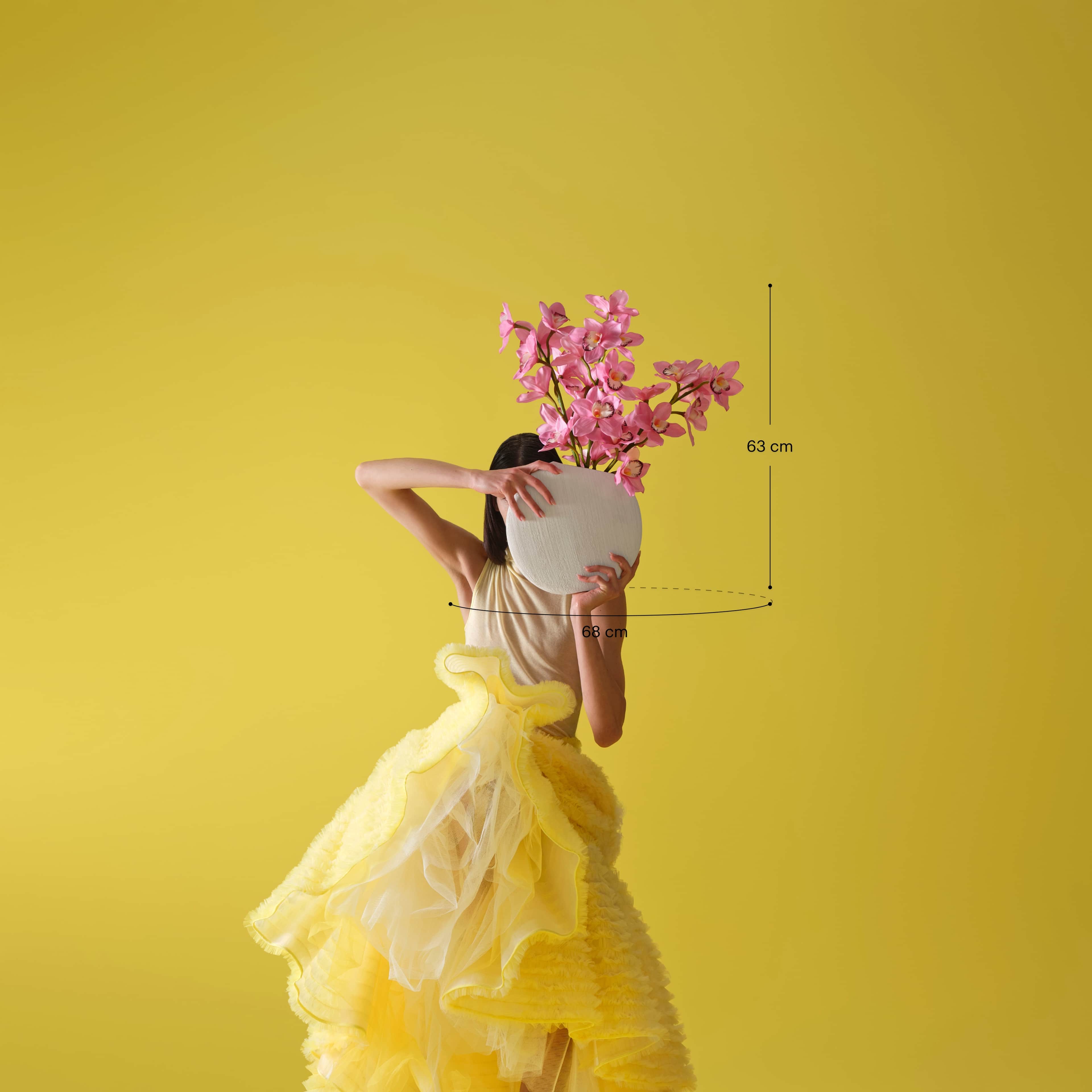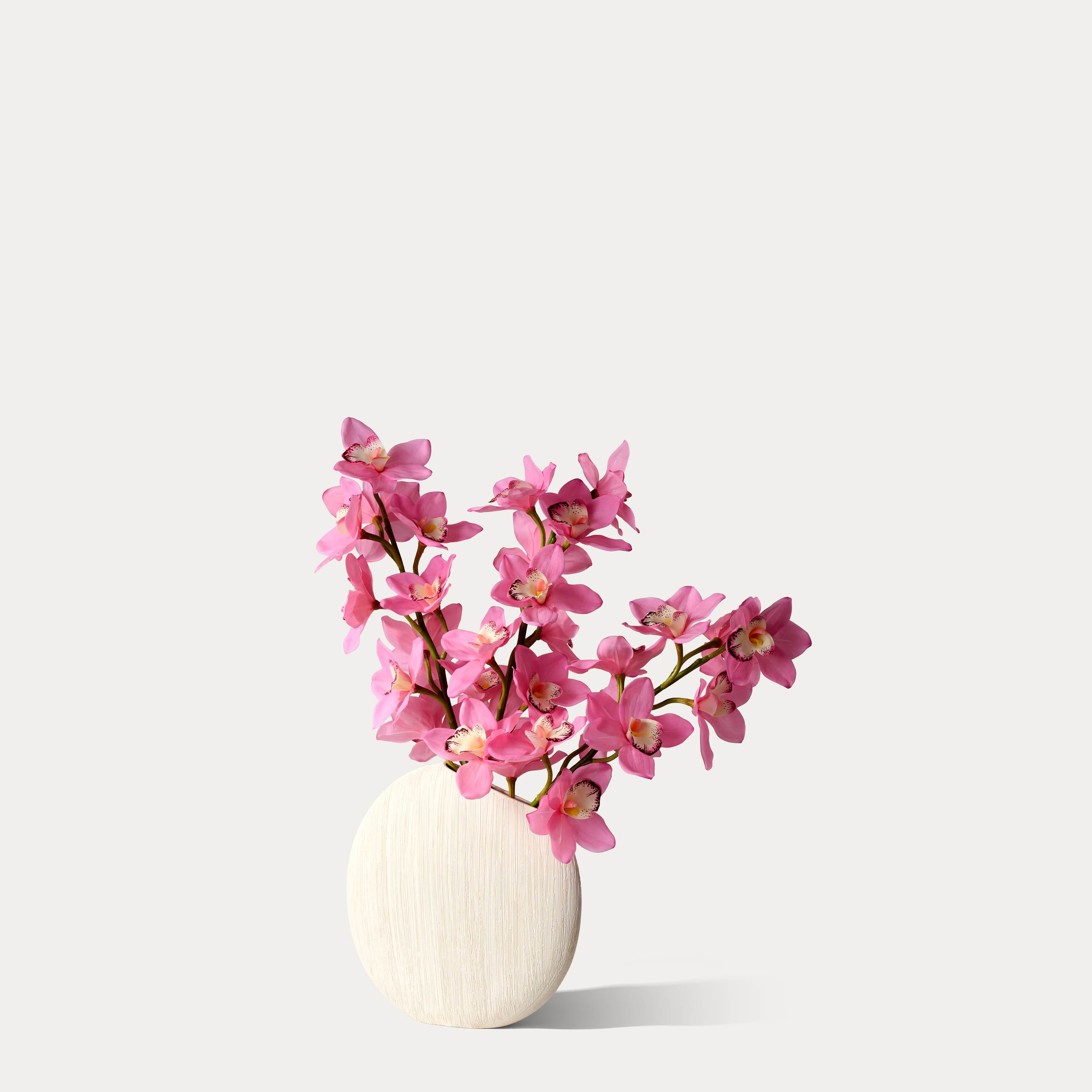 A refined silk bouquet featuring real-touch pink cymbidium orchids, arranged in a cream Japandi-style vase. The bouquet comes with our complementary floral scent.