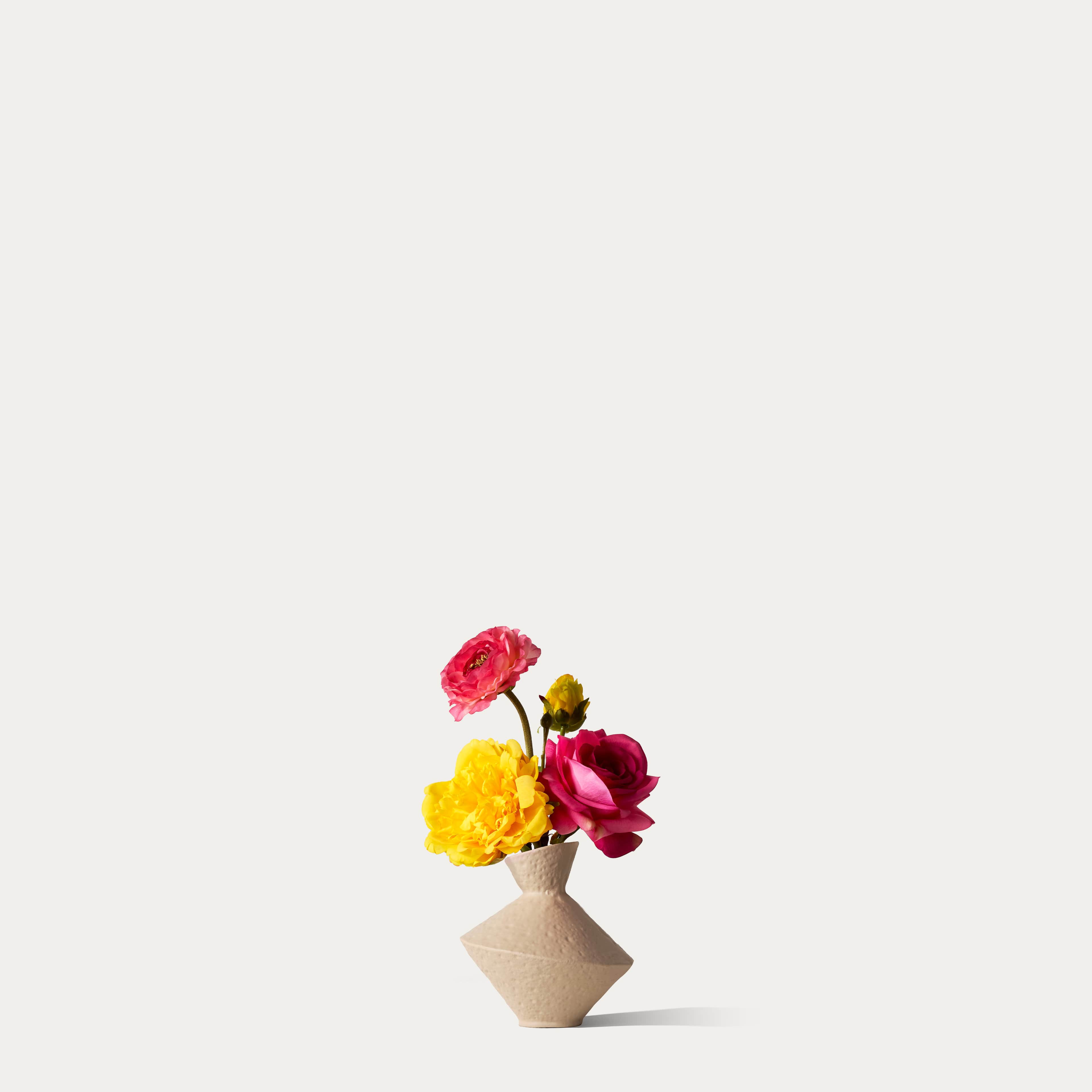 A delicate silk bouquet featuring real-touch yellow peony, pink ranunculus and hot pink rose, arranged in an organic vase. The bouquet comes with our complementary floral scent.