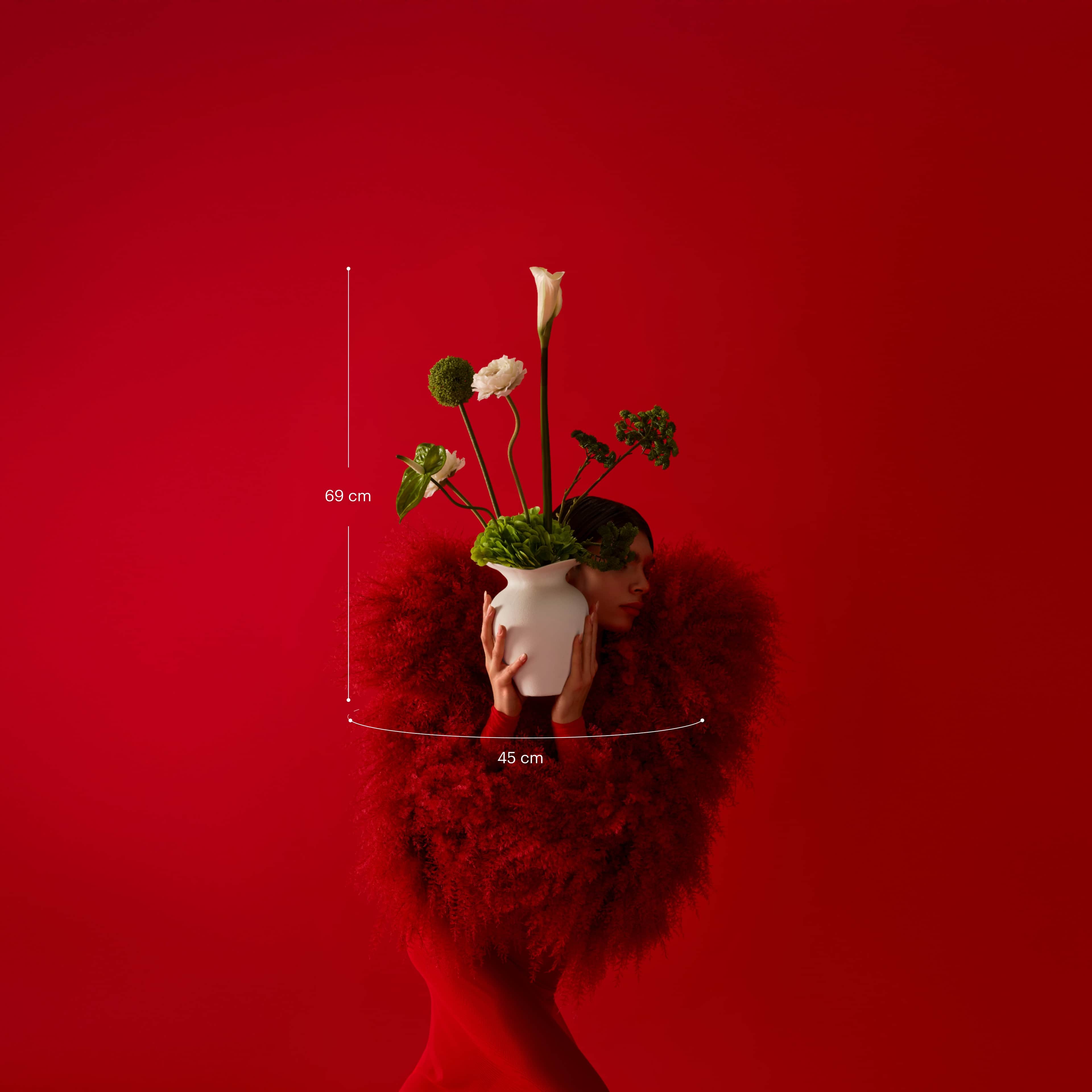 An elegant and serene silk bouquet in green and white tones, featuring allium, calla, hydrangea, white ranunculus, anthurium and angelica, arranged in a white organic vase. The bouquet comes with our complementary floral scent.