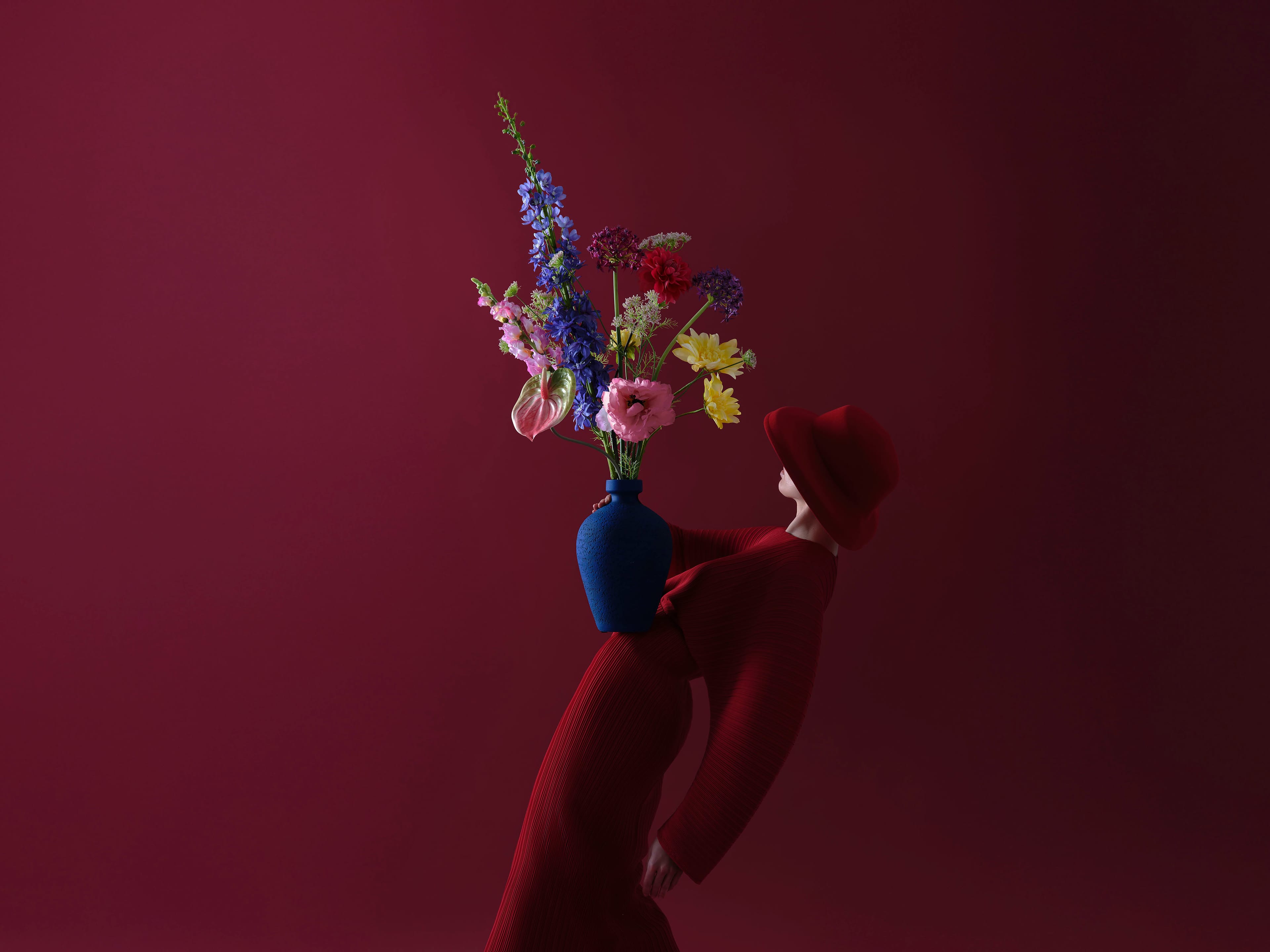 A striking floral composition where bold hues meet an unexpected vase pairing, featuring blue delphinium, yellow dahlia, and pink poppy. This bouquet comes with our complimentary floral scent.