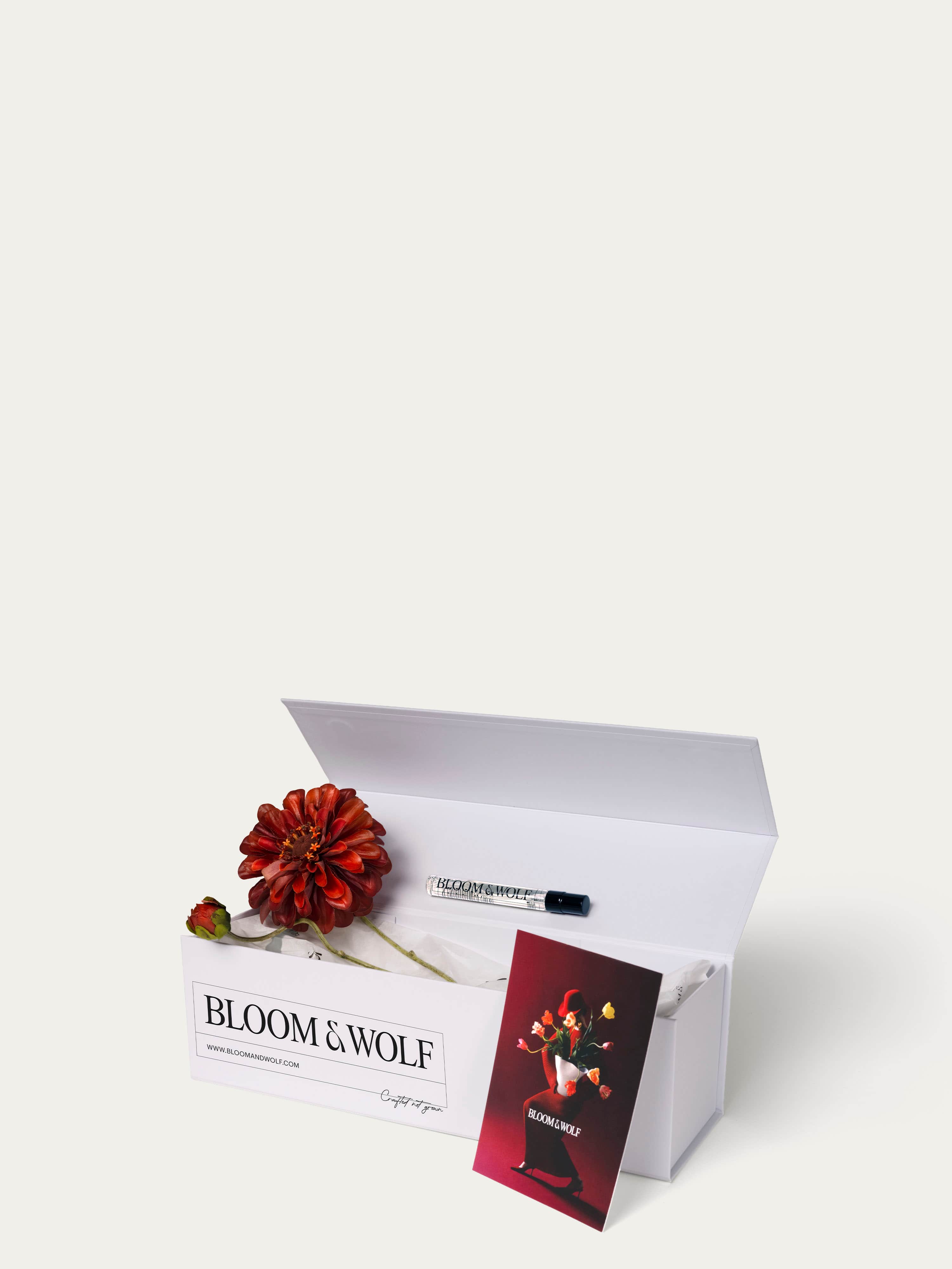 When you order a giftbox, the recipient will receive our beautiful Bloom & Wolf giftbox which includes a stunning real-touch flower, our signature scent, and a personalized handwritten note.