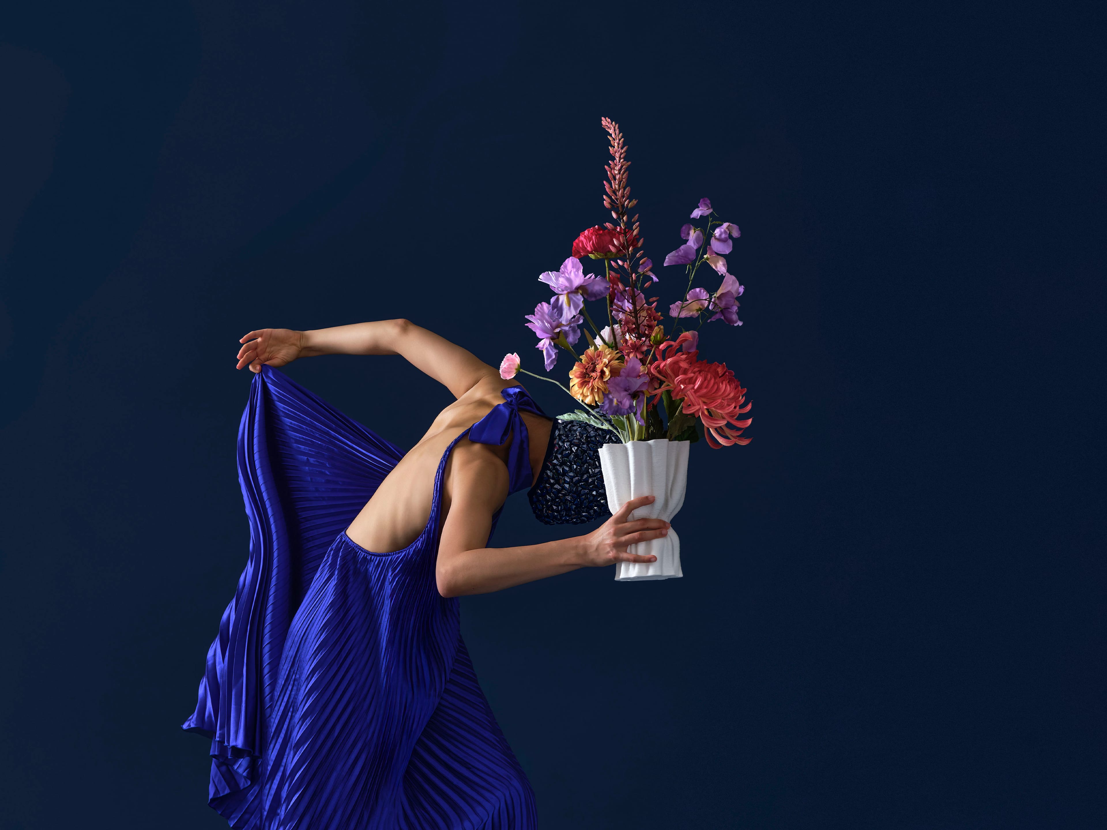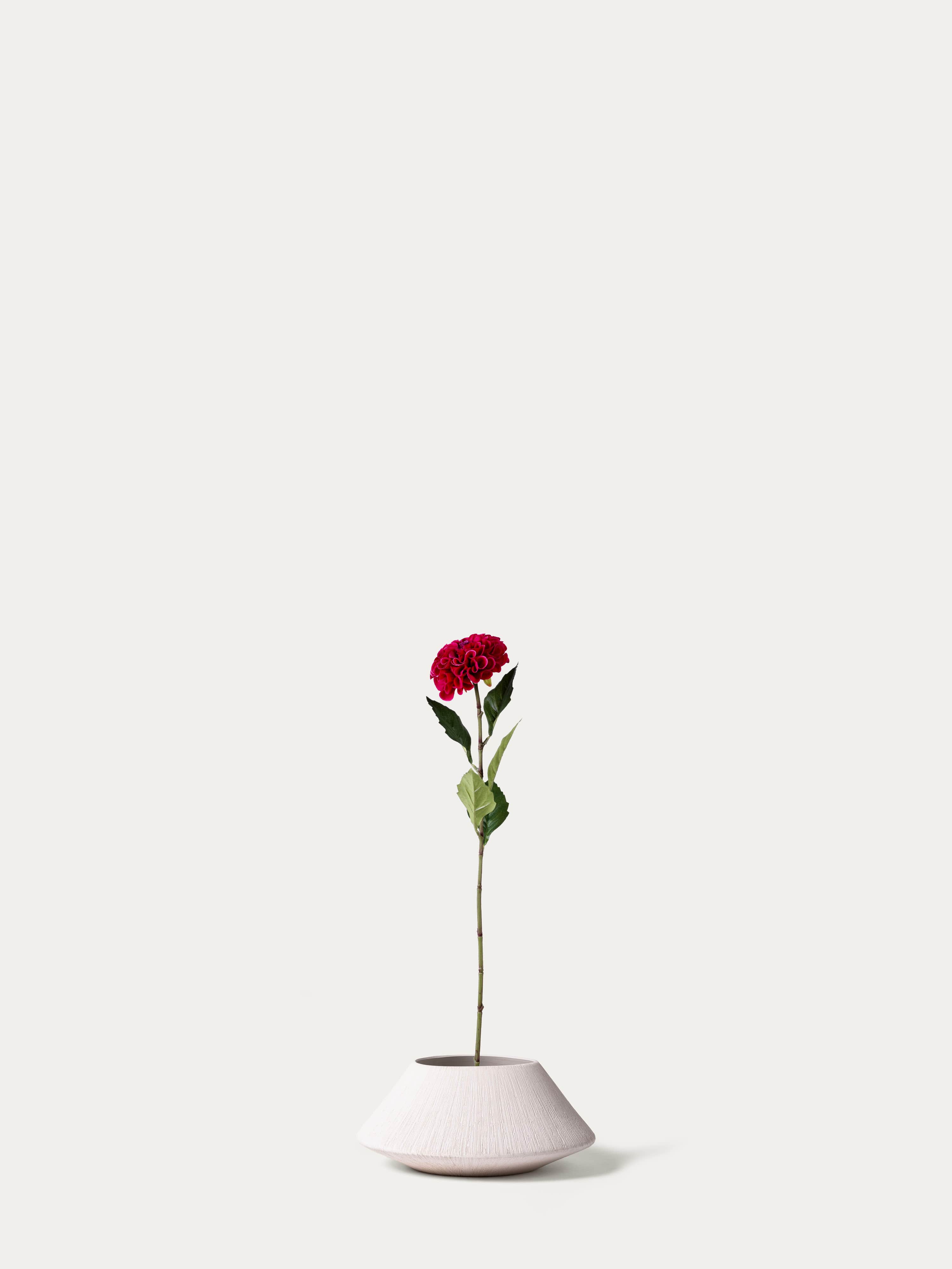 Elegant wildflower bouquet in an organically shaped vase, featuring red chrysanthemum, lilac silk sweet pea, purple eremurus, silk poppies, and real-touch iris and dahlia. The bouquet comes with our complementary floral scent.
