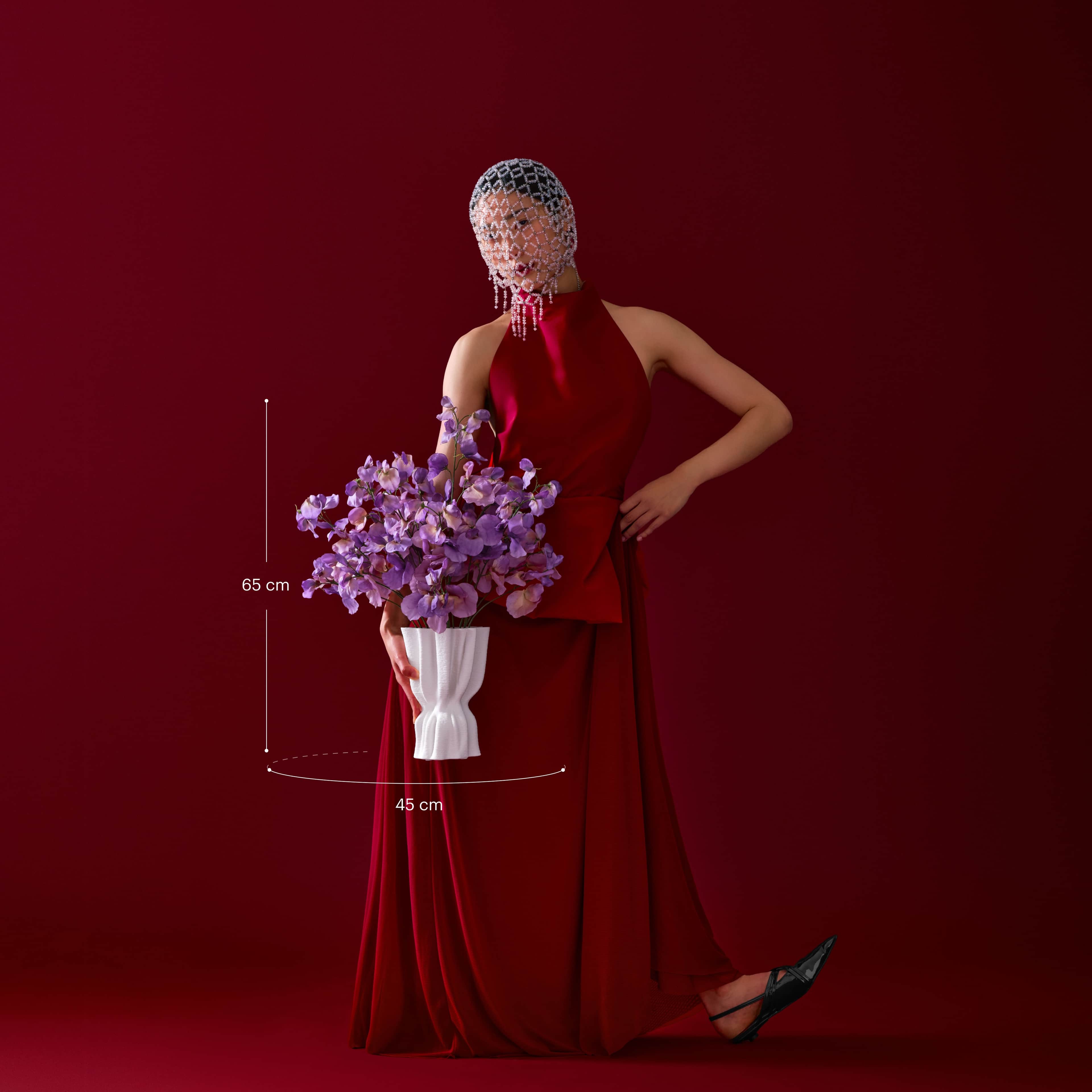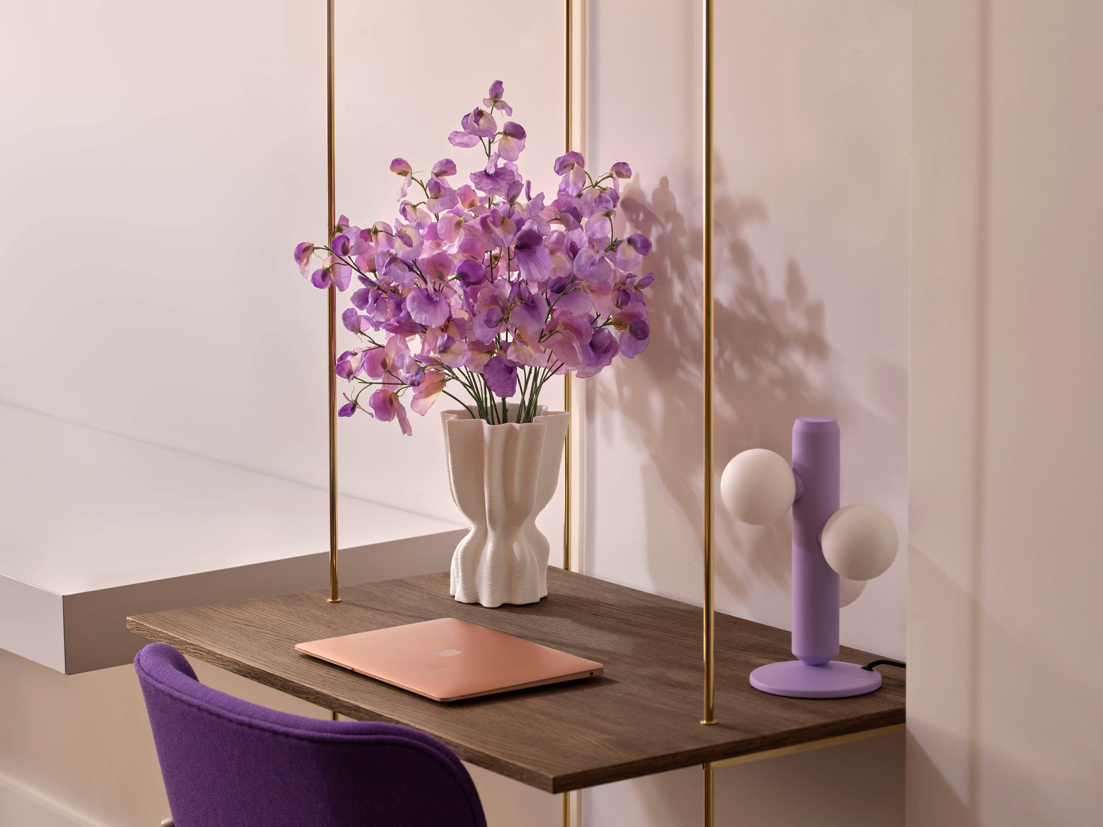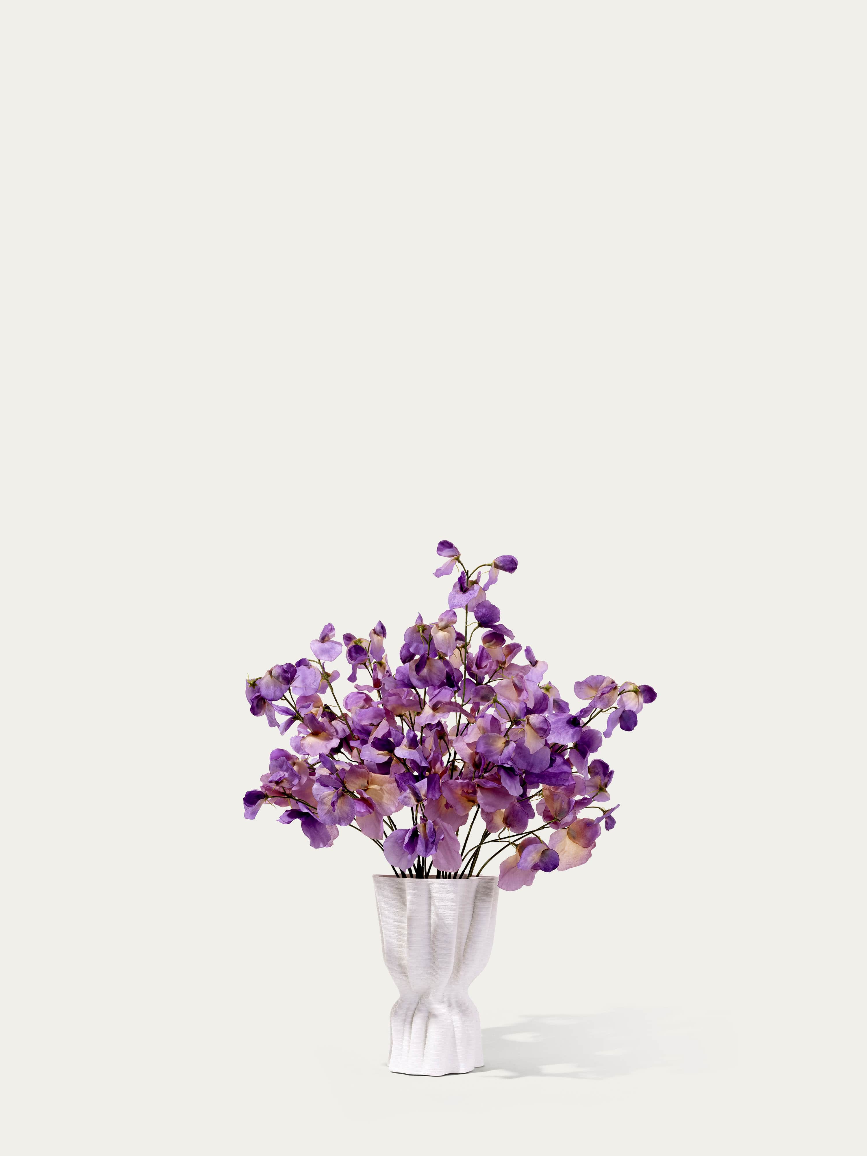 Elegant mono bouquet of silk lilac sweet pea in an organically shaped cream vase. The bouquet comes with our complementary floral scent.
