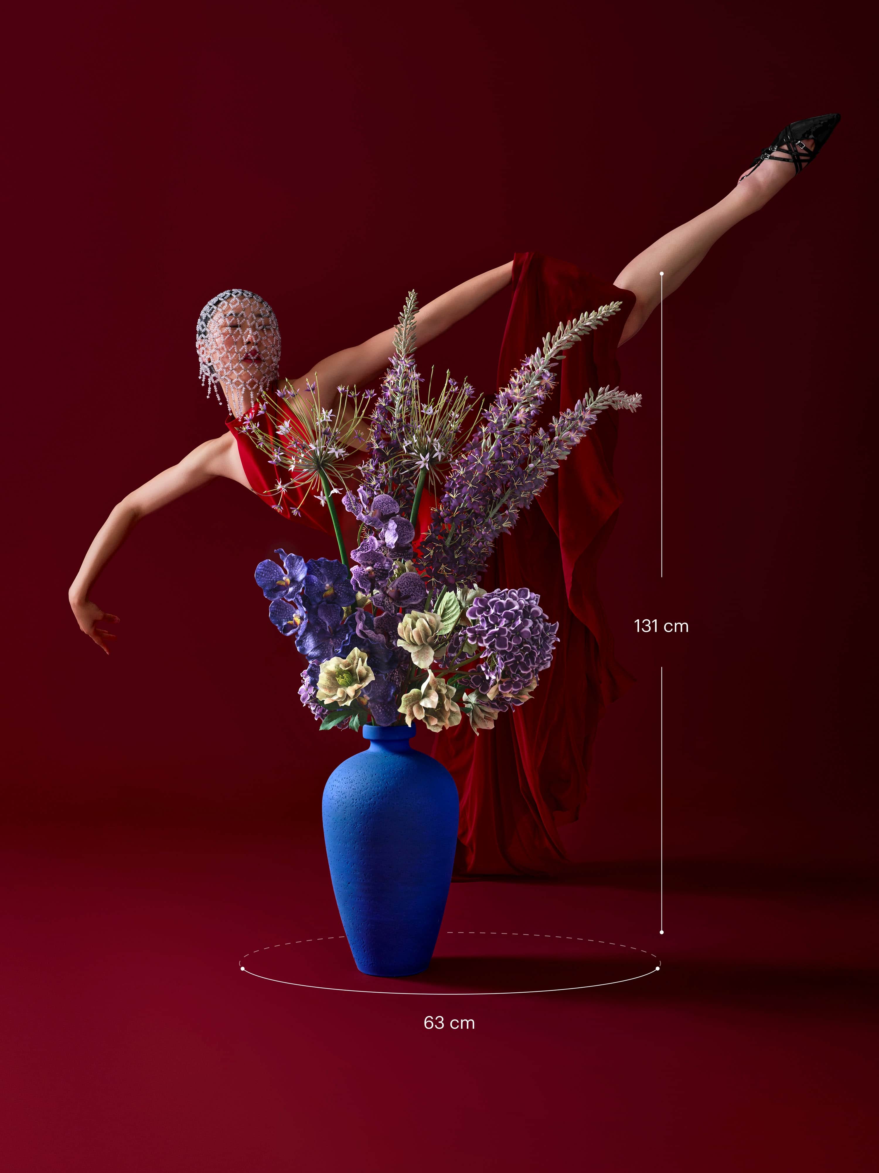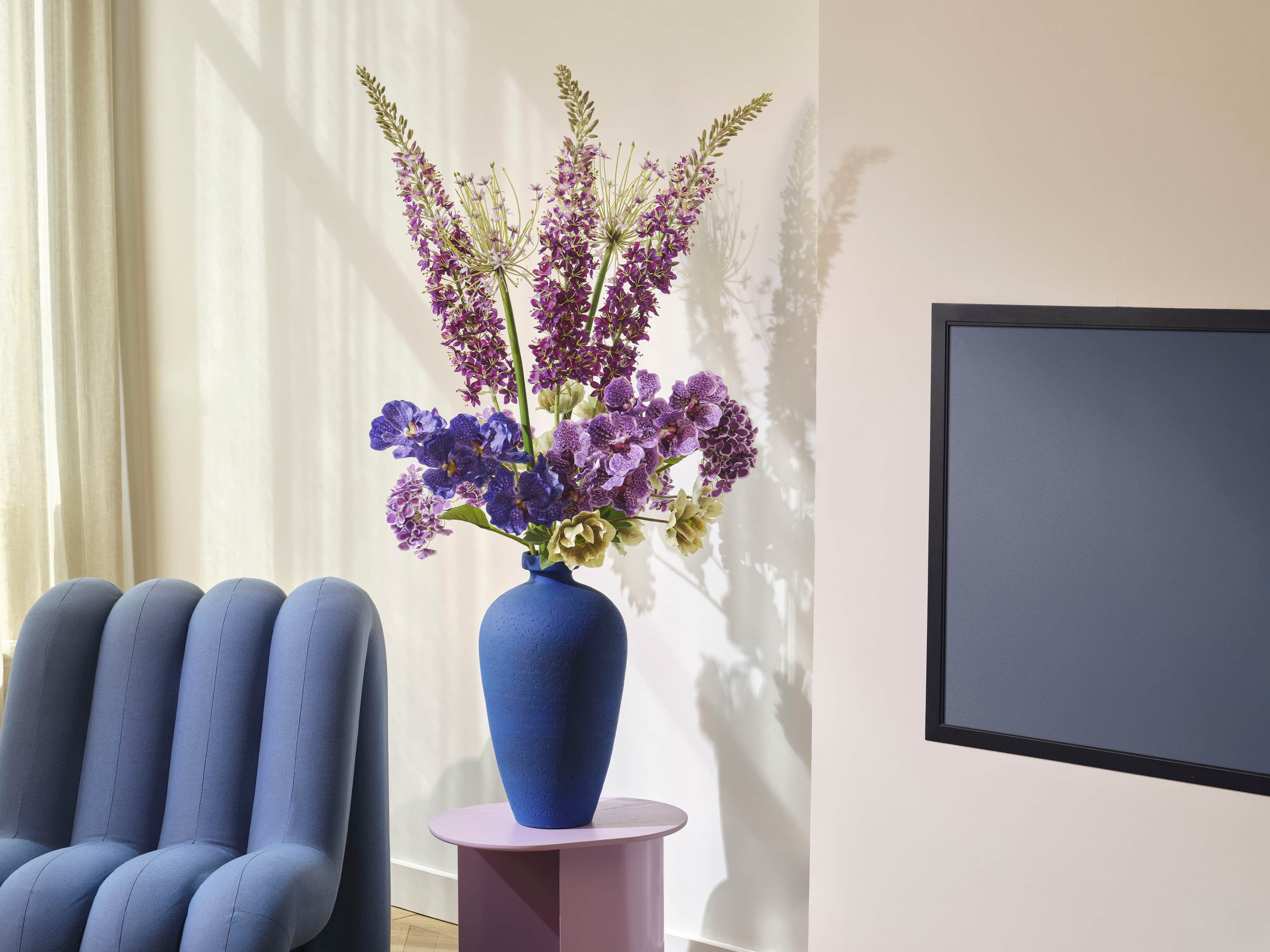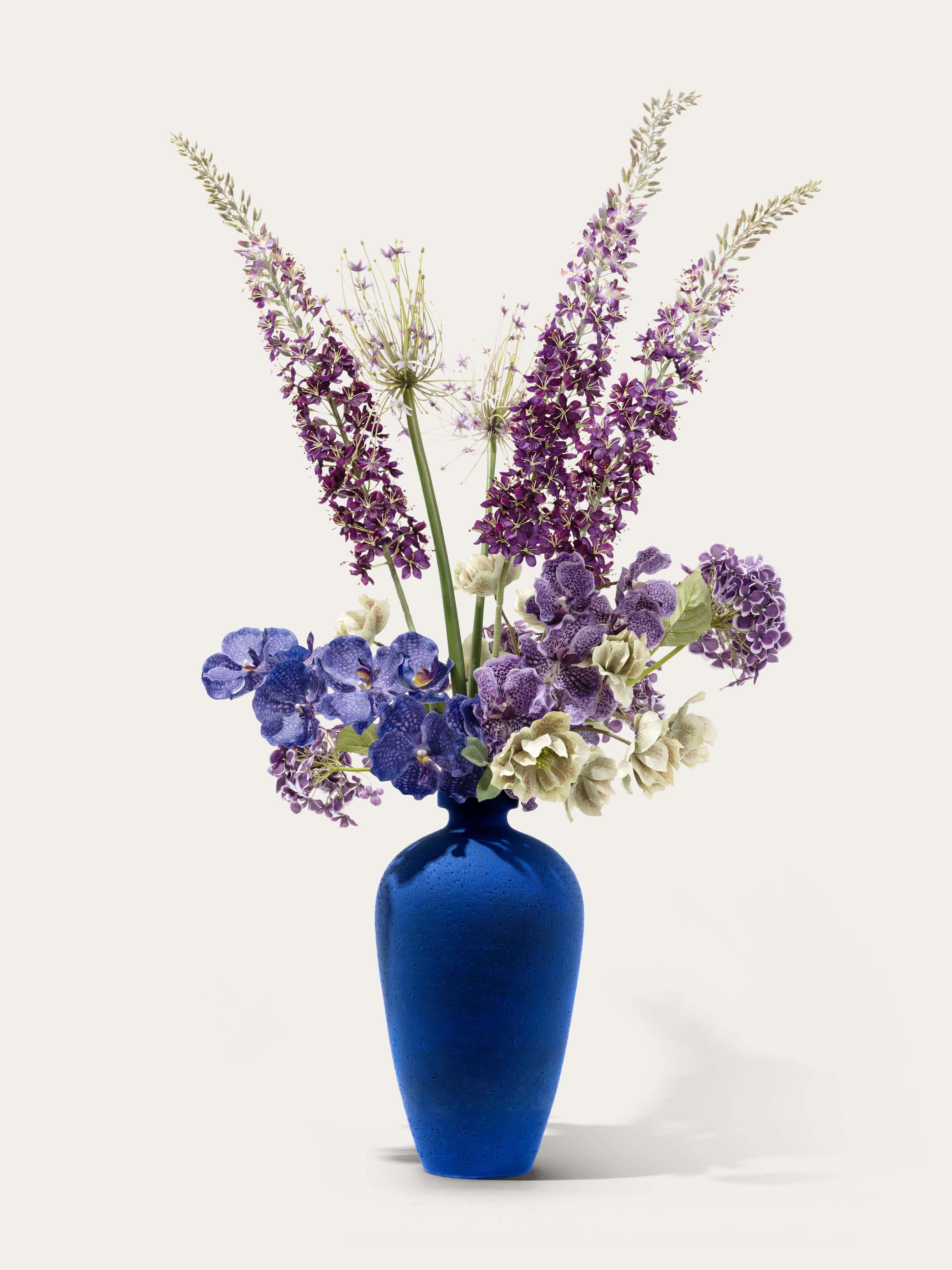 Large, bold bouquet with purple hydrangea, real-touch vanda, silk eremurus, allium and green hellebore in a large blue stone vase. The bouquet comes with our complementary floral scent.