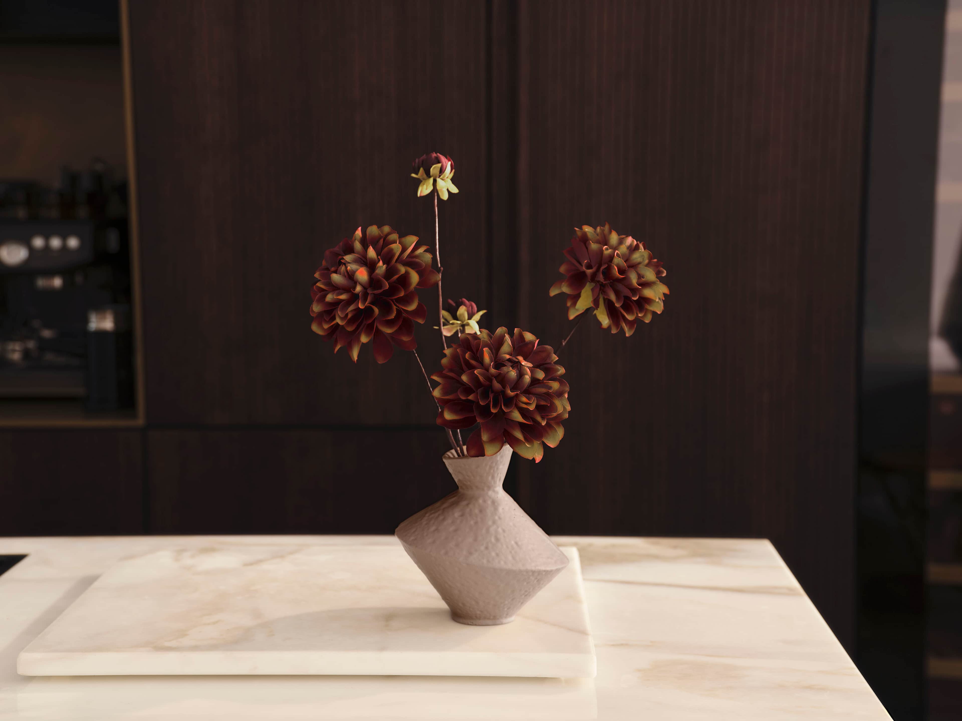 Three elegant silk dahlias in an organic beige vase. The bouquet comes with our complementary floral scent.