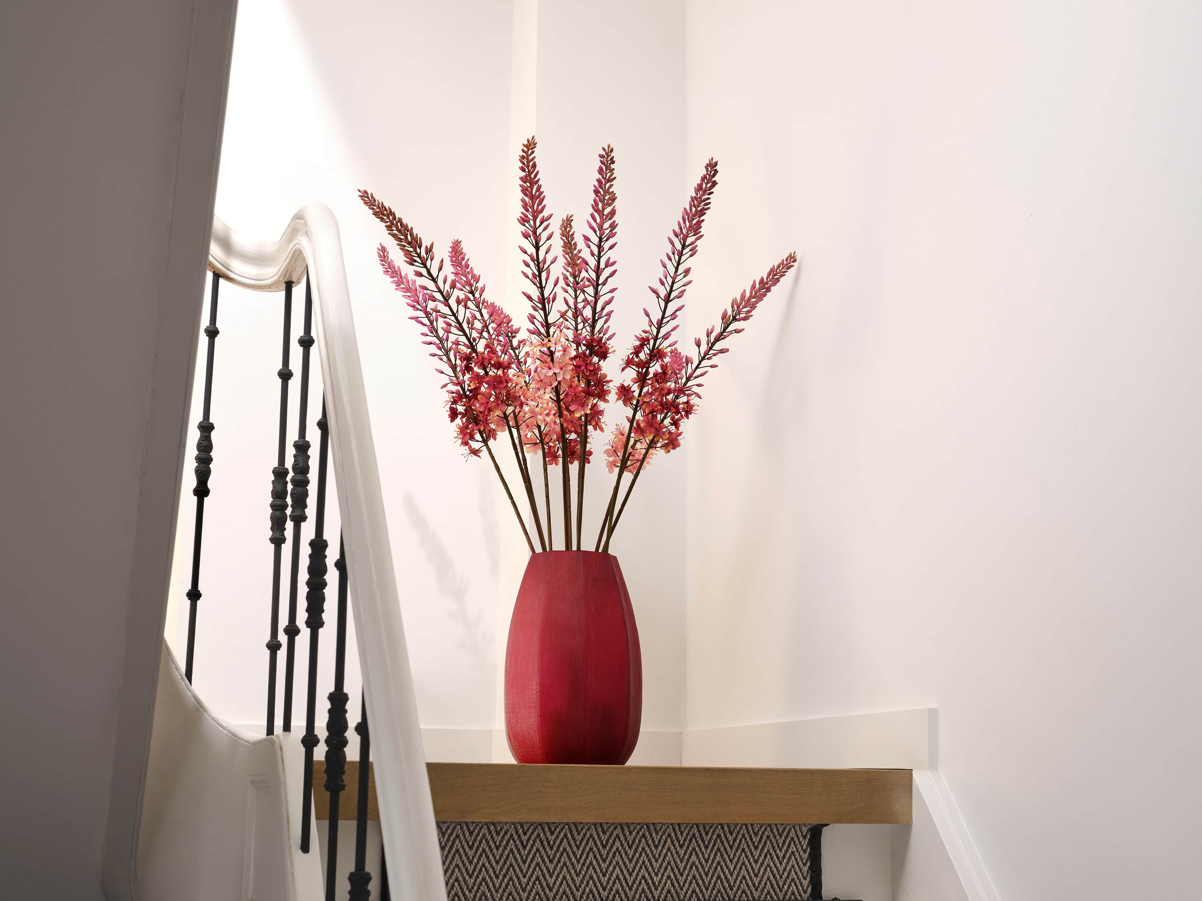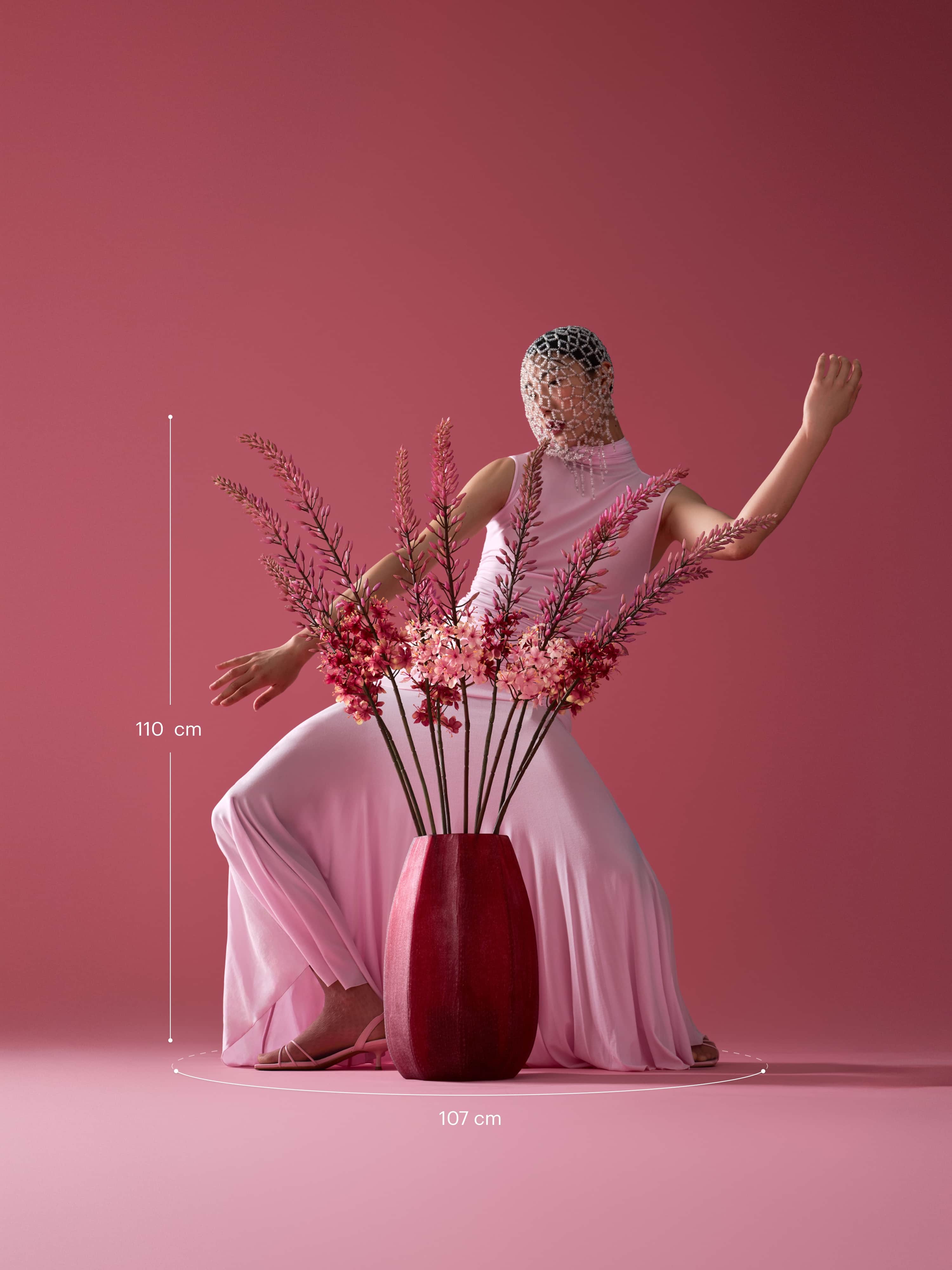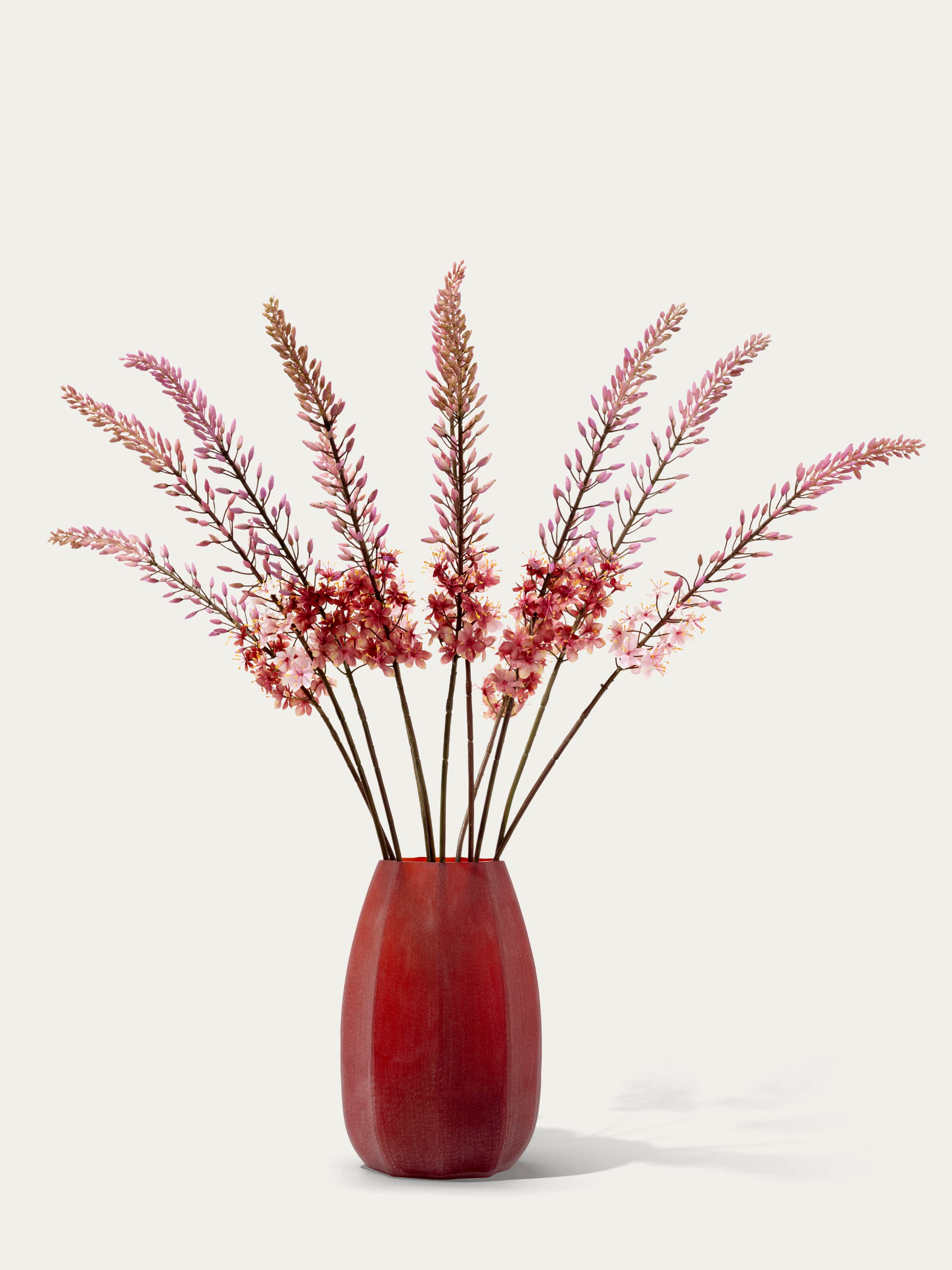 Mono bouquet of blush and burgundy silk eremurus in a stunning glass burgundy vase. The bouquet comes with our complementary floral scent.
