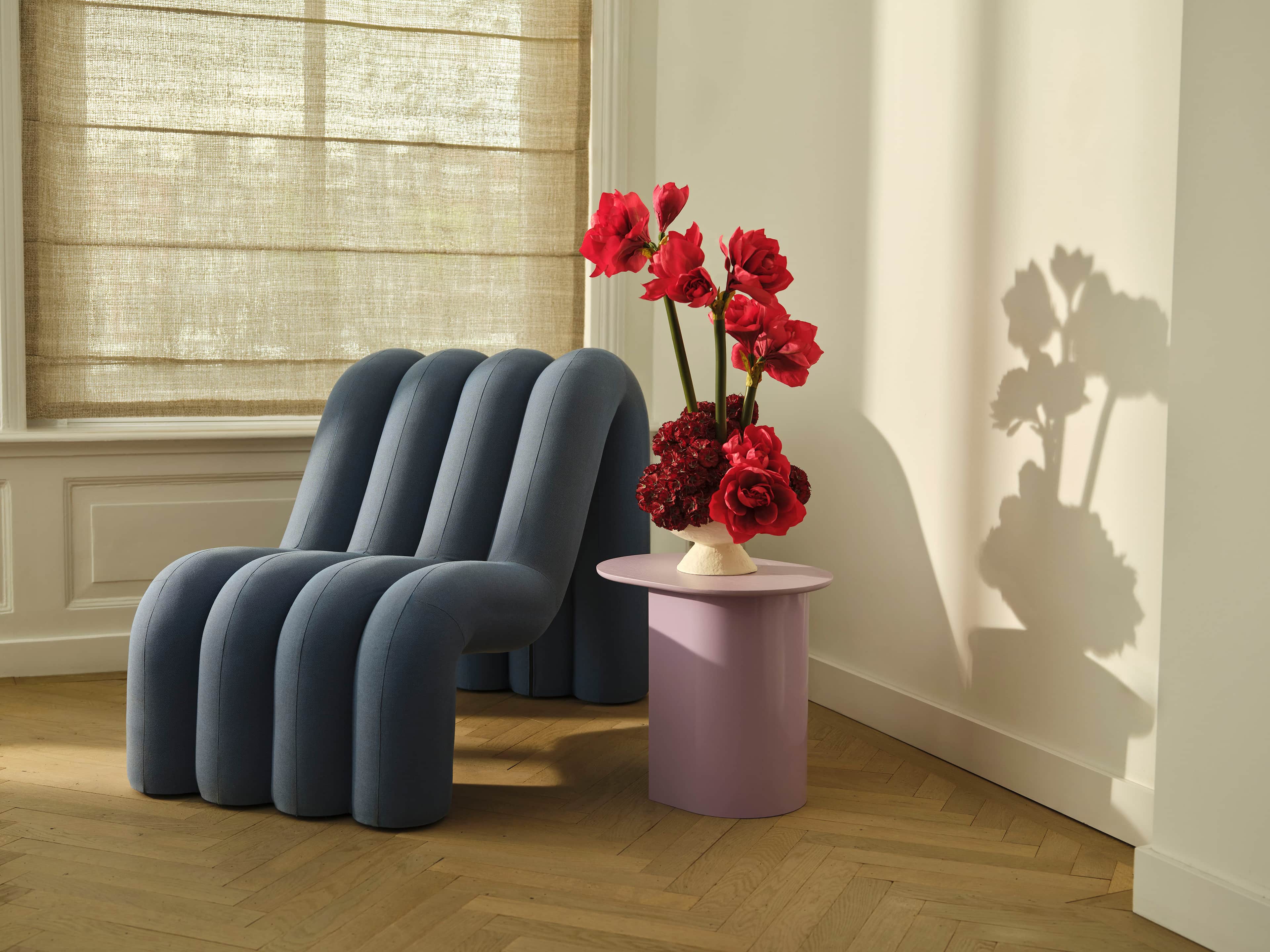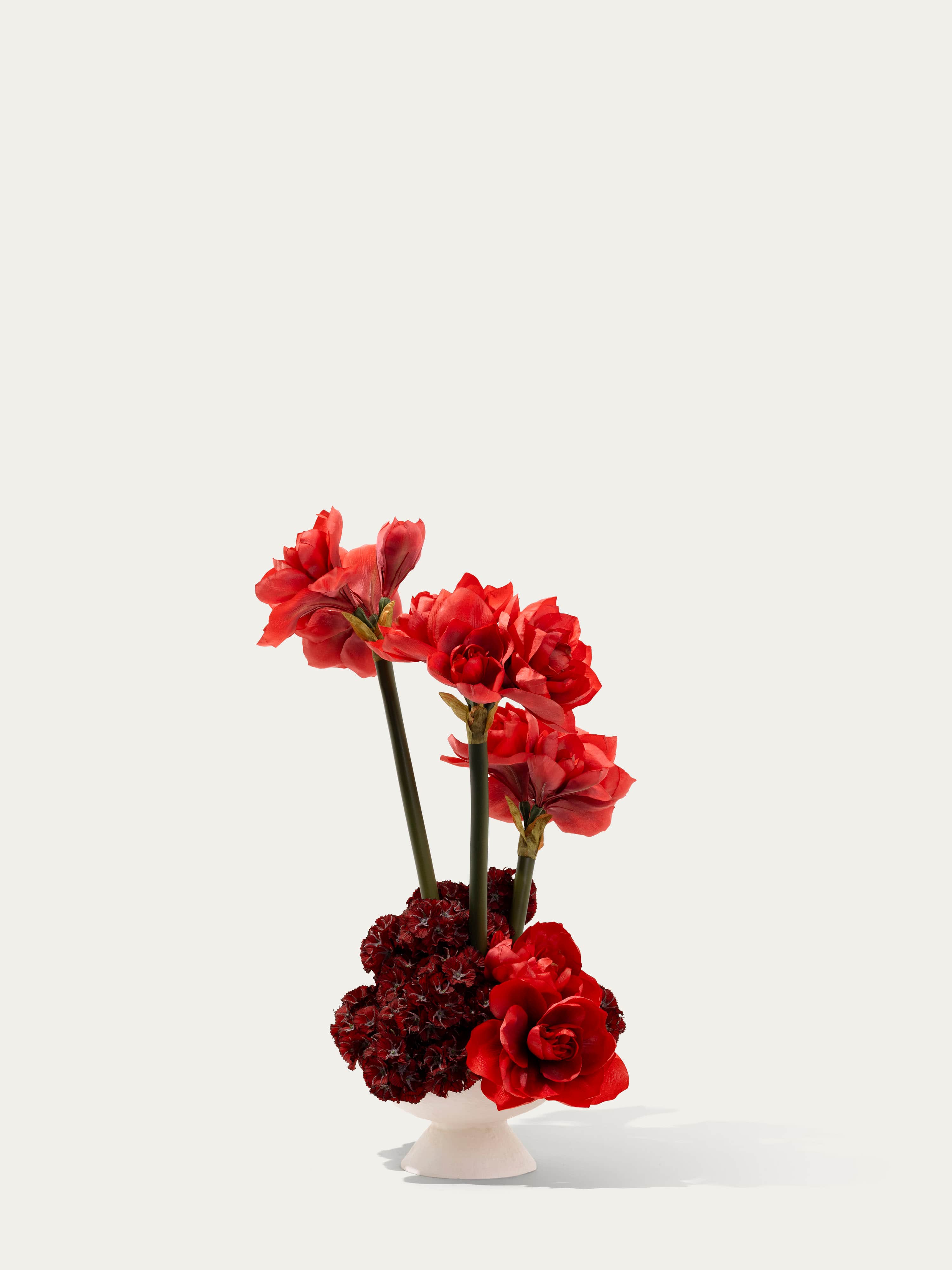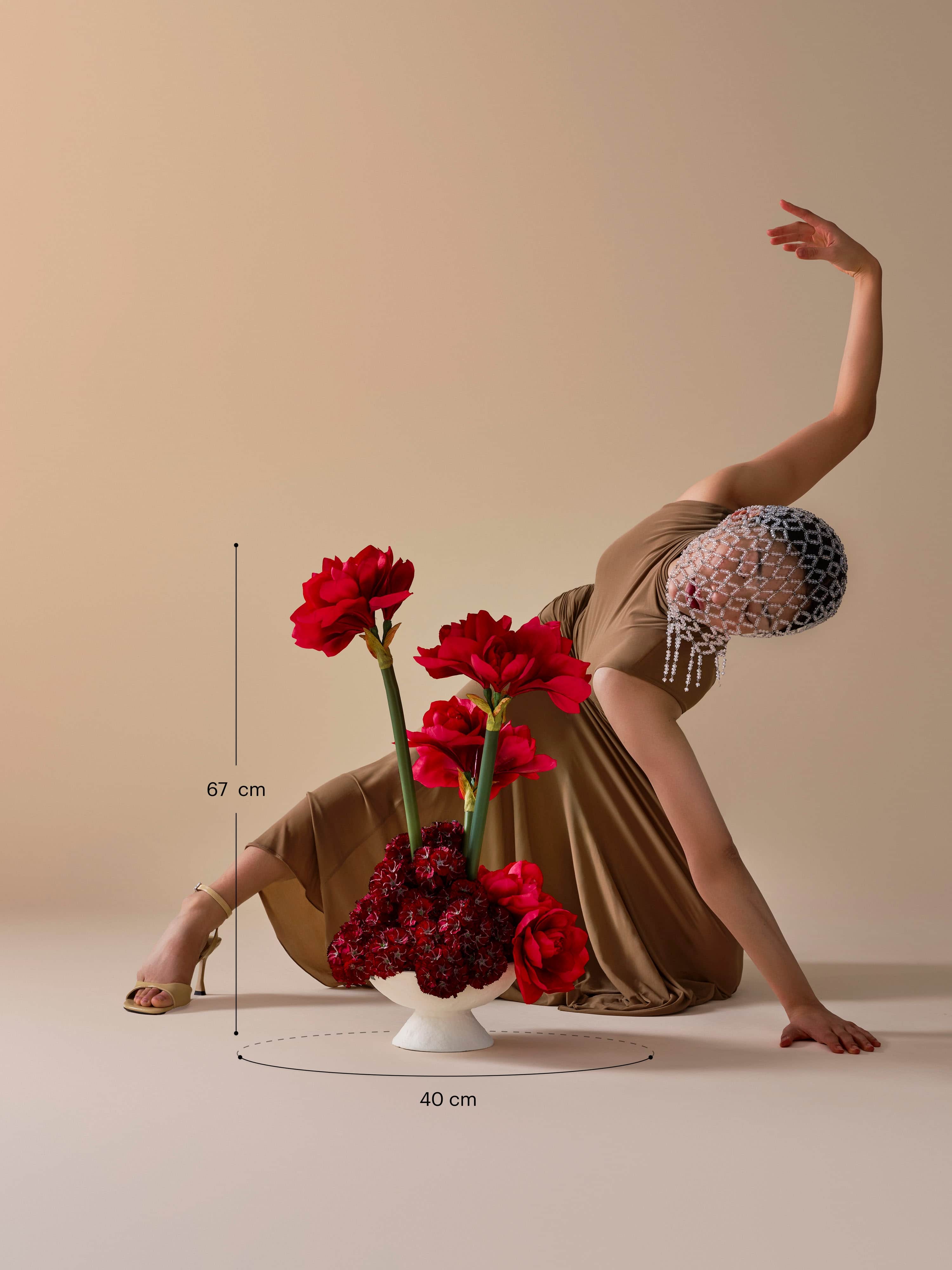 Elegant floral sculpture with red scabiosa and deep red silk amaryllis. The bouquet comes with our complementary floral scent.