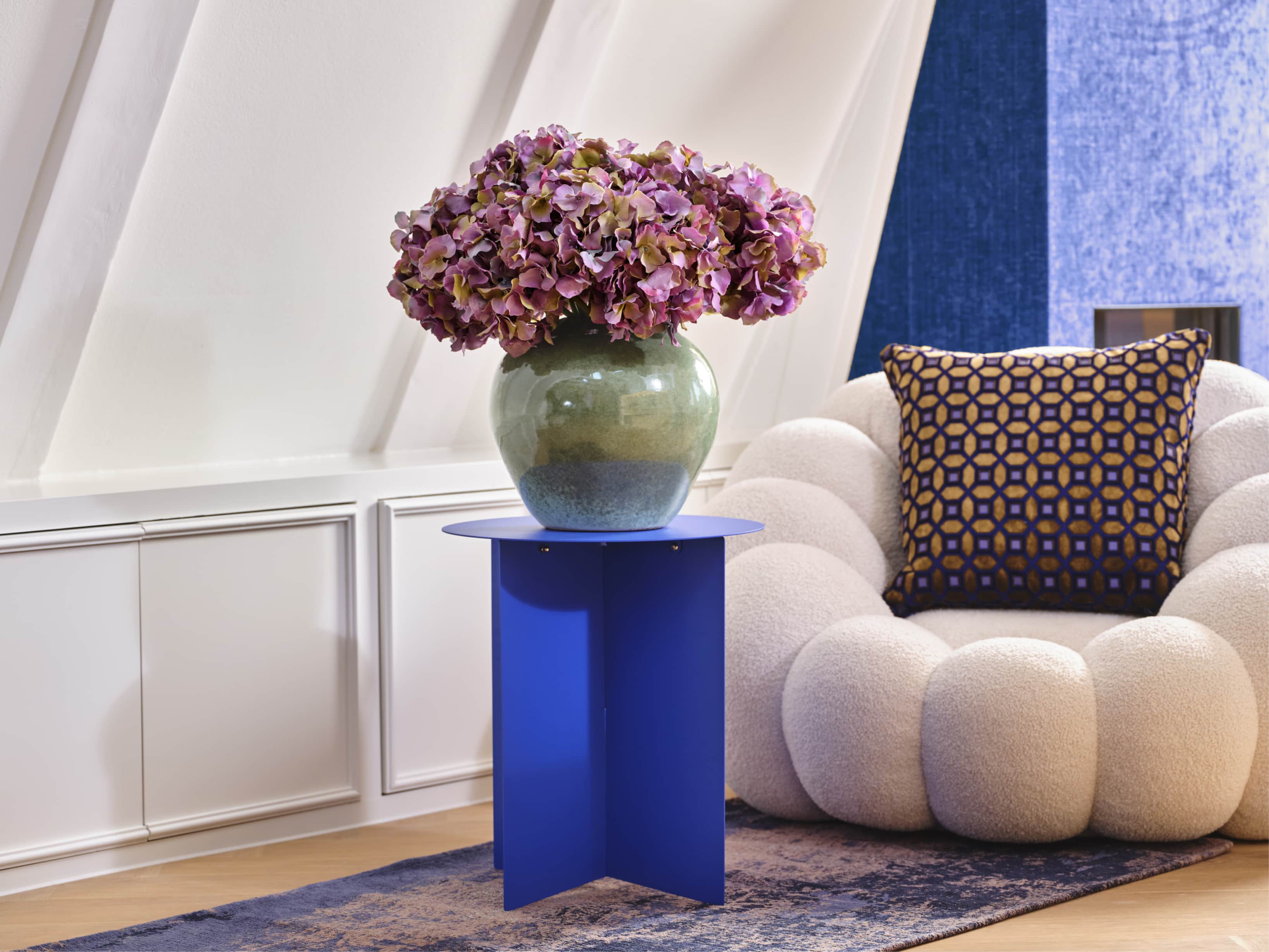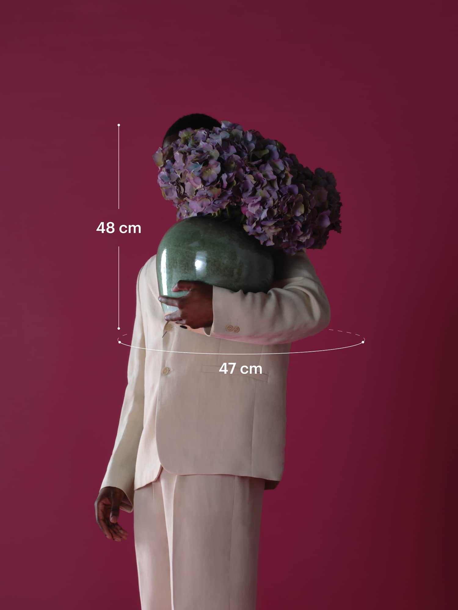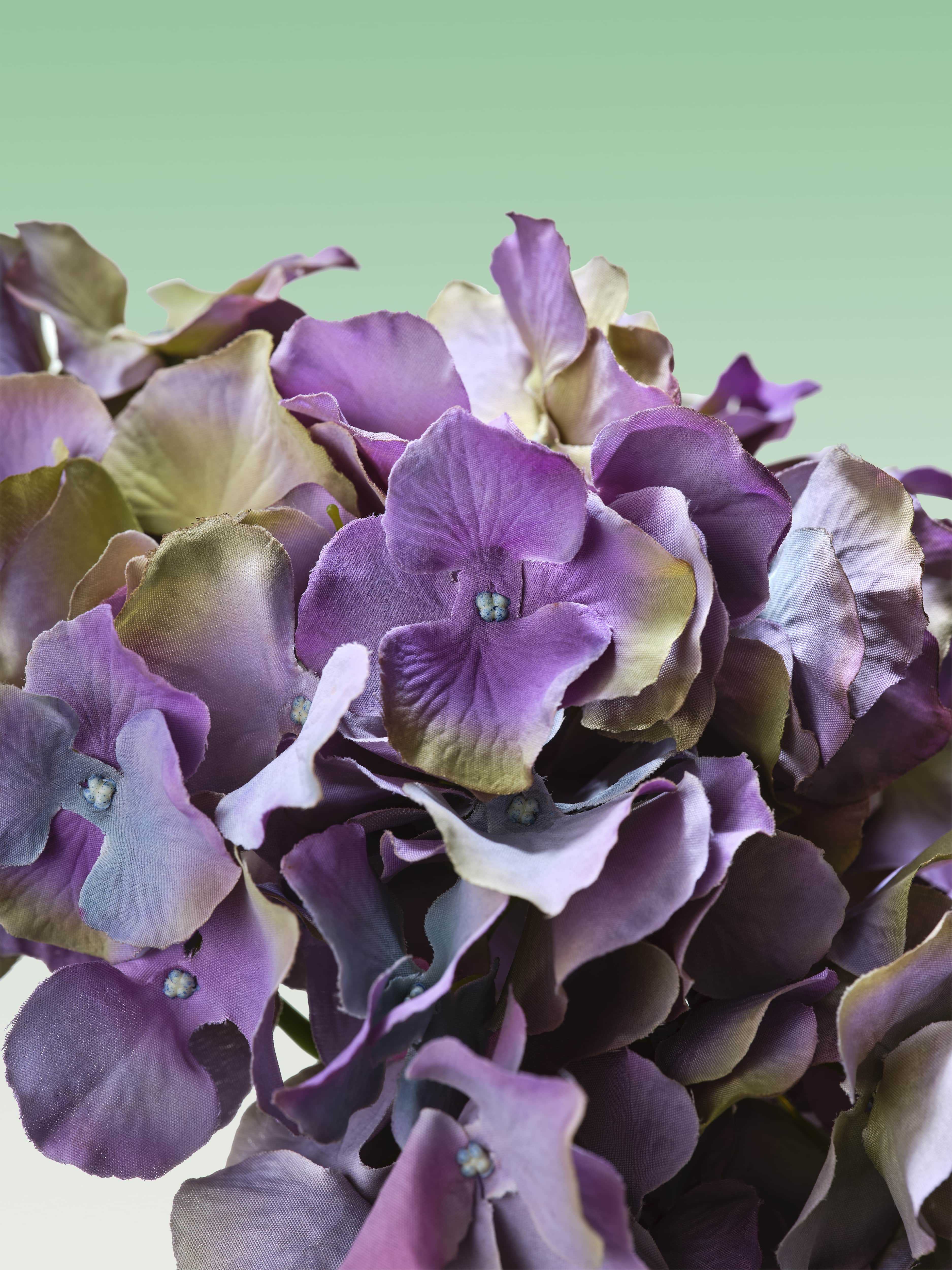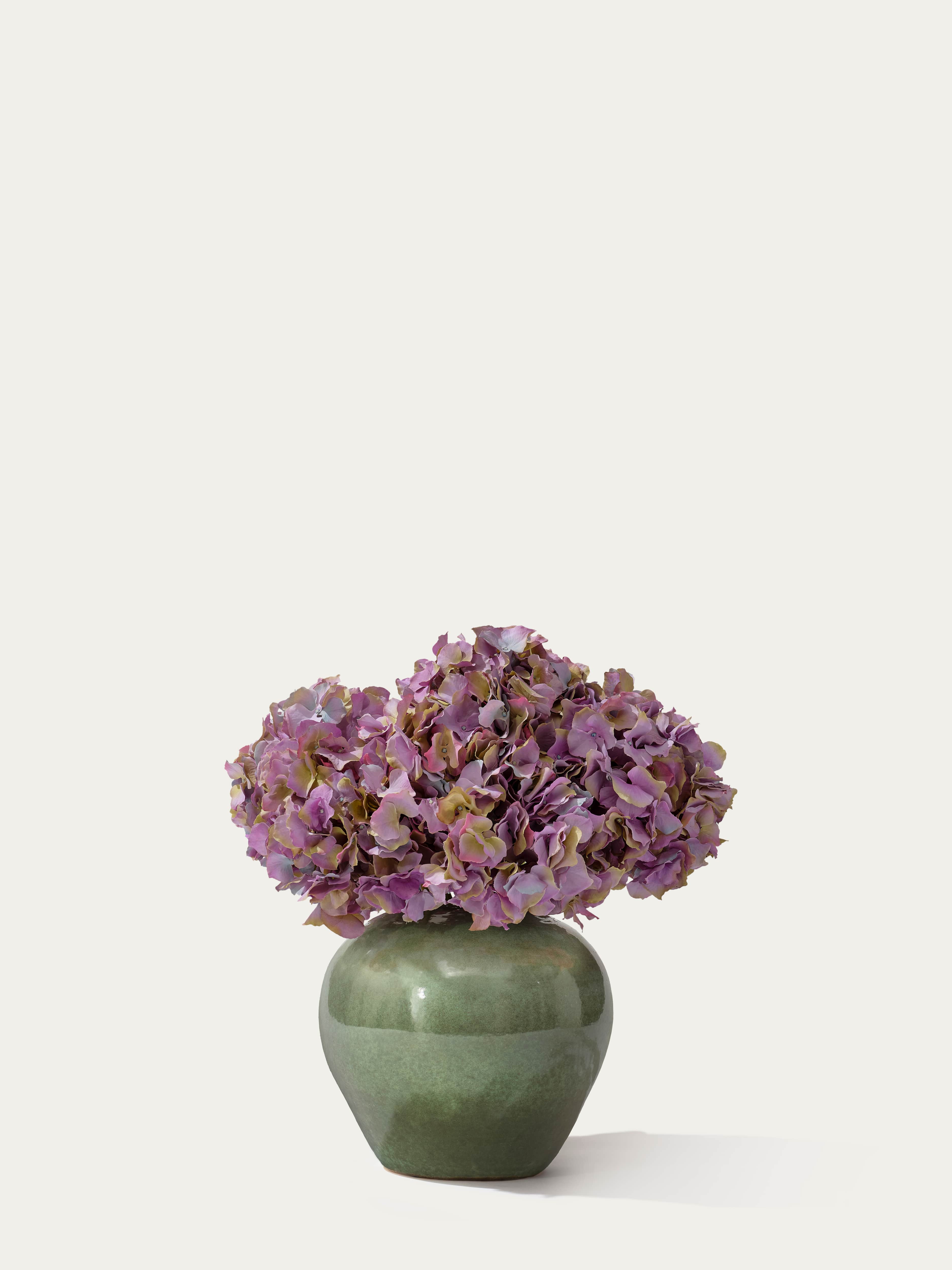 A mono bouquet with muted purple hydrangeas in a soft green bowl-shaped vase. Comes with our complementary floral scent.
