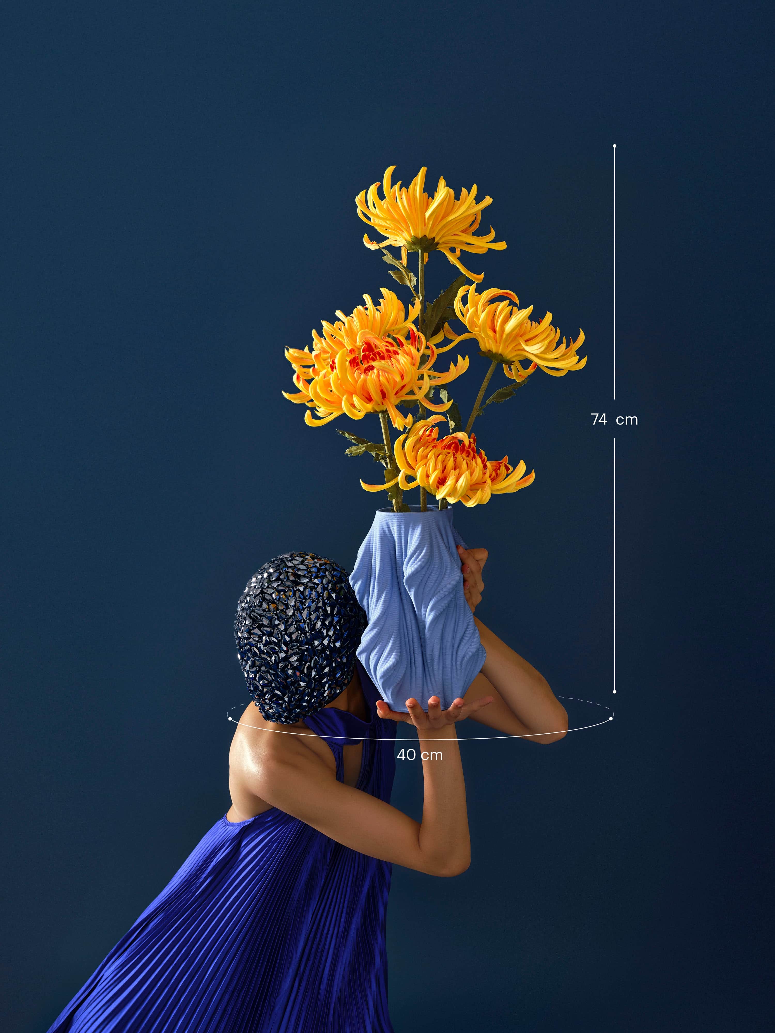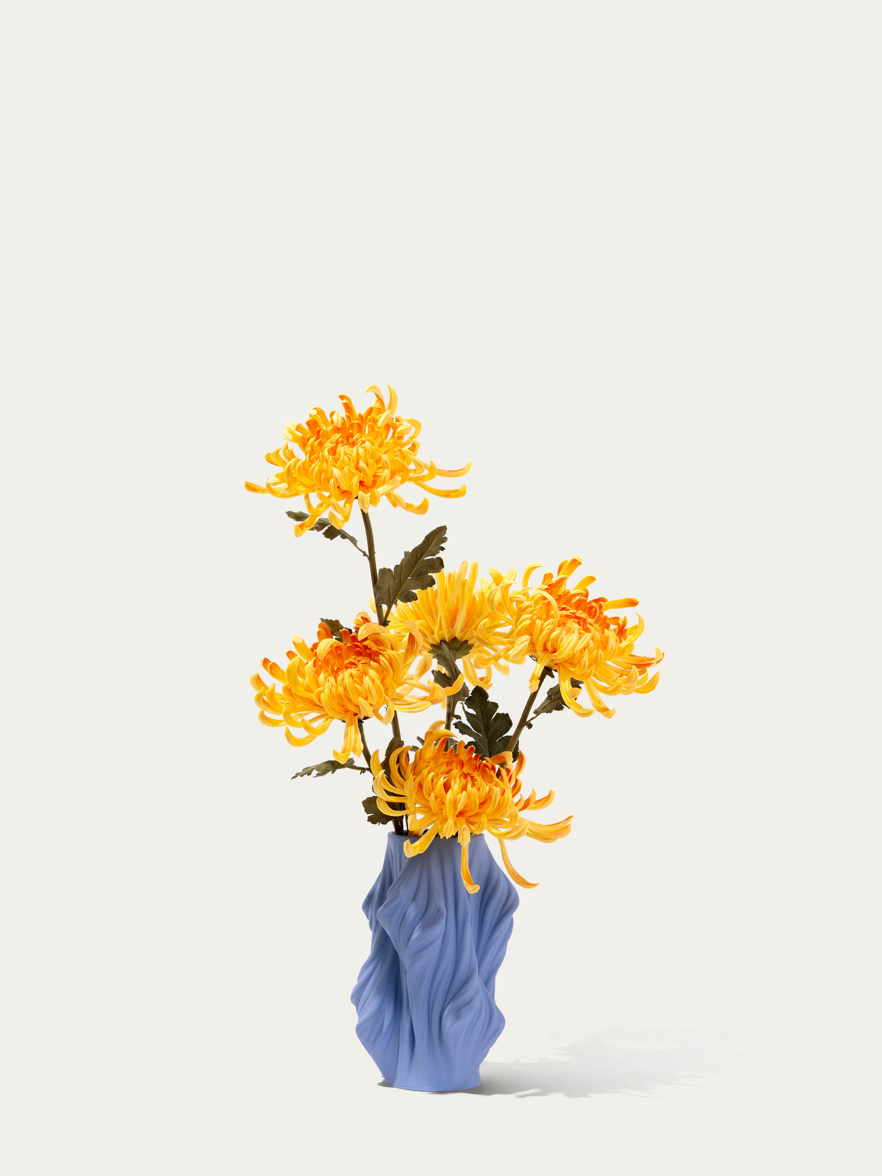 Bold mono bouquet of silk yellow chrysanthemums in a blue organically shaped vase. The bouquet comes with our complementary floral scent.