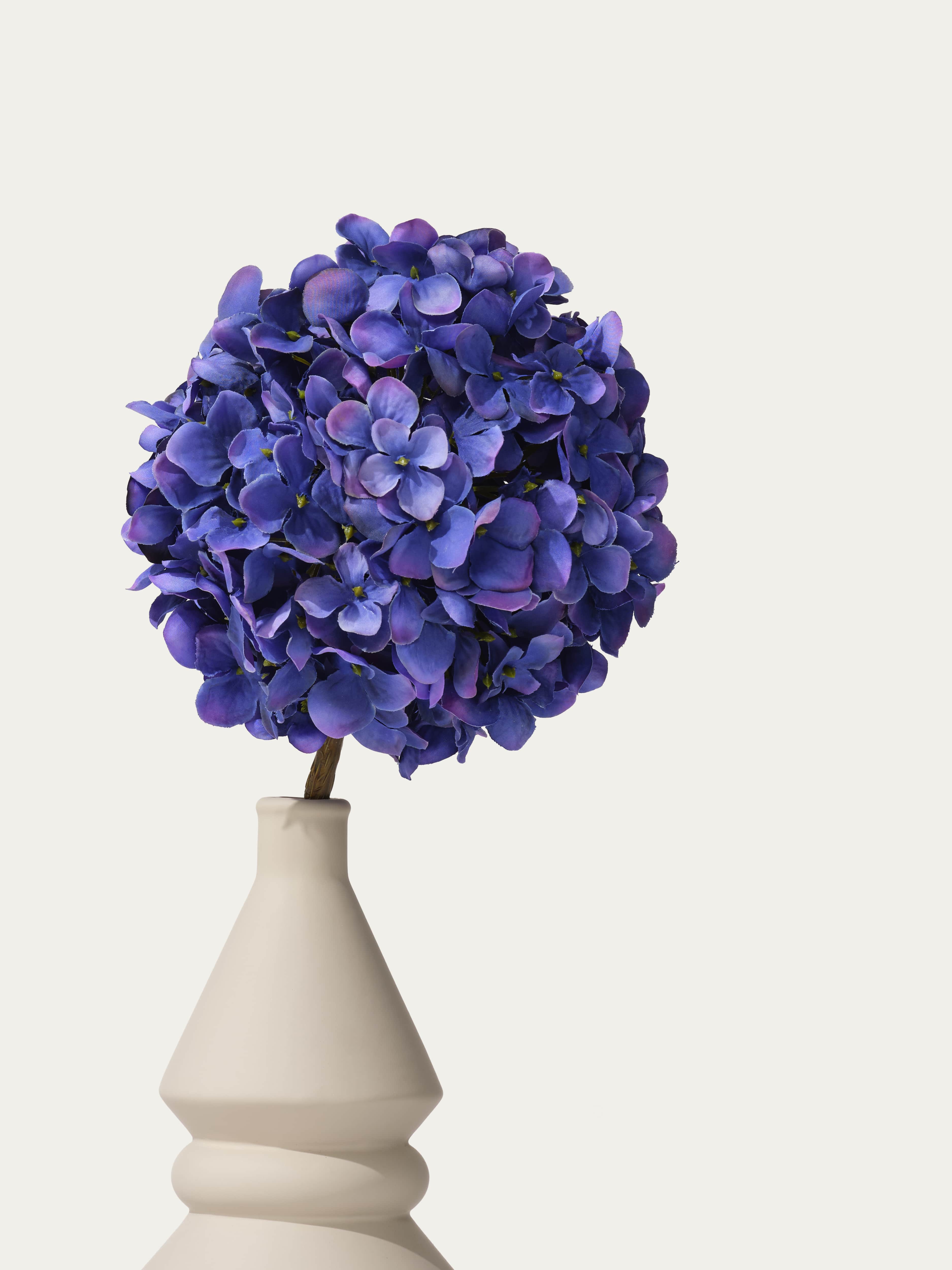 This striking deep blue hydrangea finds its home in a light beige modern vase with bold lines. Comes with our complementary floral scent.
