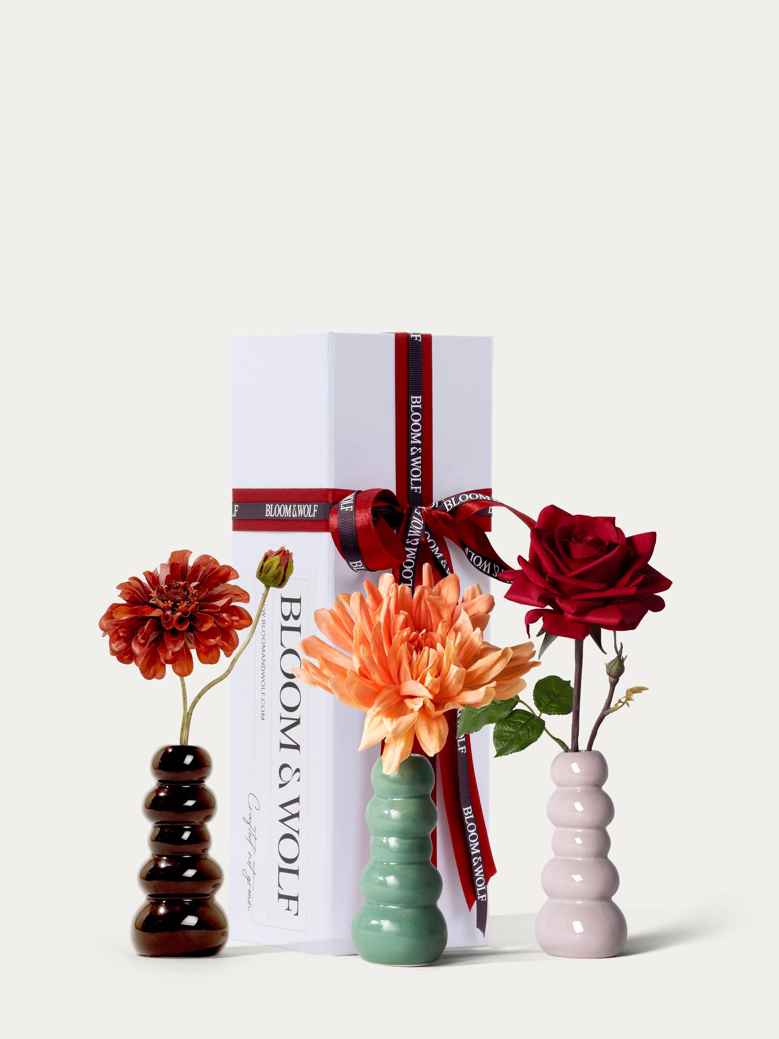 The highest quality silk flower bouquets can be found at Bloom & Wolf. We source only the finest flowers, and our bouquets and bouquet-vase combinations are arranged by our master florist.