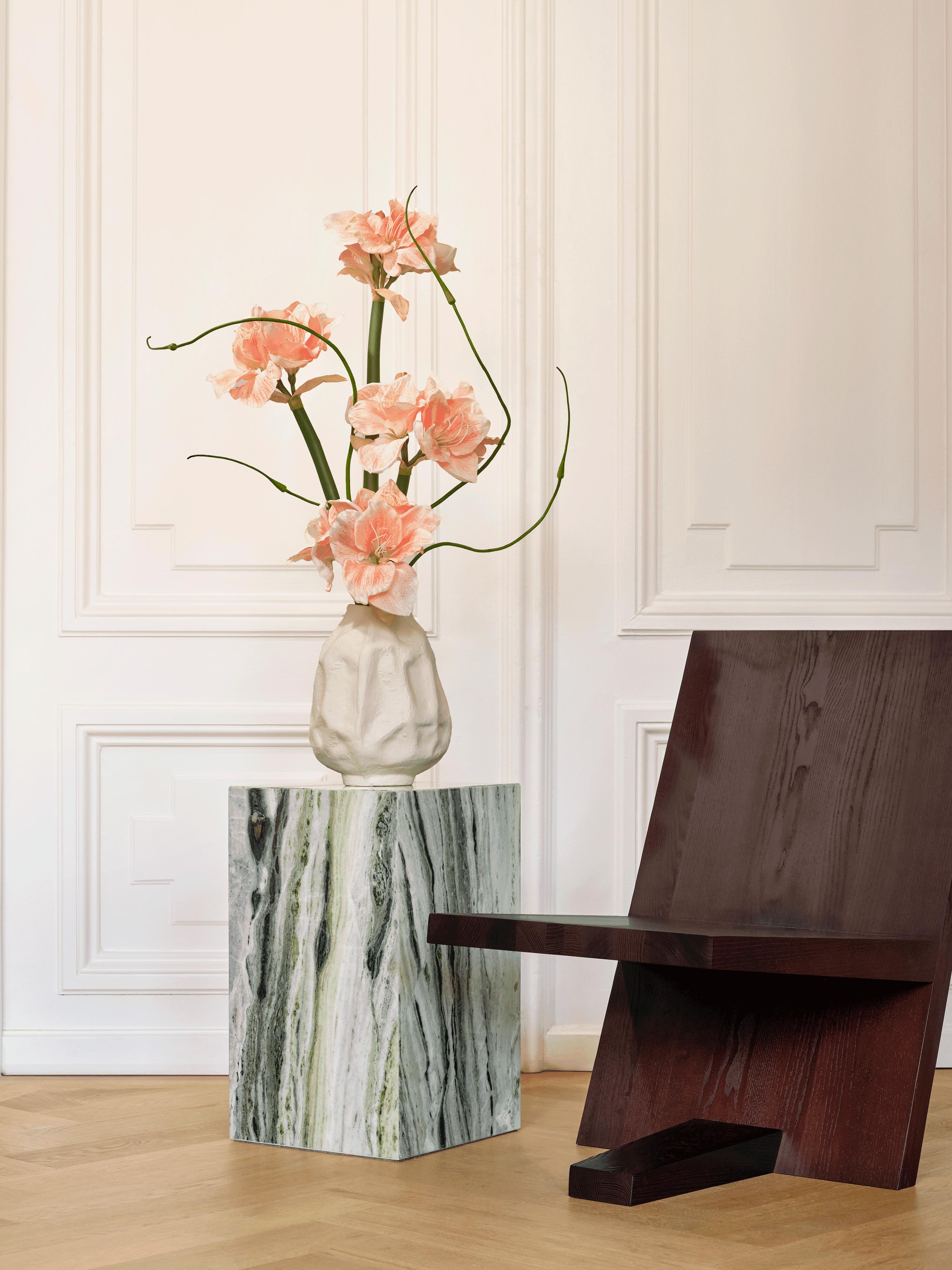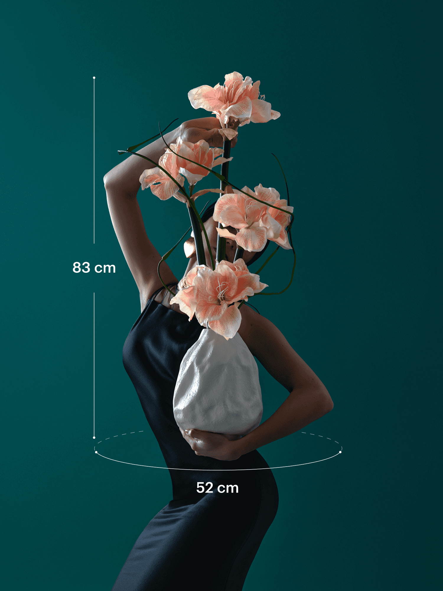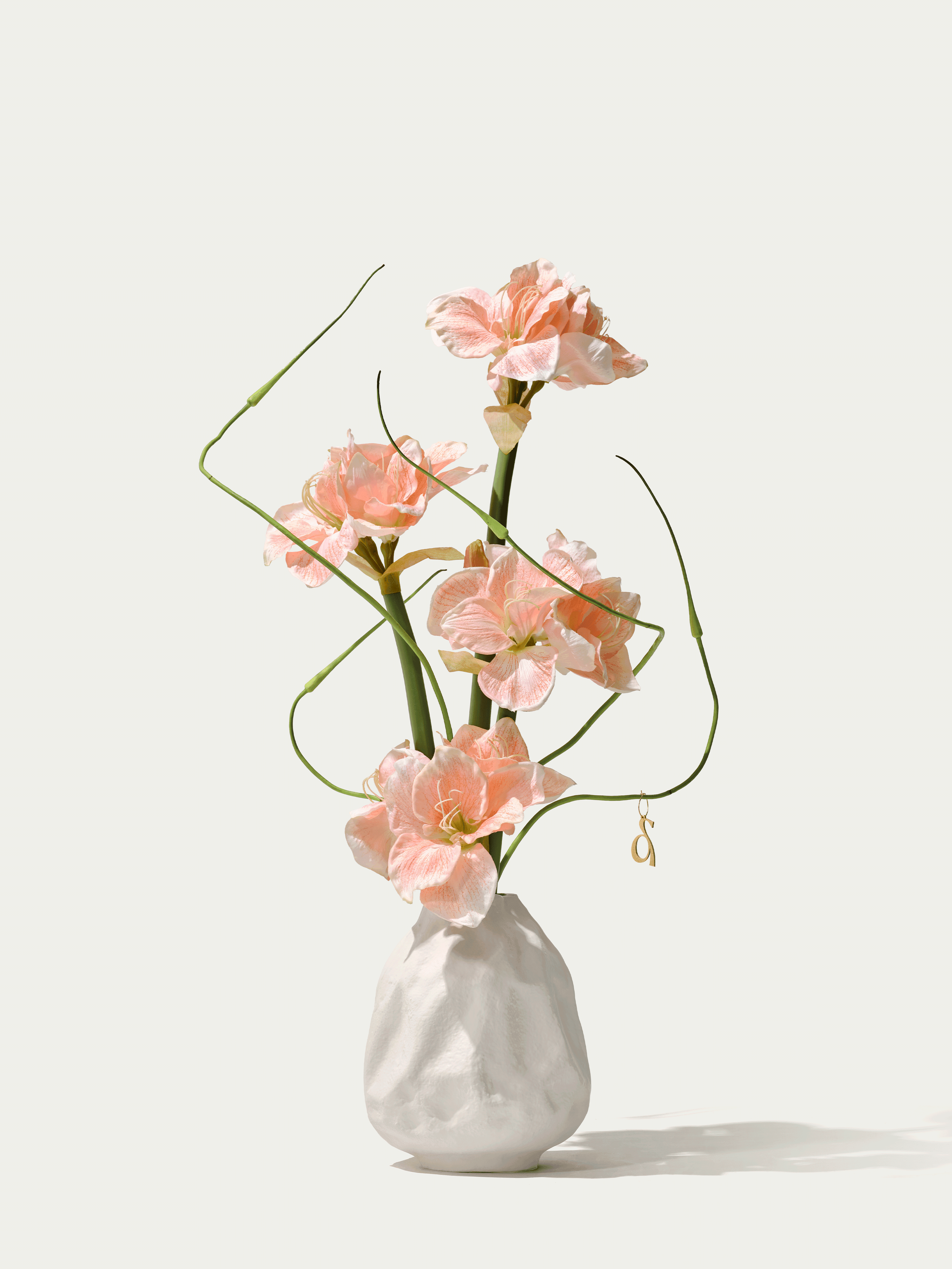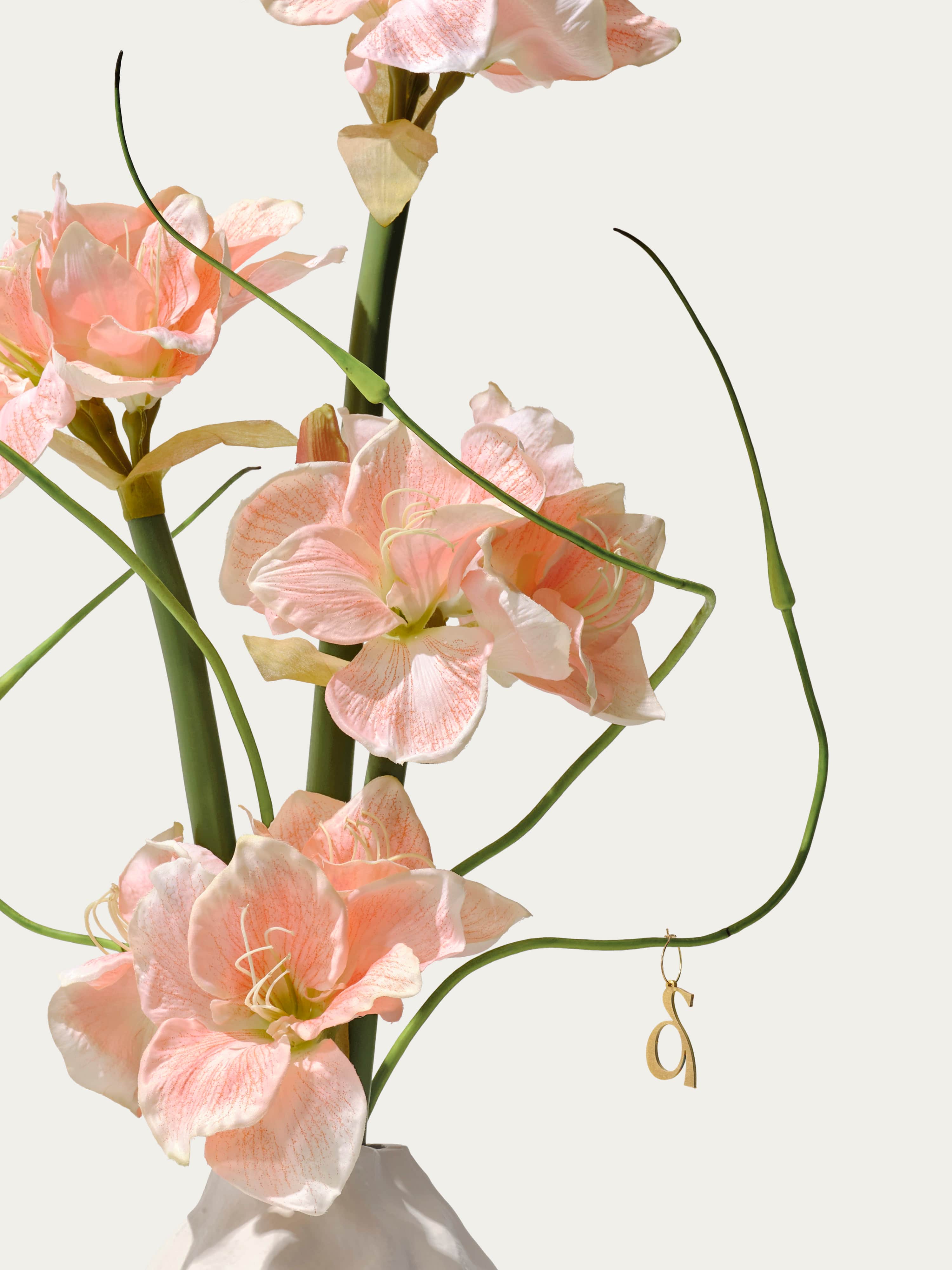 This soft yet bold bouquet of salmon amaryllis and delicate Japanese garlic blends seamlessly with the organically shaped vase. The bouquet comes with our complementary floral scent.