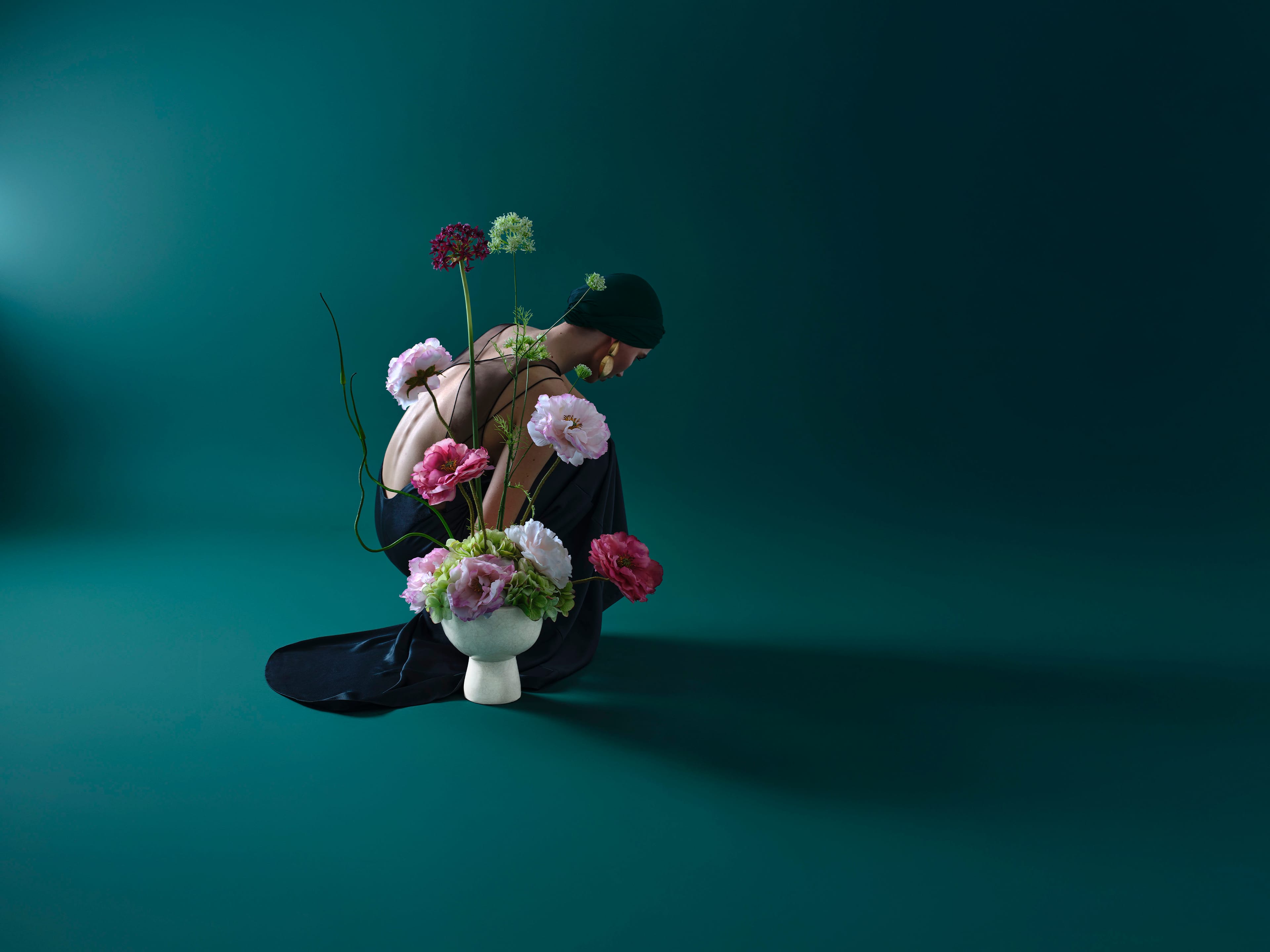 Une sculpture unique et enchanteresse composée de coquelicots roses à toucher réel, d'hortensias, d'alliums de couleur prune et d'ail japonais.