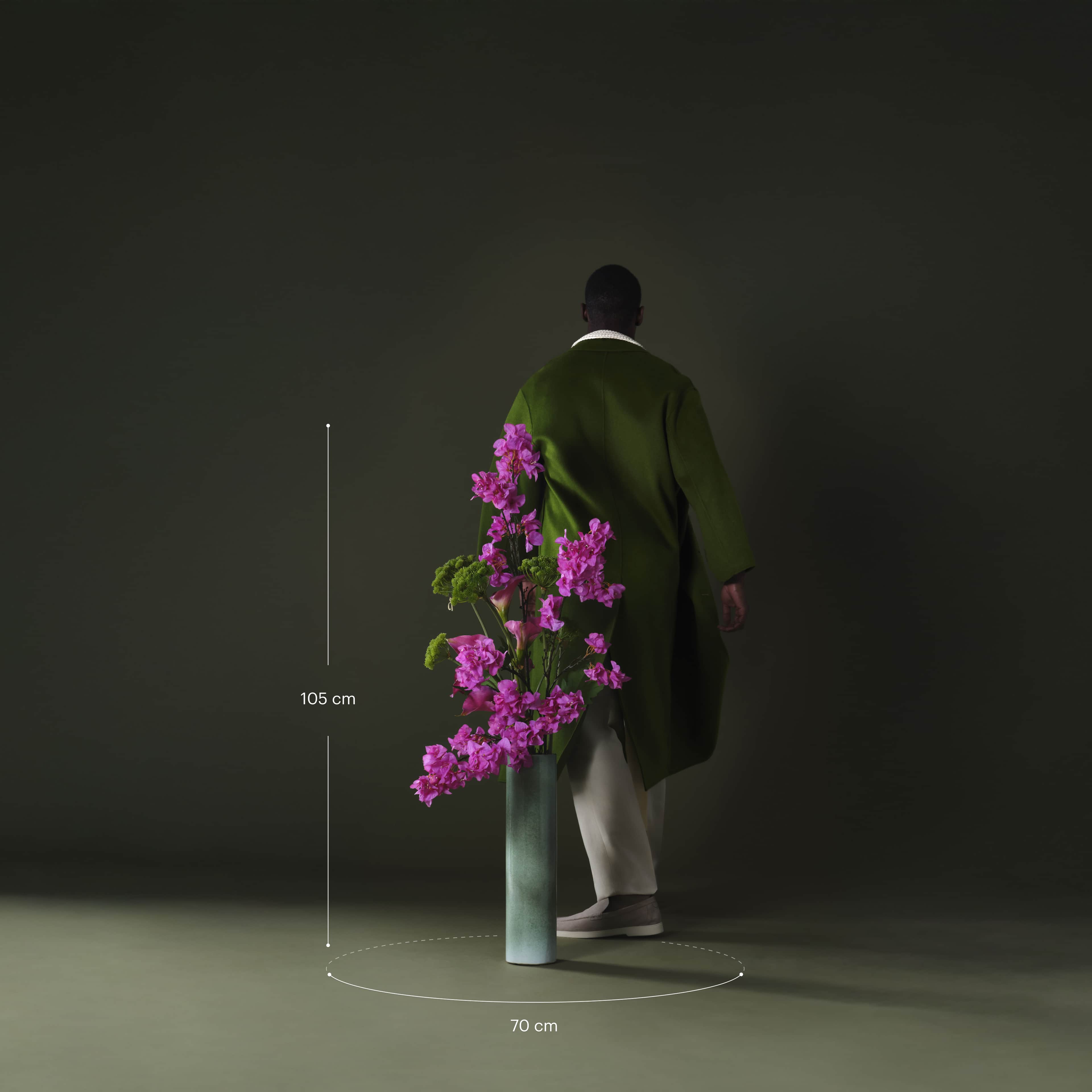 Bougainvilliers roses, lys calla et angélique sauvage dans un vase vert élégant. Ce bouquet est livré avec notre parfum de fleurs gratuit.