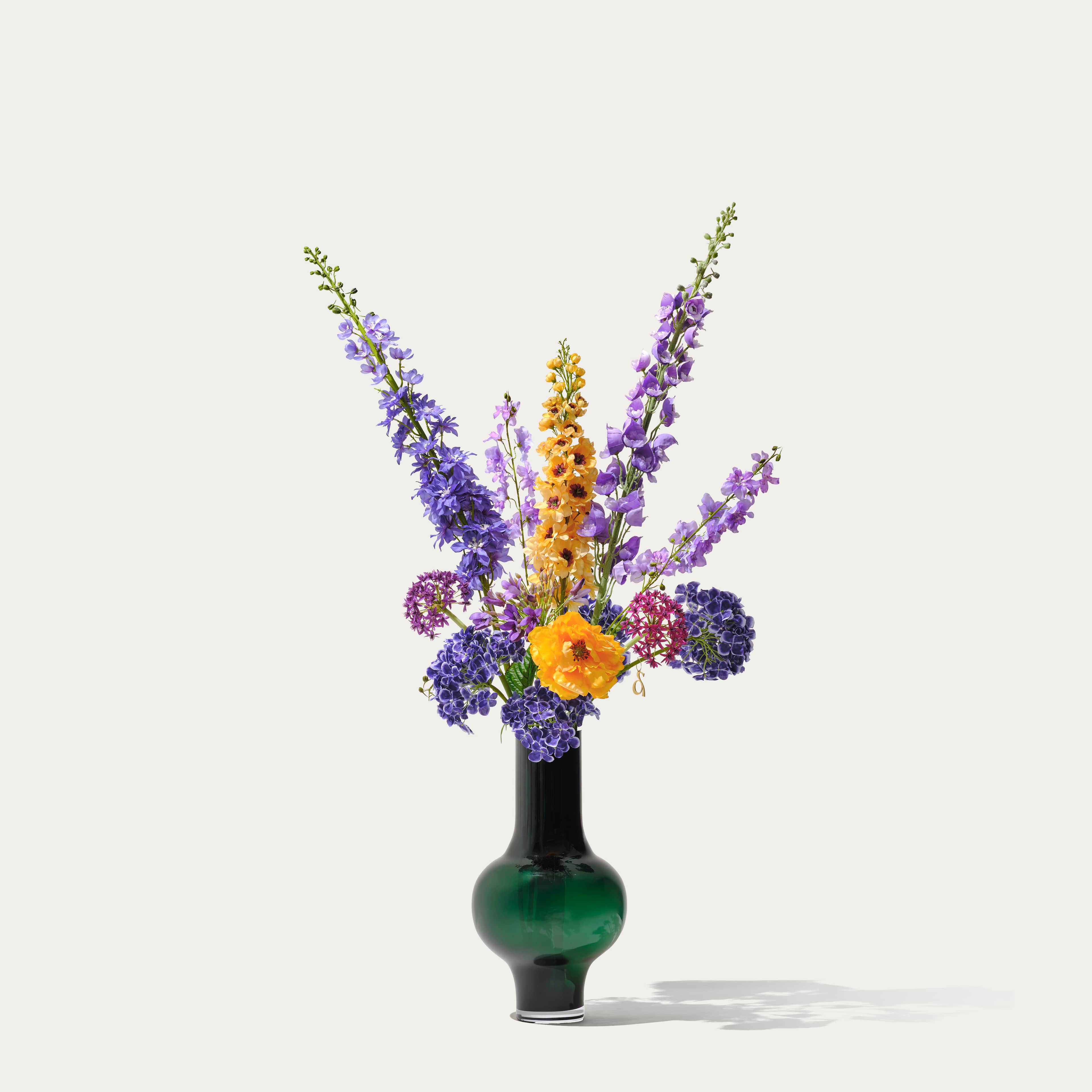 Un bouquet coloré mais équilibré de delphiniums, d'hortensias, d'alliums et de coquelicots d'un jaune profond. Ce bouquet est accompagné de notre parfum de fleurs gratuit.