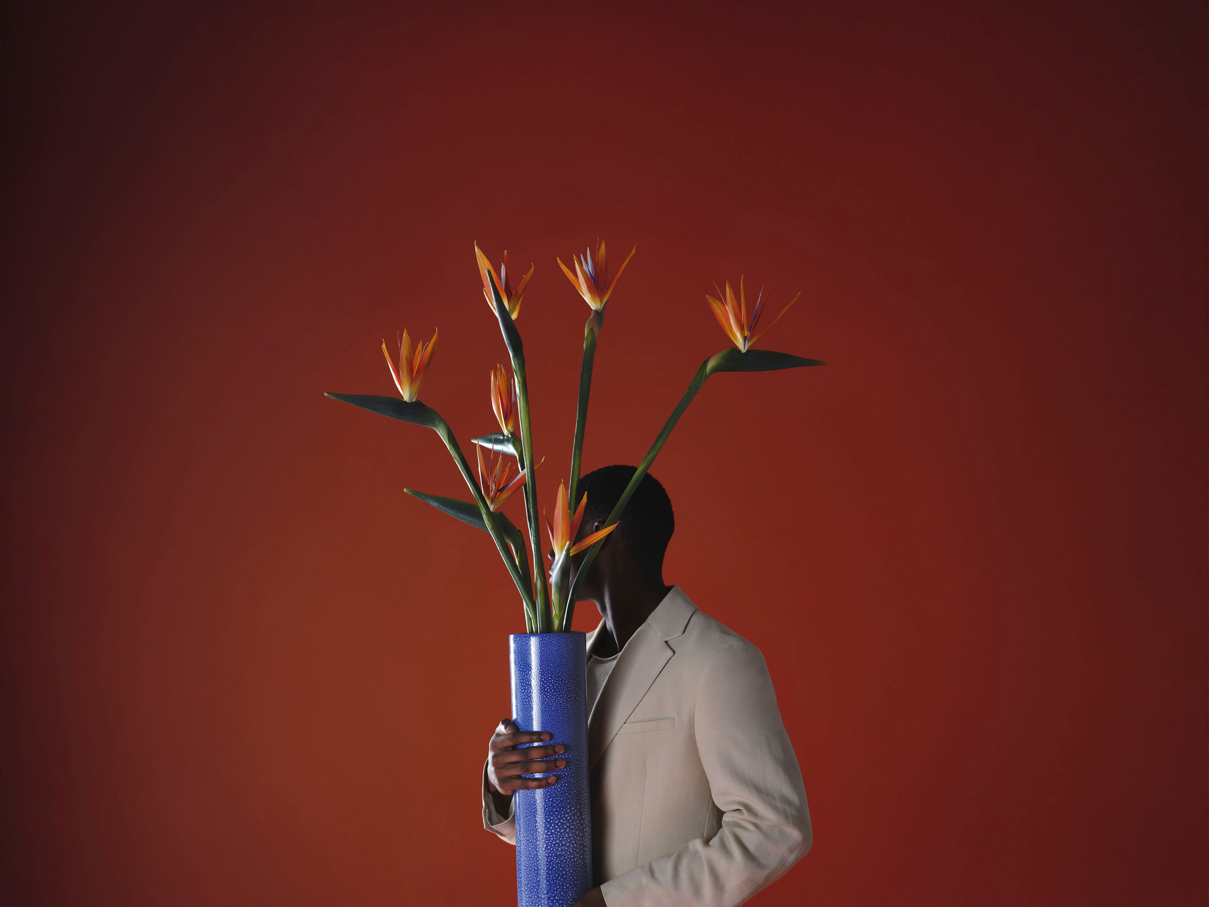 Un mélange géométrique de fleurs d'oiseaux de paradis dans un vase bleu élégant.