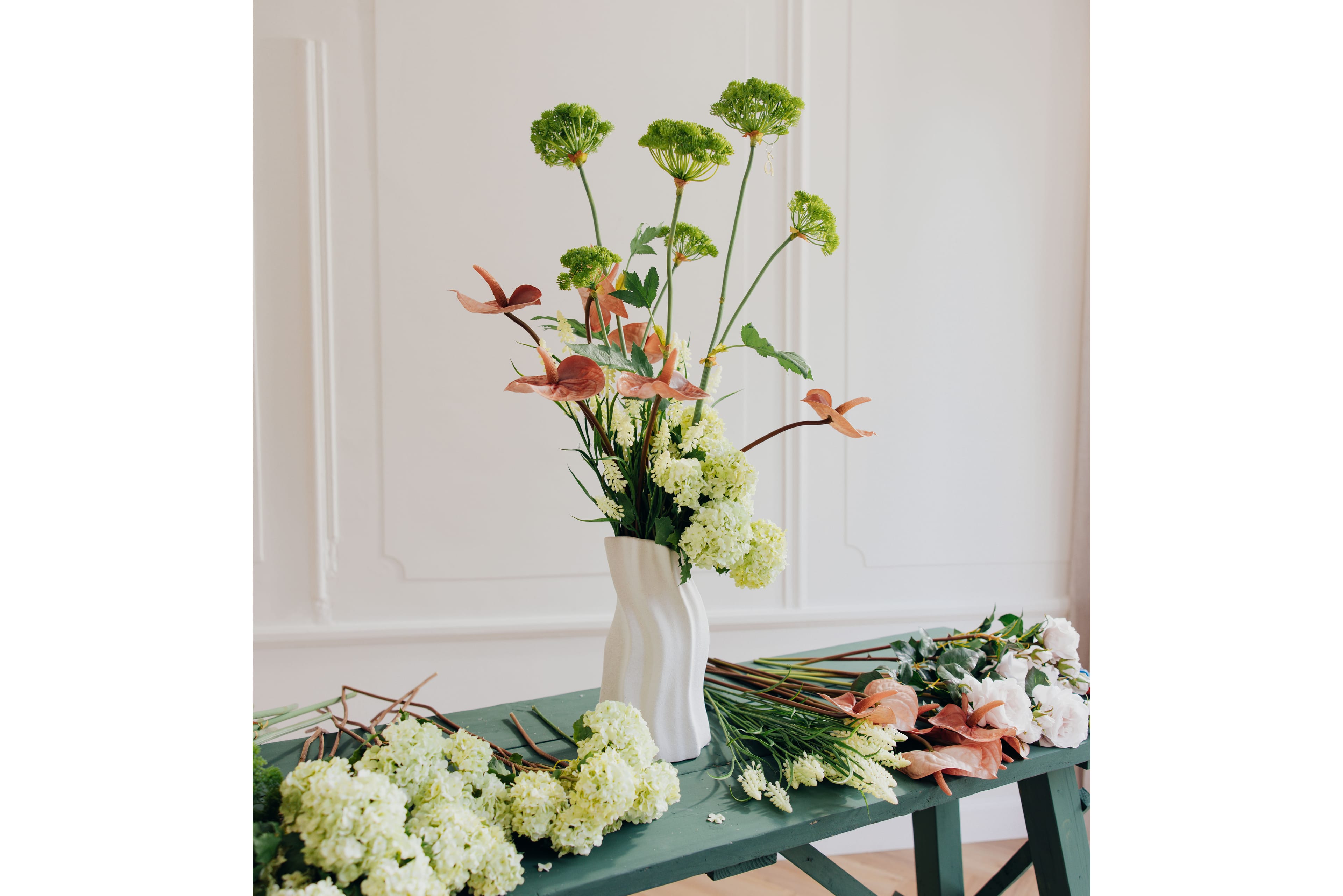 Breng een beetje Miluska in je interieur! Dit boeket van zijden hortensia, druifjes, aardse anthuriums en wilde engelwortel danst sierlijk in een stenen vaas. Geïnspireerd door de eigenzinnige Marie Laurencin en persoonlijk samengesteld door Miluska van ’t Lam.
