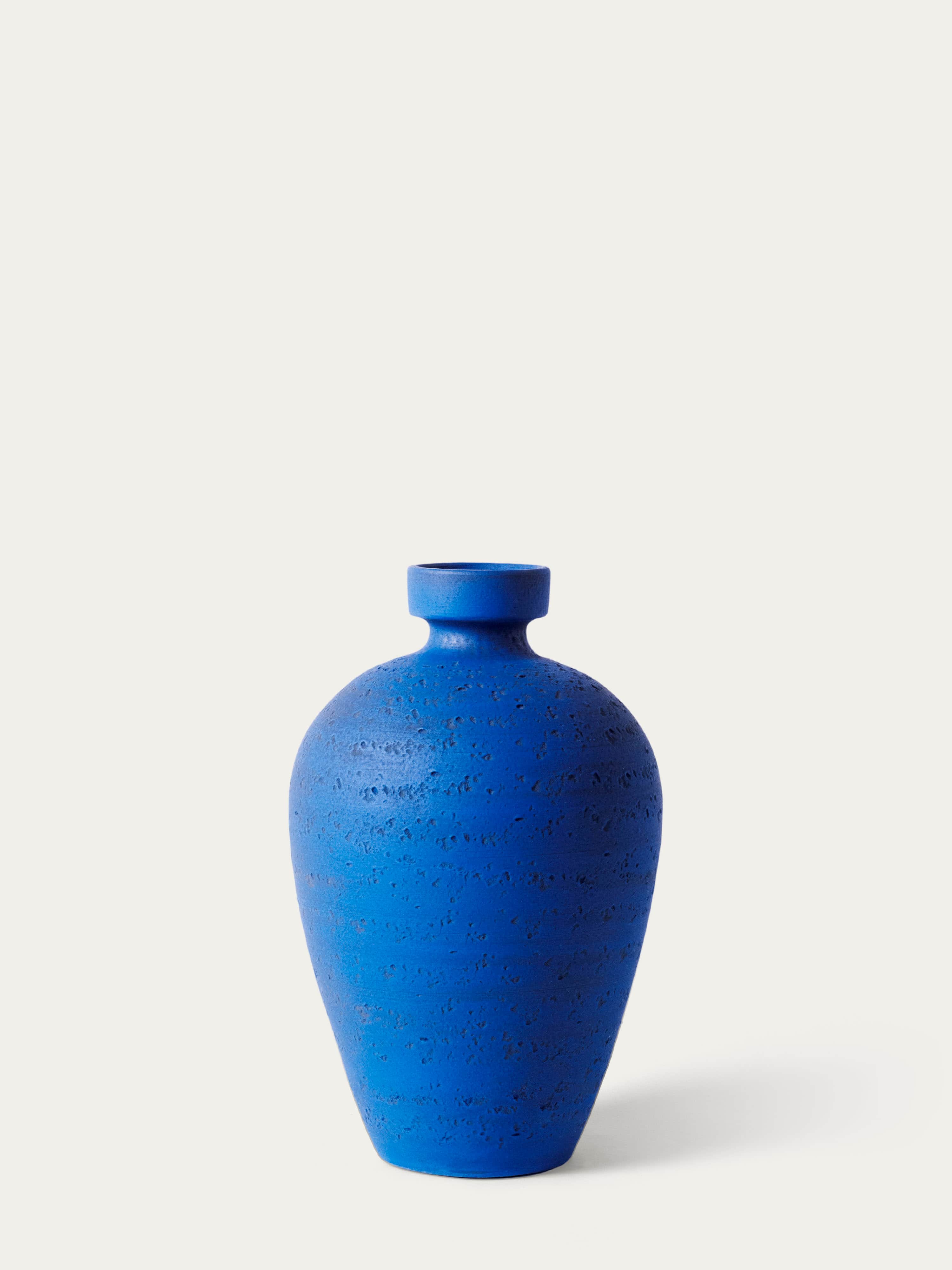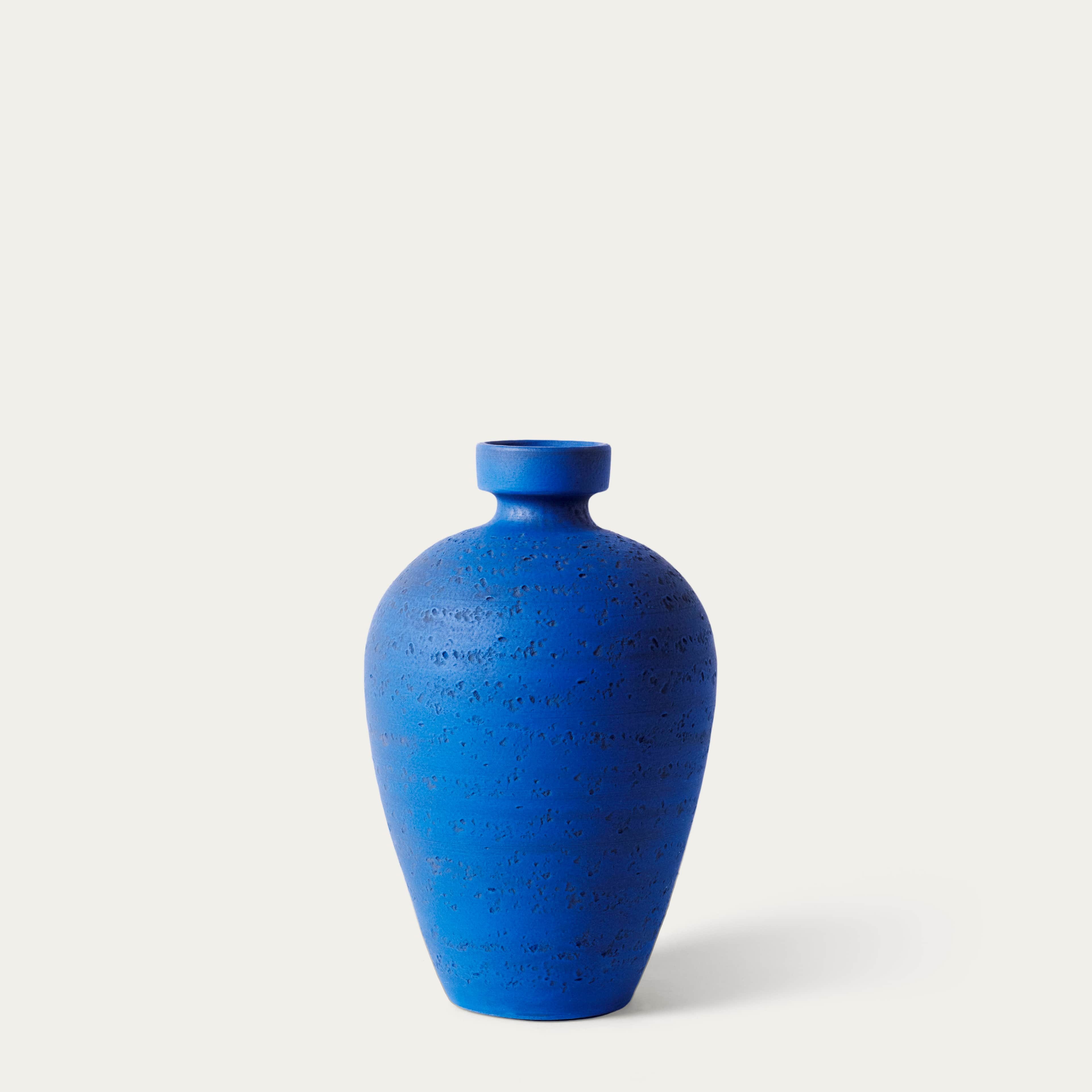 Een kobaltblauwe keramieken vaas met matte steenstructuur. Zacht van vorm, rijk van kleur.