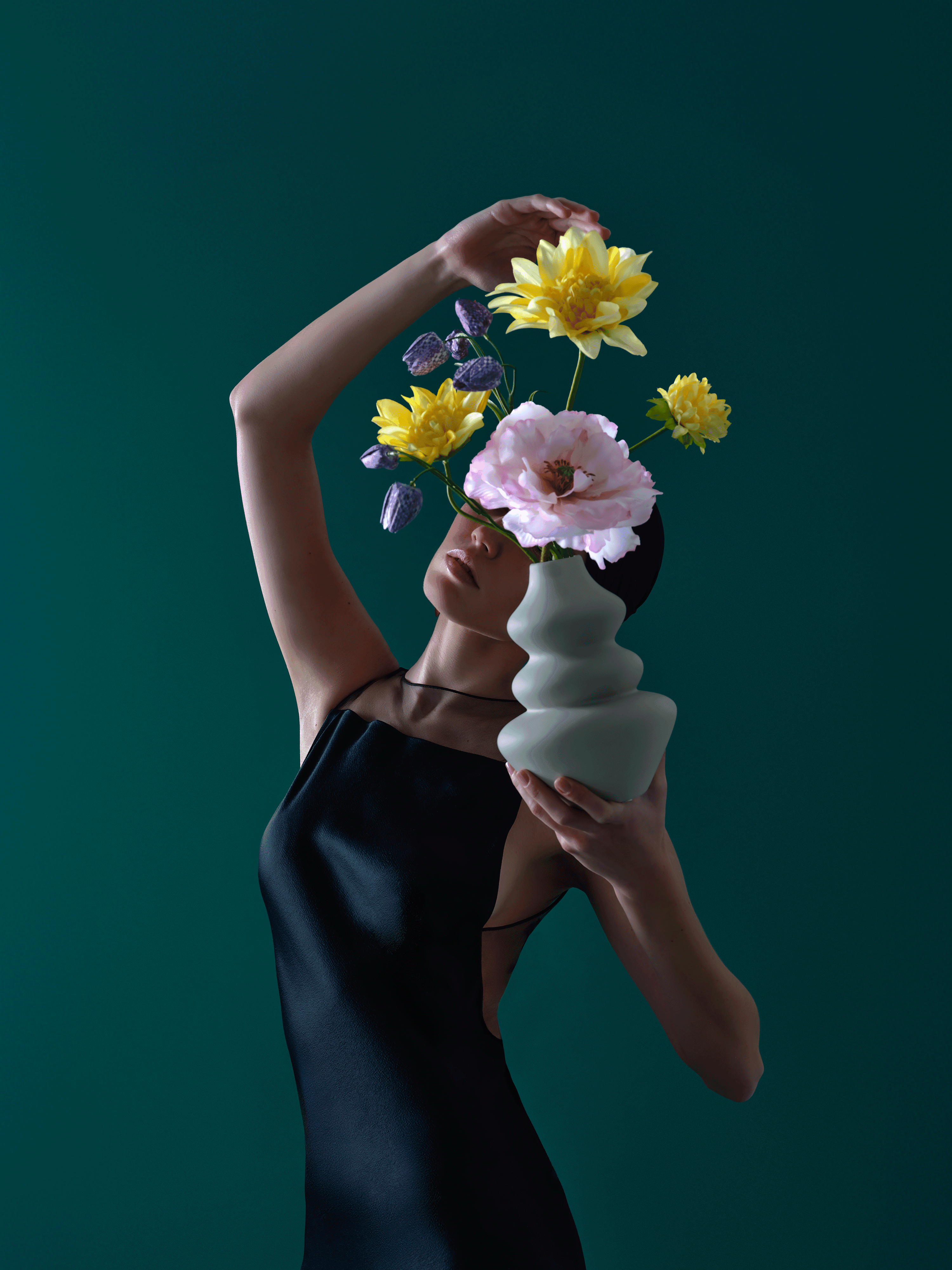 Een dromerige zijden mix van real-touch gele dahlia, lichtroze klaproos en paarse fritillaria in een organische vaas. Dit boeket arriveert met ons gratis bloemparfum.