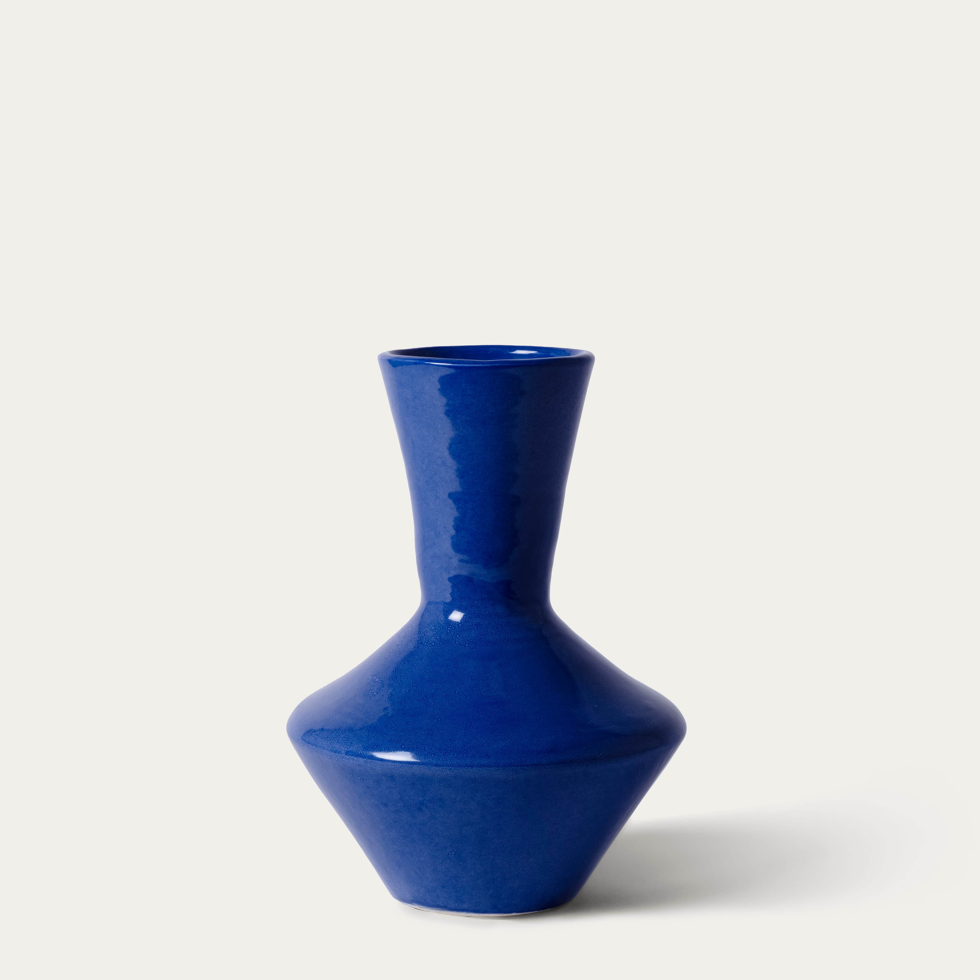 Een middelgrote geometrische vaas van glanzend kobaltblauw keramiek. Stoer en sculpturaal; een levendige basis voor je boeket.