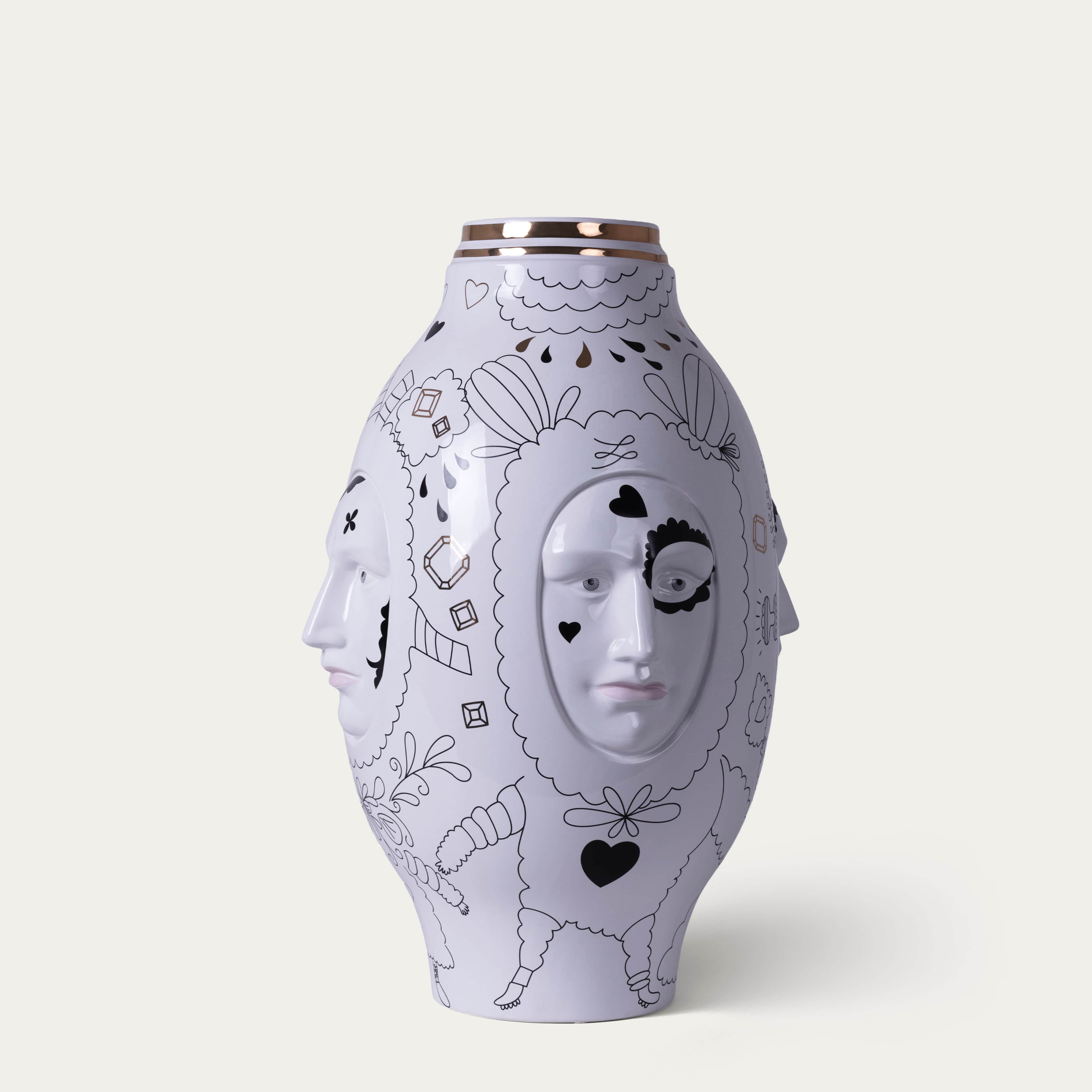 Een witte keramieken vaas met reliëfgezichten en speelse illustraties. Artistiek en karaktervol; een echte blikvanger!