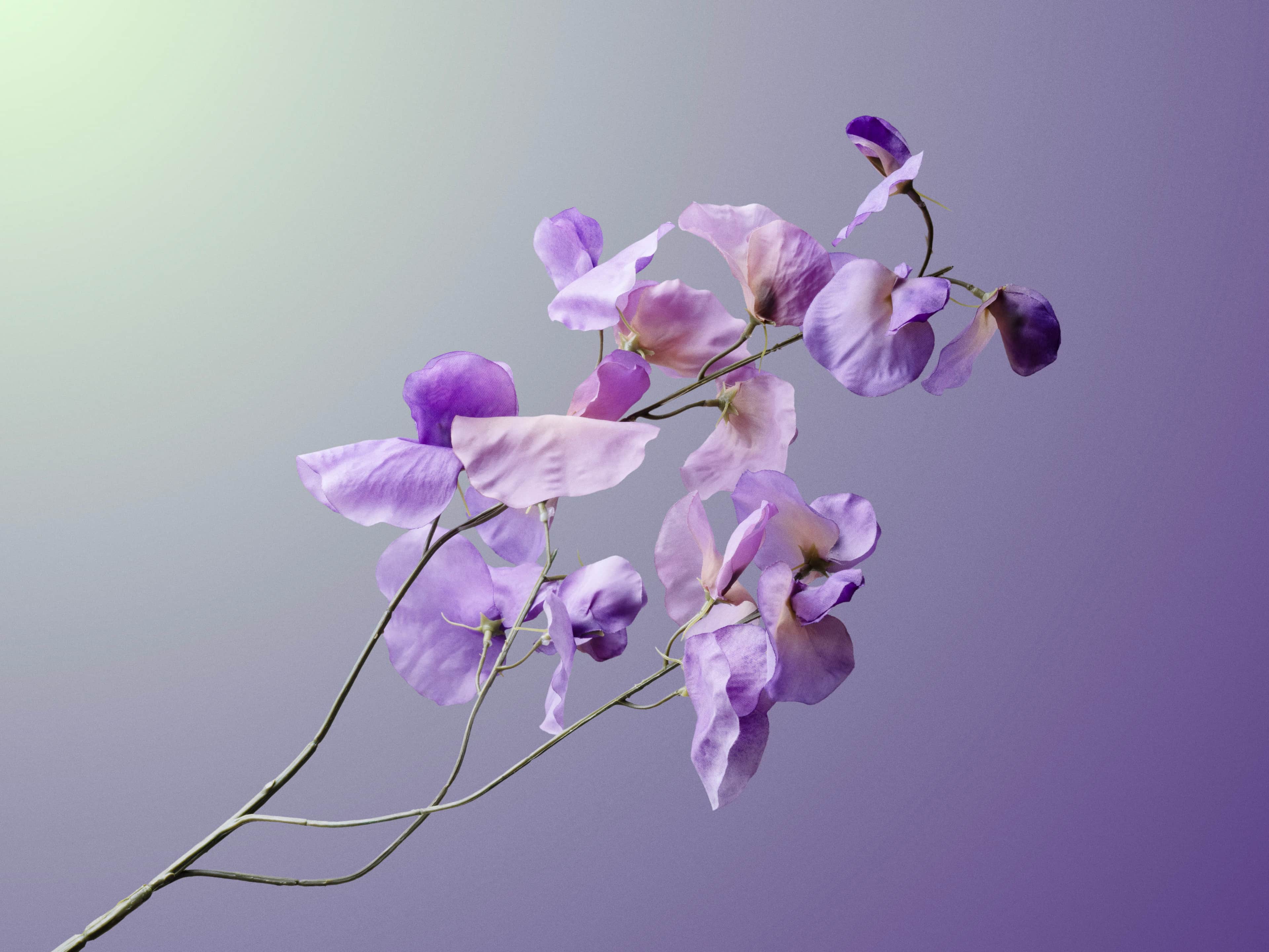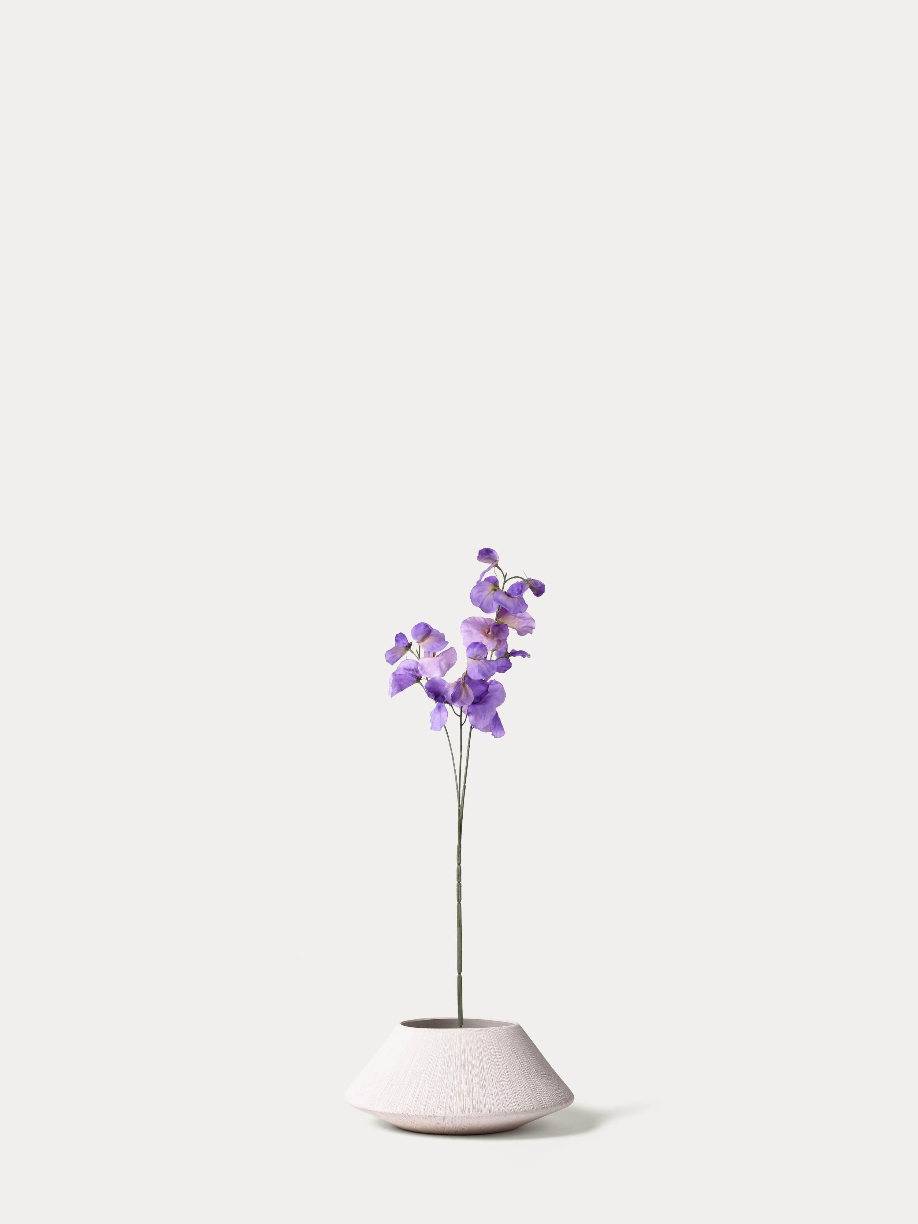 Elegant mono boeket van zijden lila lathyrus in een organische crèmekleurige vaas. Dit boeket wordt geleverd met ons gratis bloemparfum.