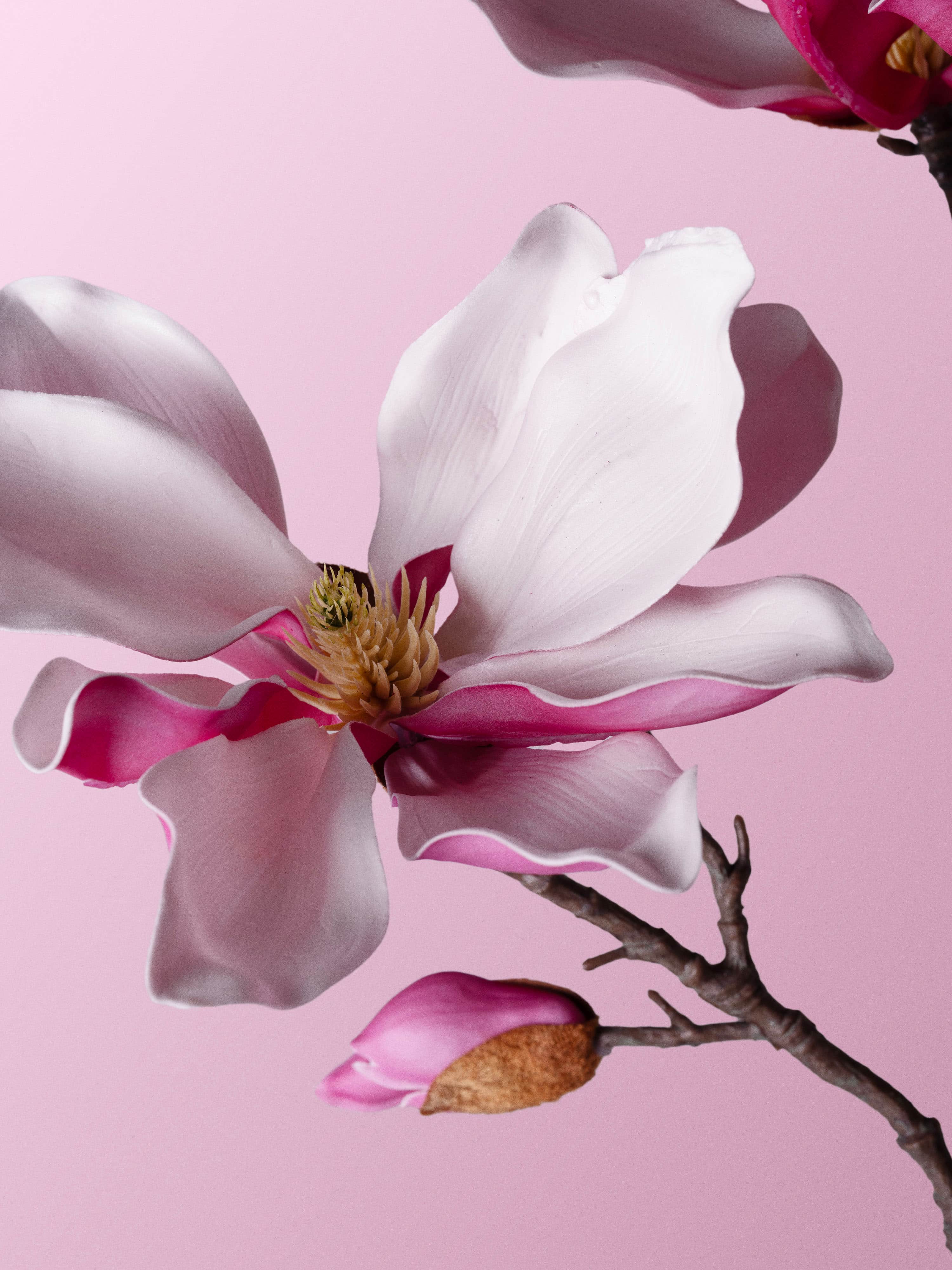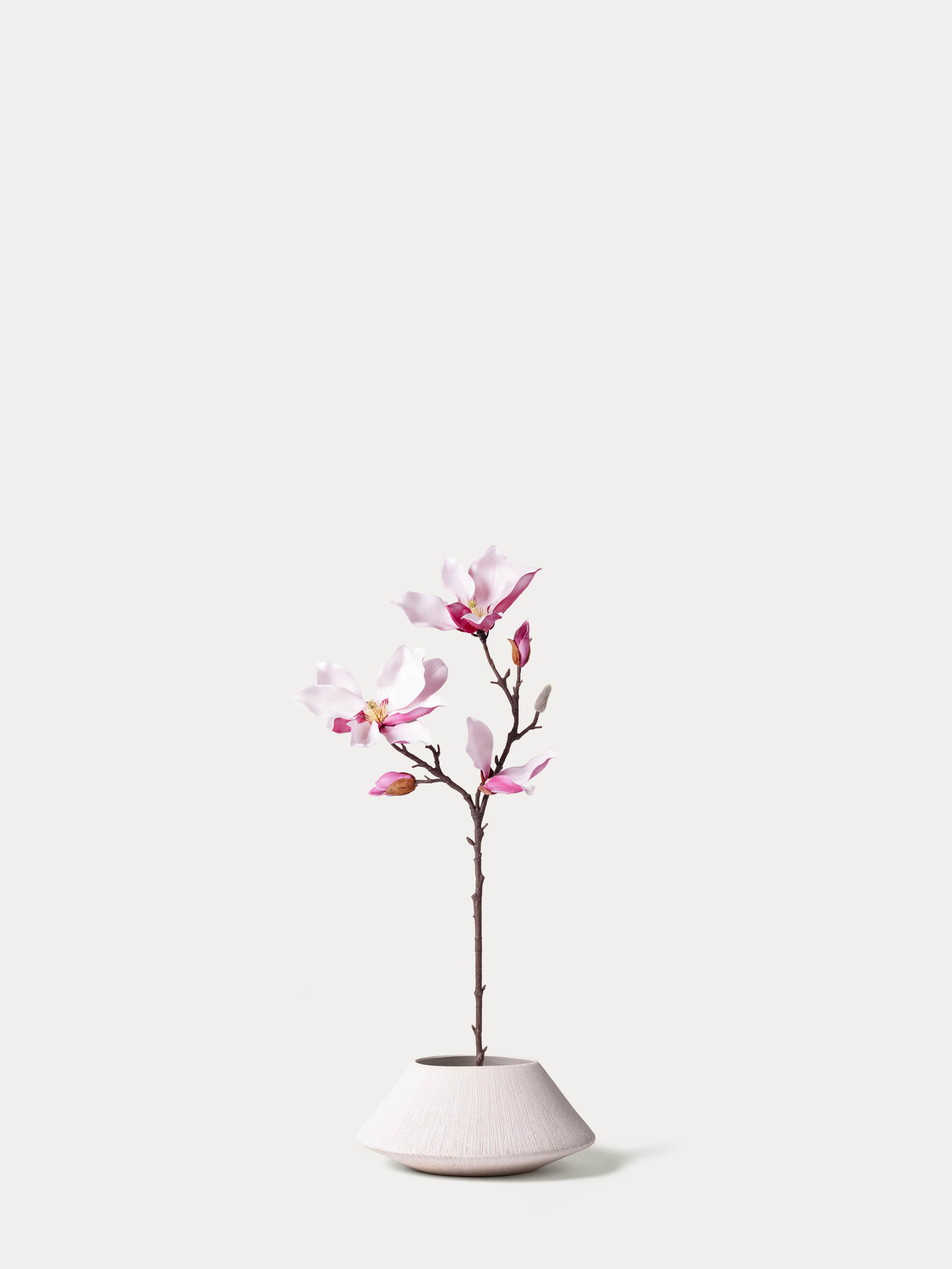 Dit verfijnde magnoliaboeket vormt een elegant geheel met de ronde, slanke vaas.