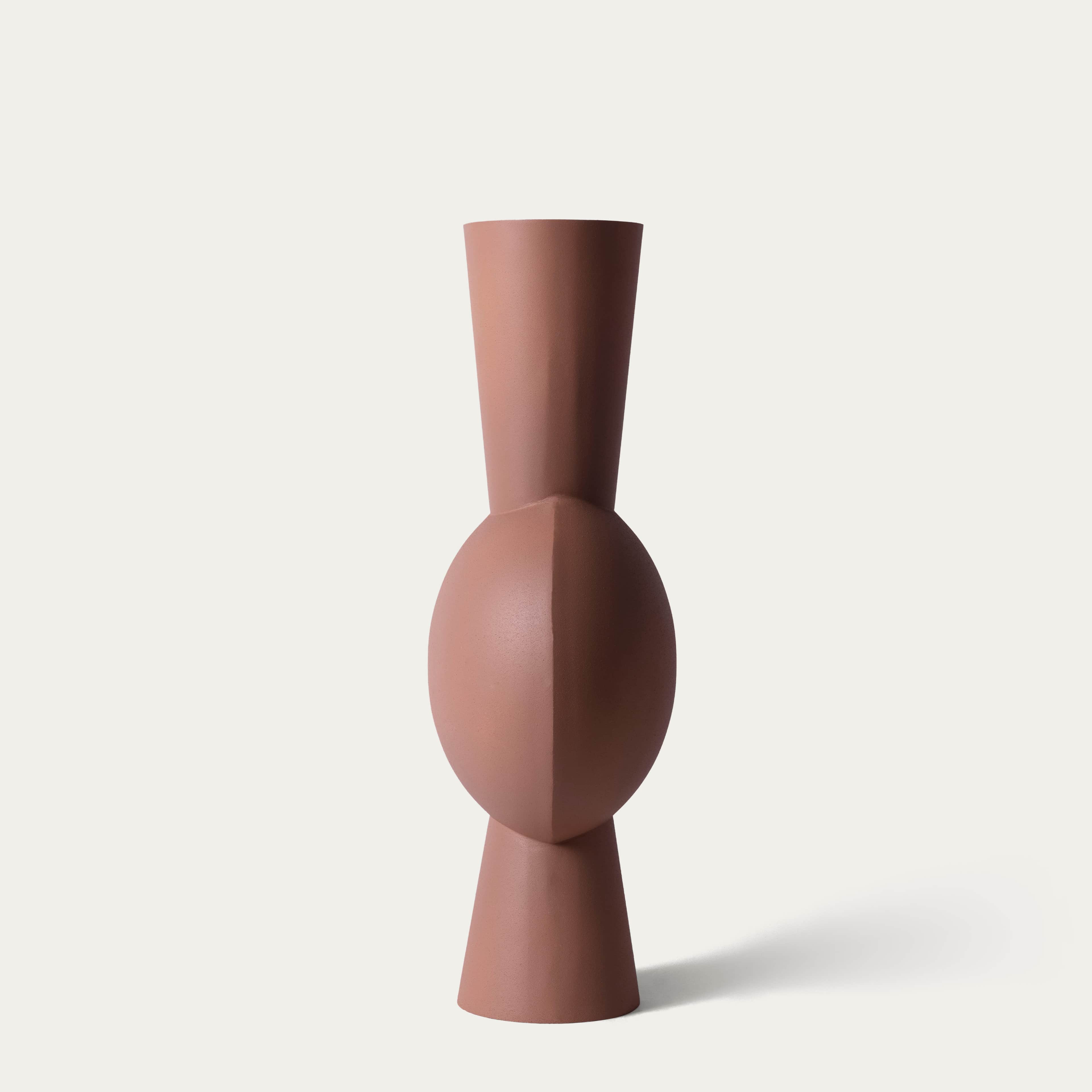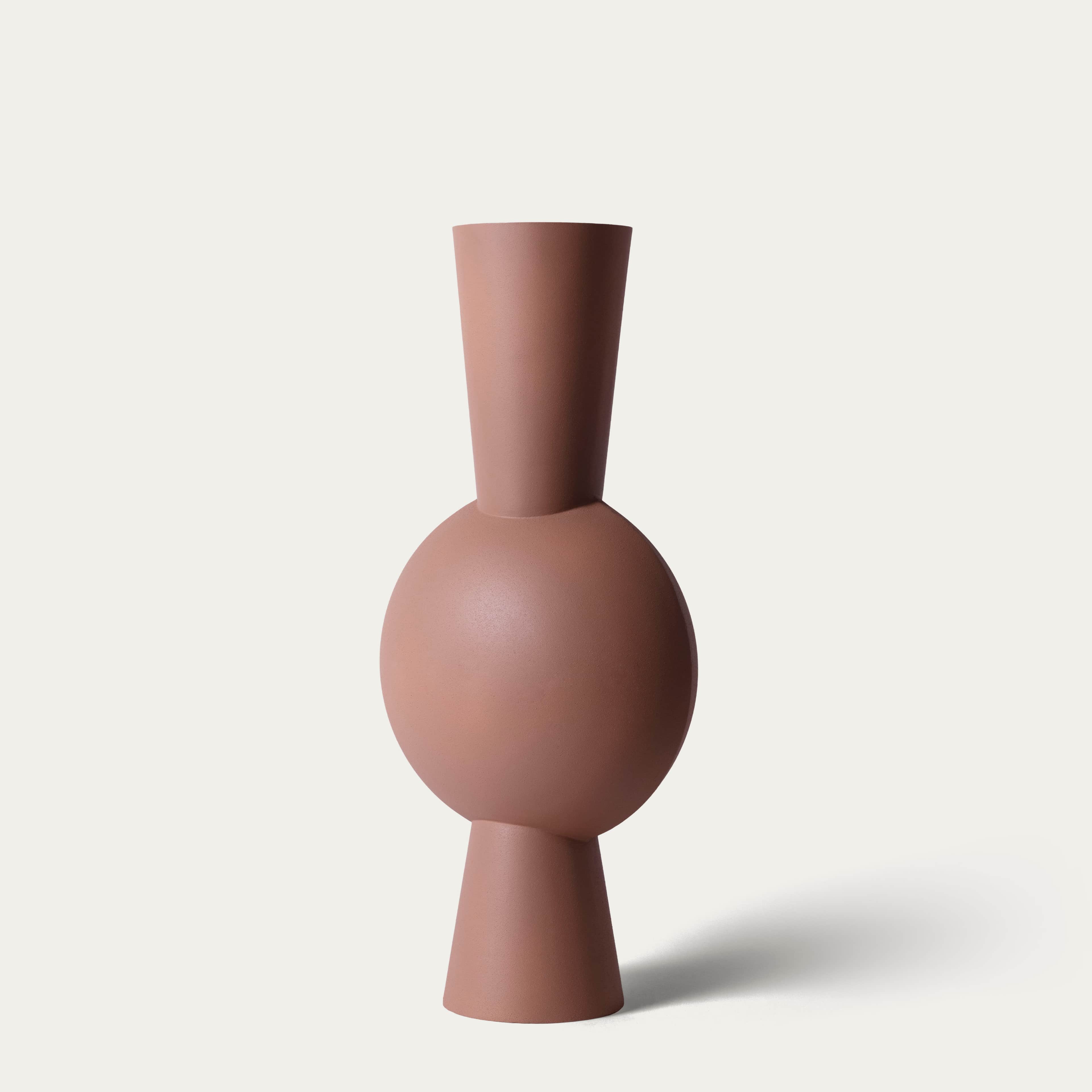Een perzikkleurige vaas met een bolvormig lichaam. Zacht en sculpturaal; een rustige basis die elke compositie mooi ondersteunt.