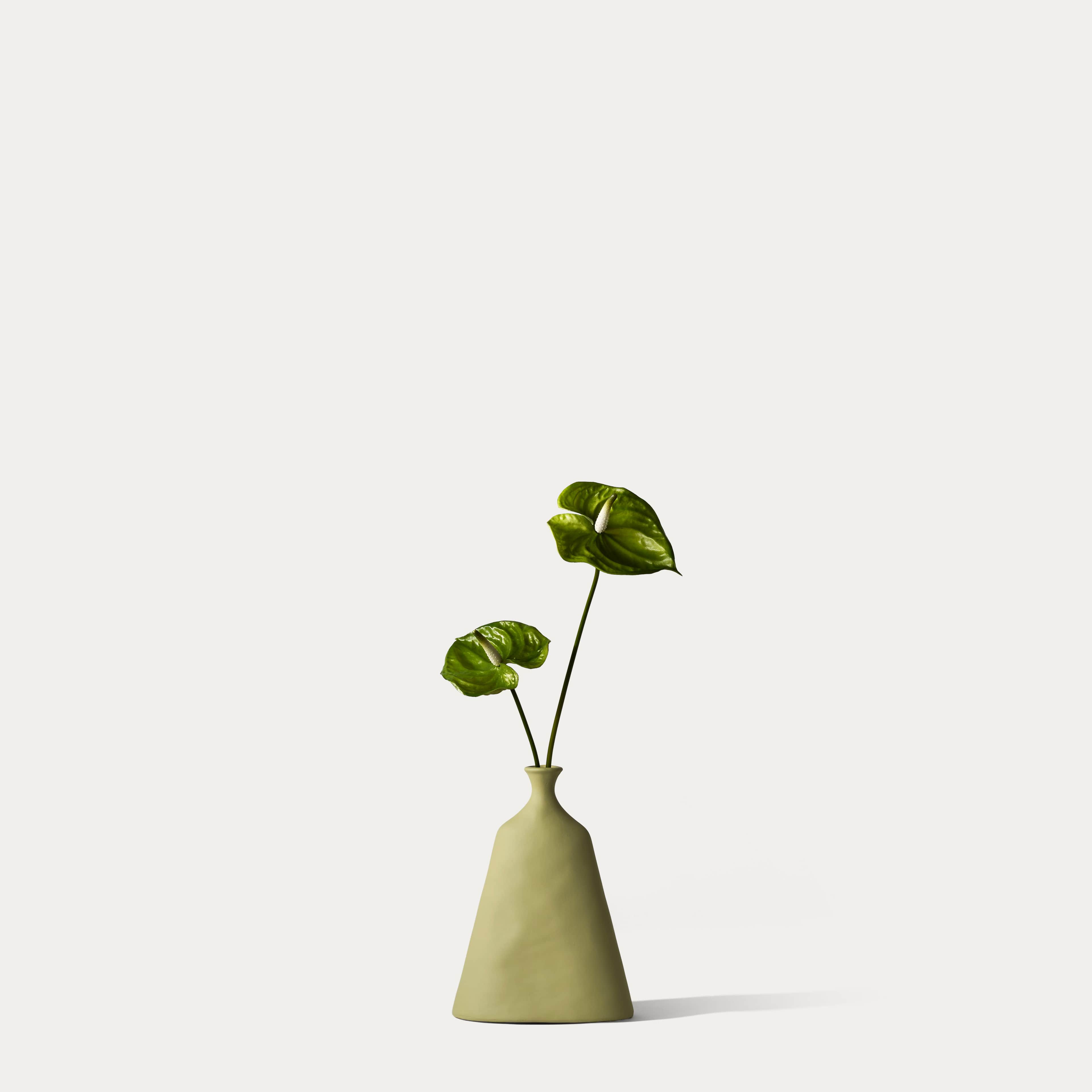 Een modern zijden boeket met groene anthuriums, geschikt in een hoge, platte groene vaas. Het boeket wordt geleverd met ons gratis bloemparfum.