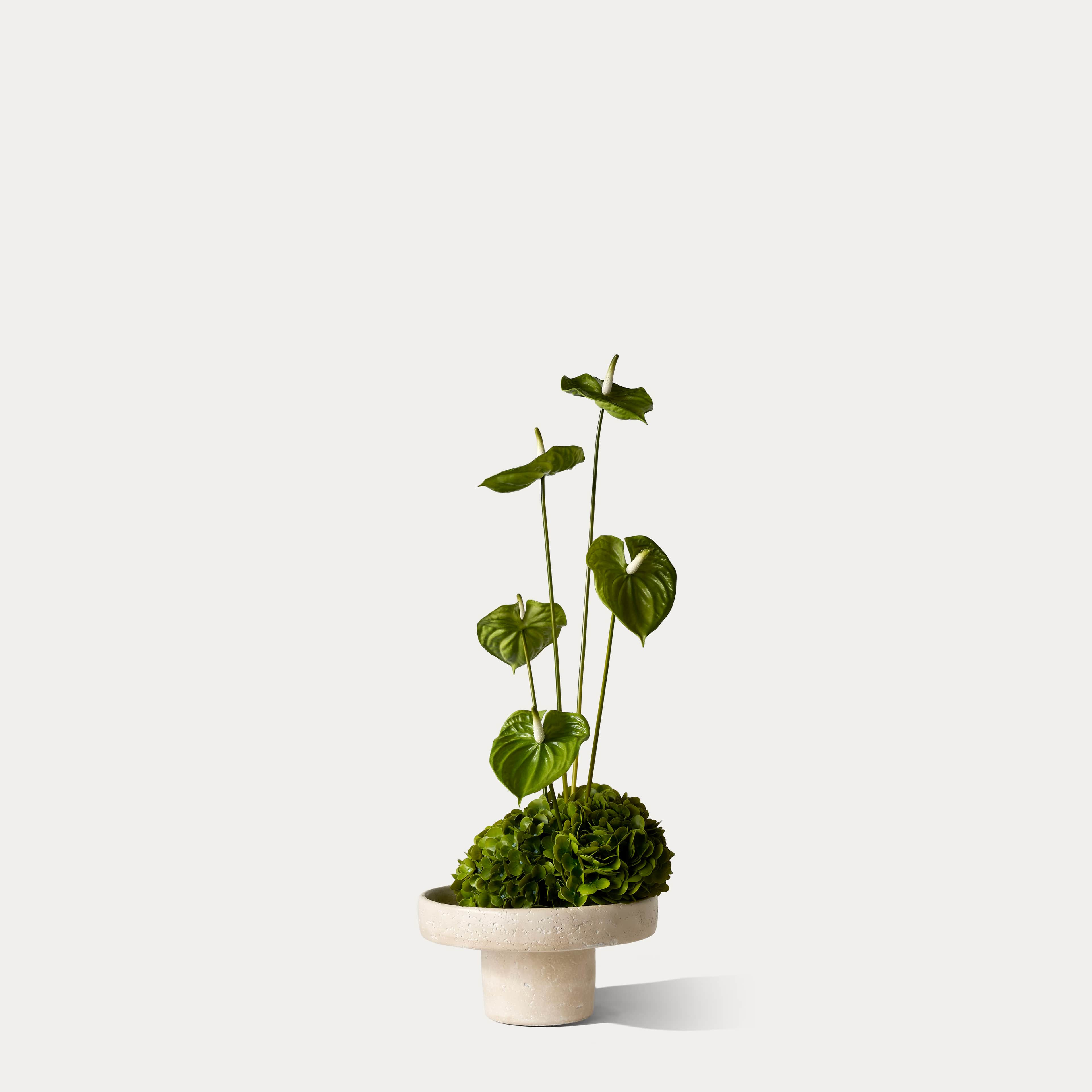 Een stoer sculpturaal zijden boeket met groene anthuriums en een prachtige real-touch groene hortensia, geschikt op een platte stenen schaal. Het boeket wordt geleverd met ons gratis bloemparfum.