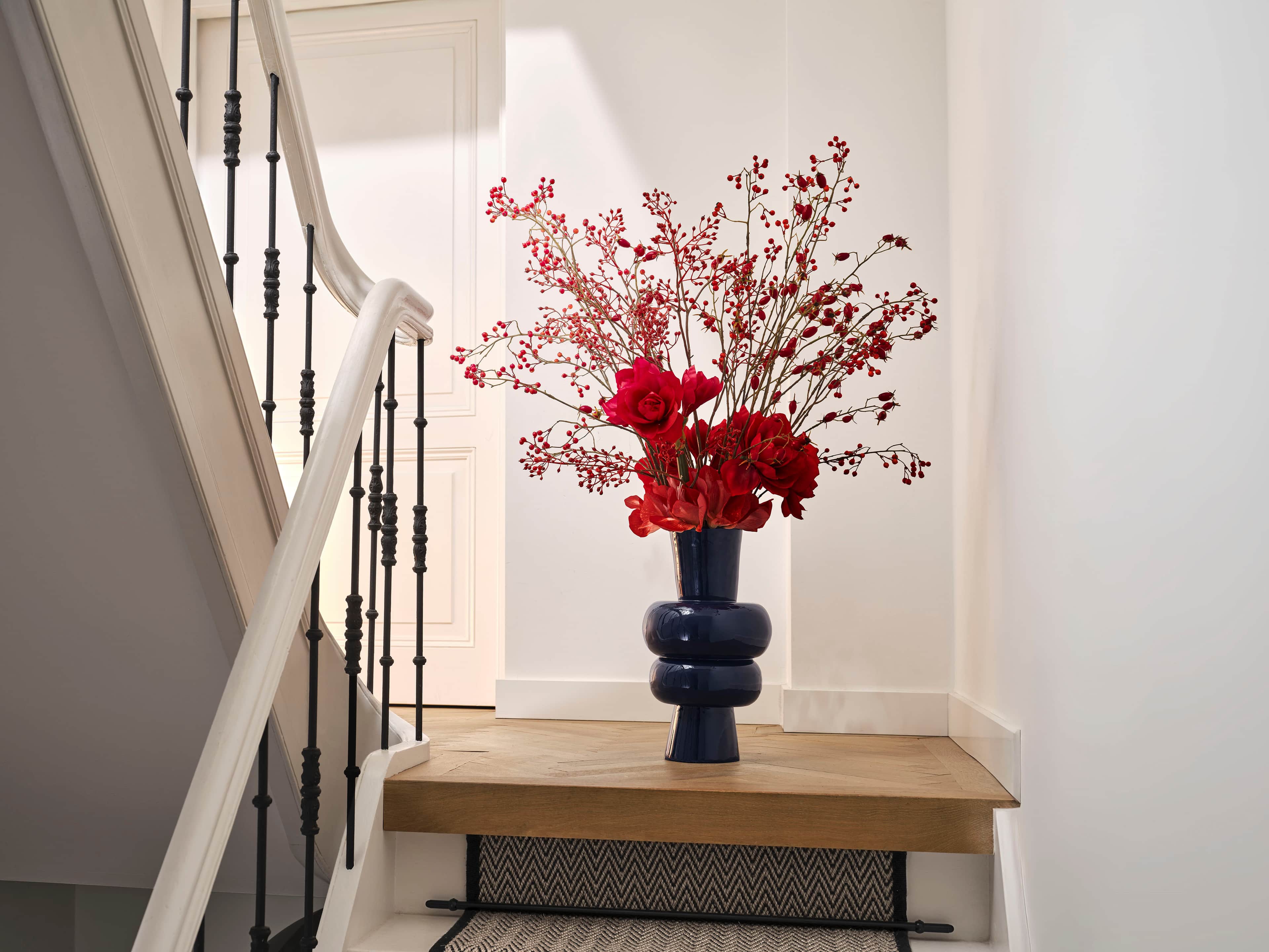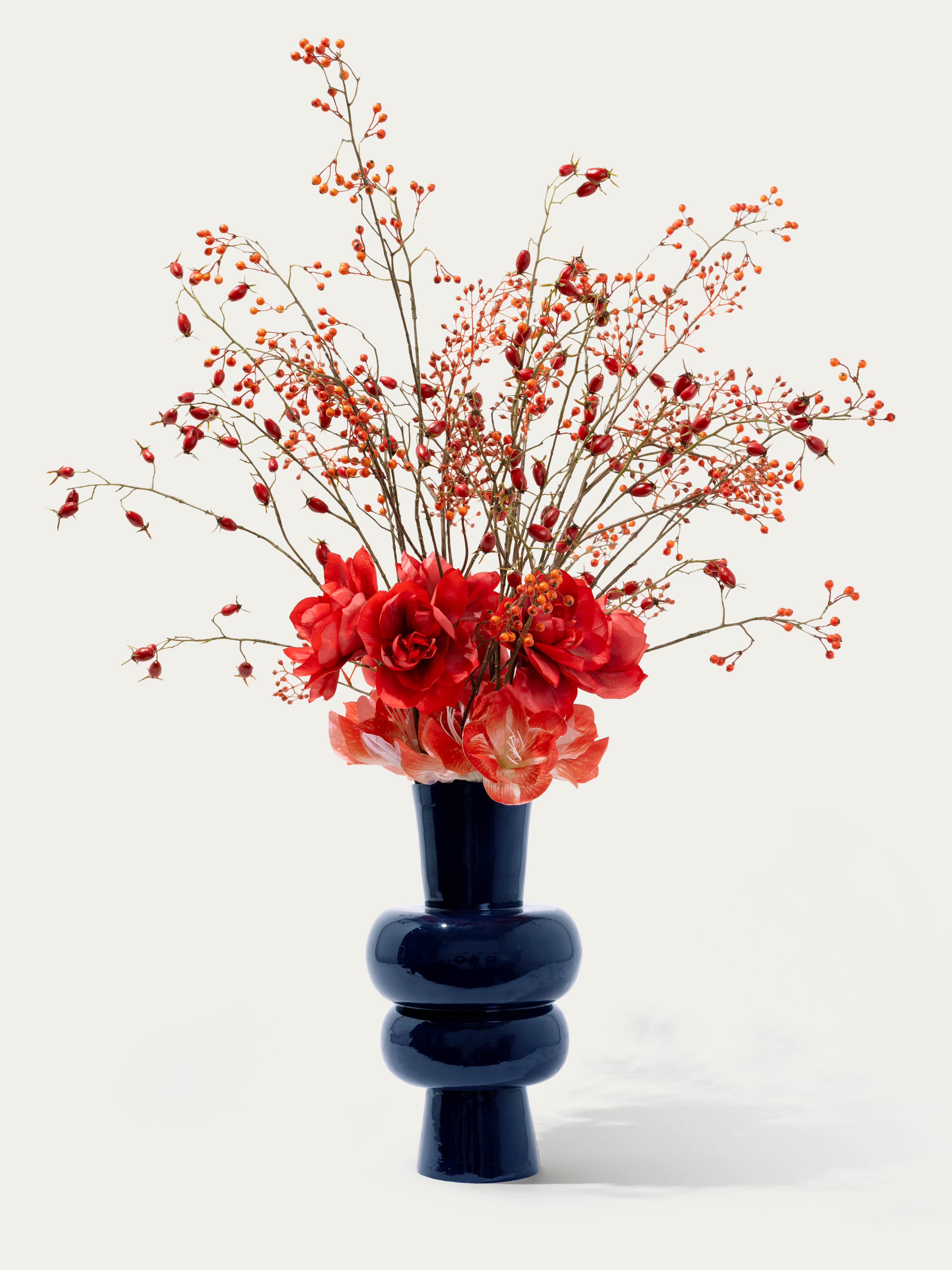 Krachtig seizoensboeket met real-touch amaryllis, zijden rode bessen en rozebottels in een donker indigo vaas. Dit boeket wordt geleverd met ons gratis bloemparfum.