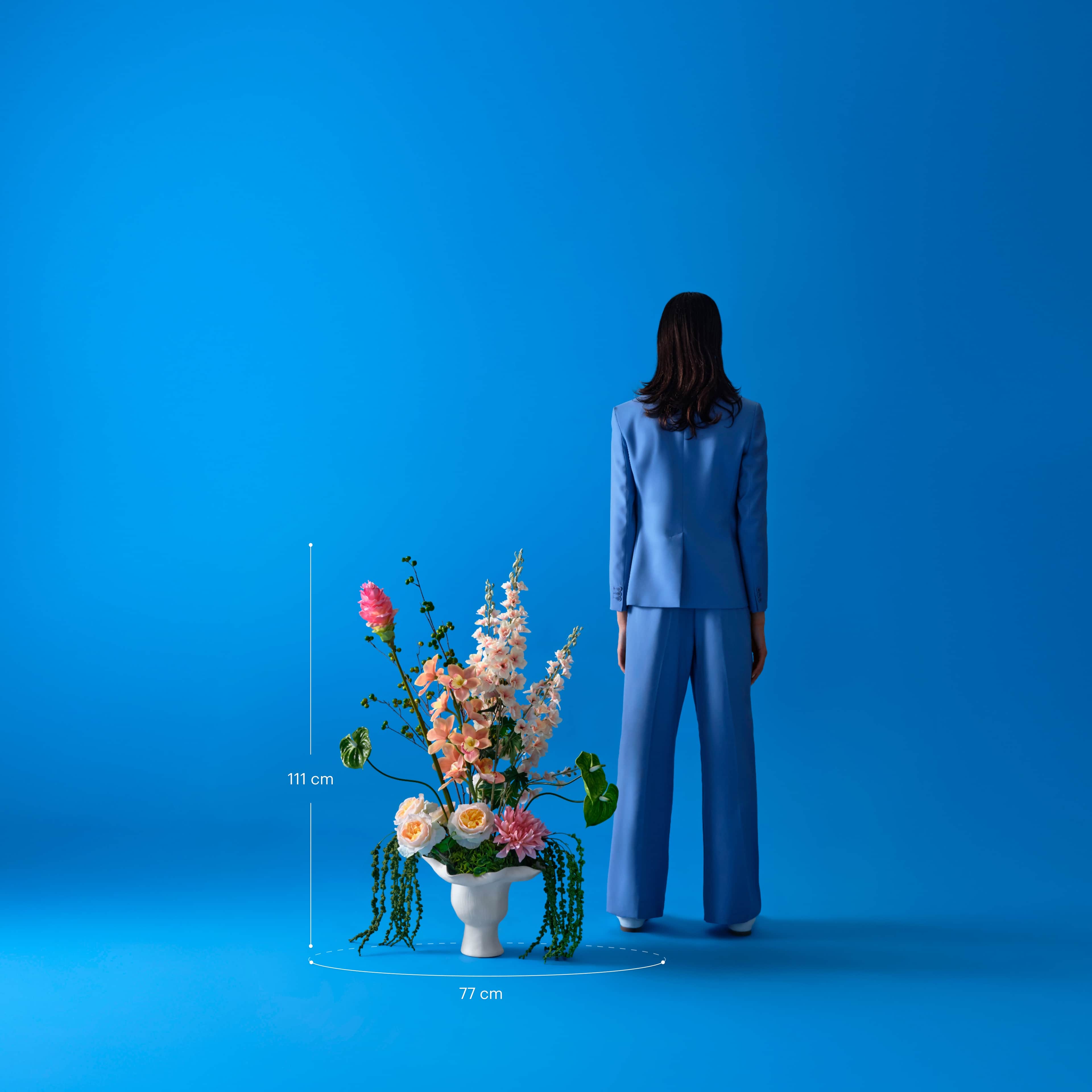 Een groot sculpturaal zijden boeket in zachte perzik- en rozetinten, met dramatische amarant, dahlia, pioenen, zachte perzikkleurige delphinium, groene anthurium en roze curcuma, geschikt in een witte sculpturale vaas. Het boeket wordt geleverd met ons gratis bloemparfum.