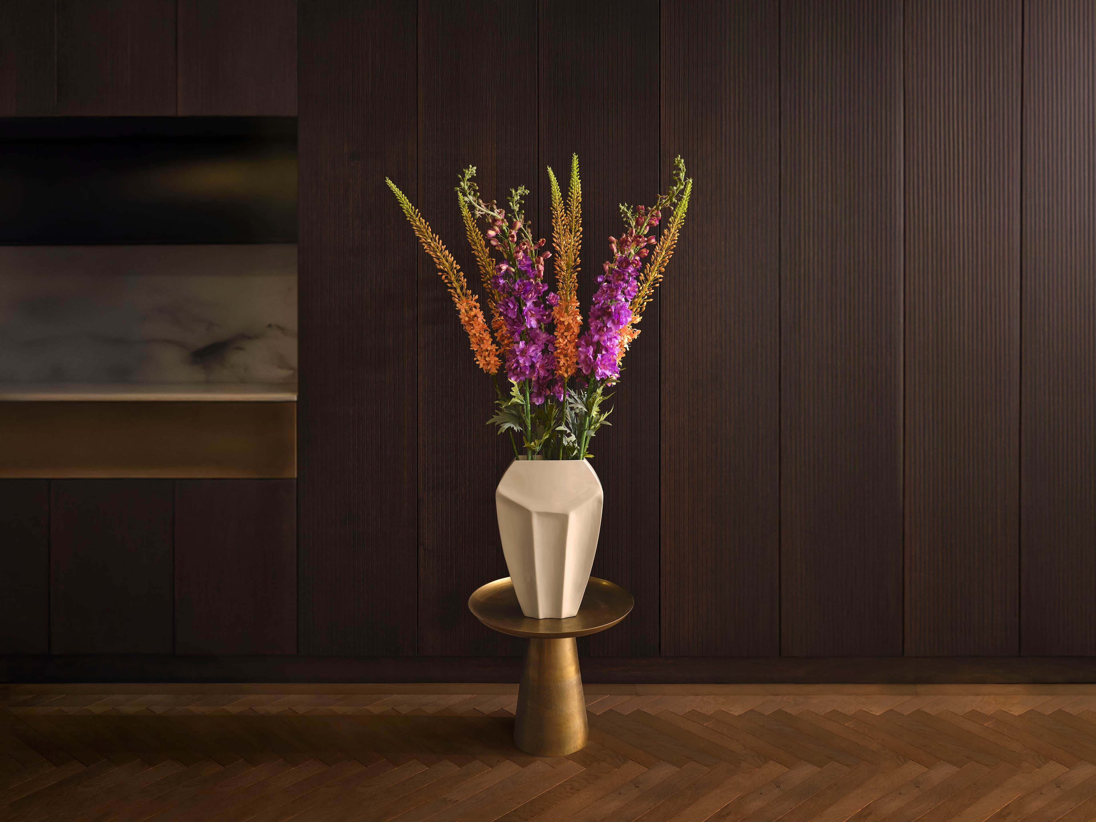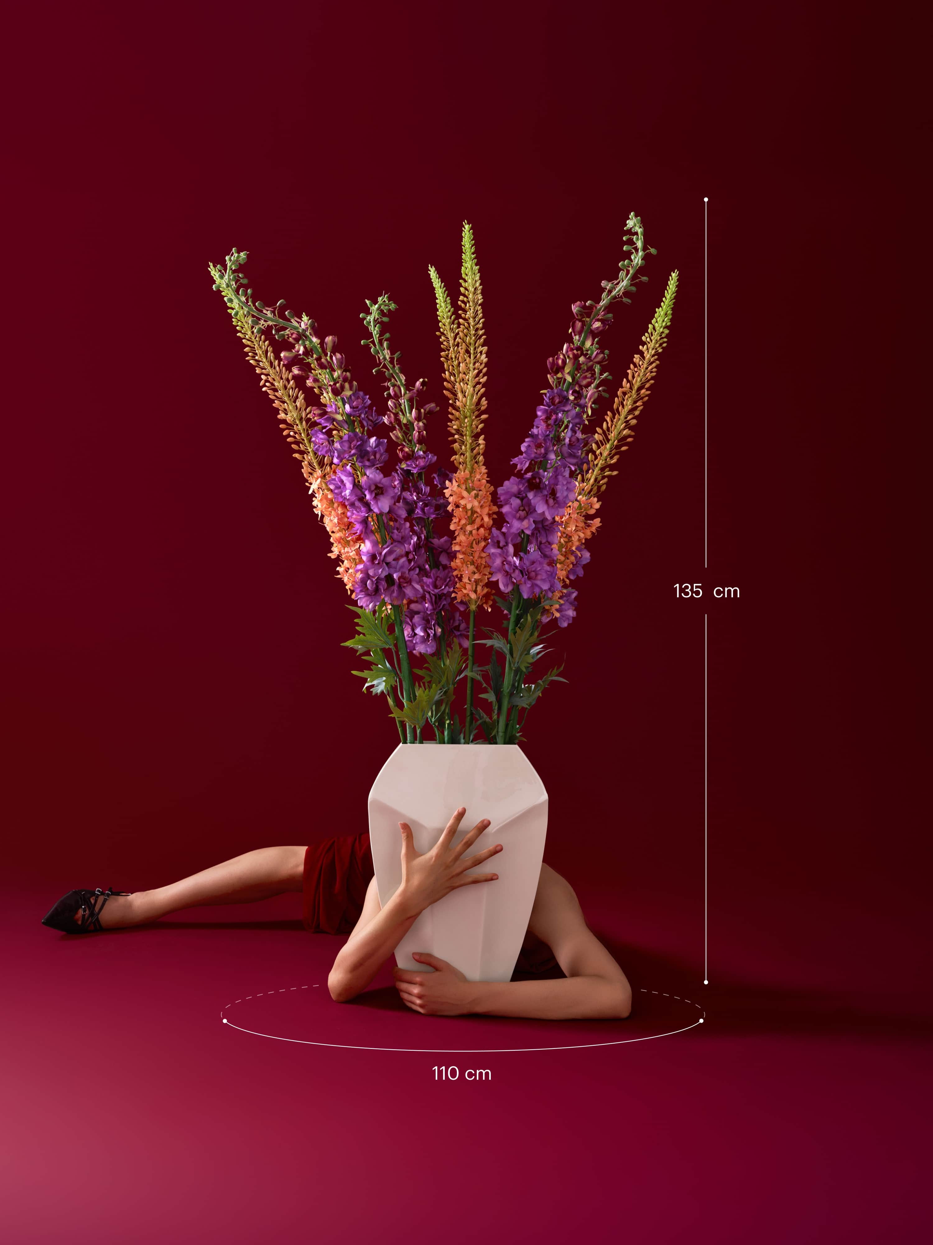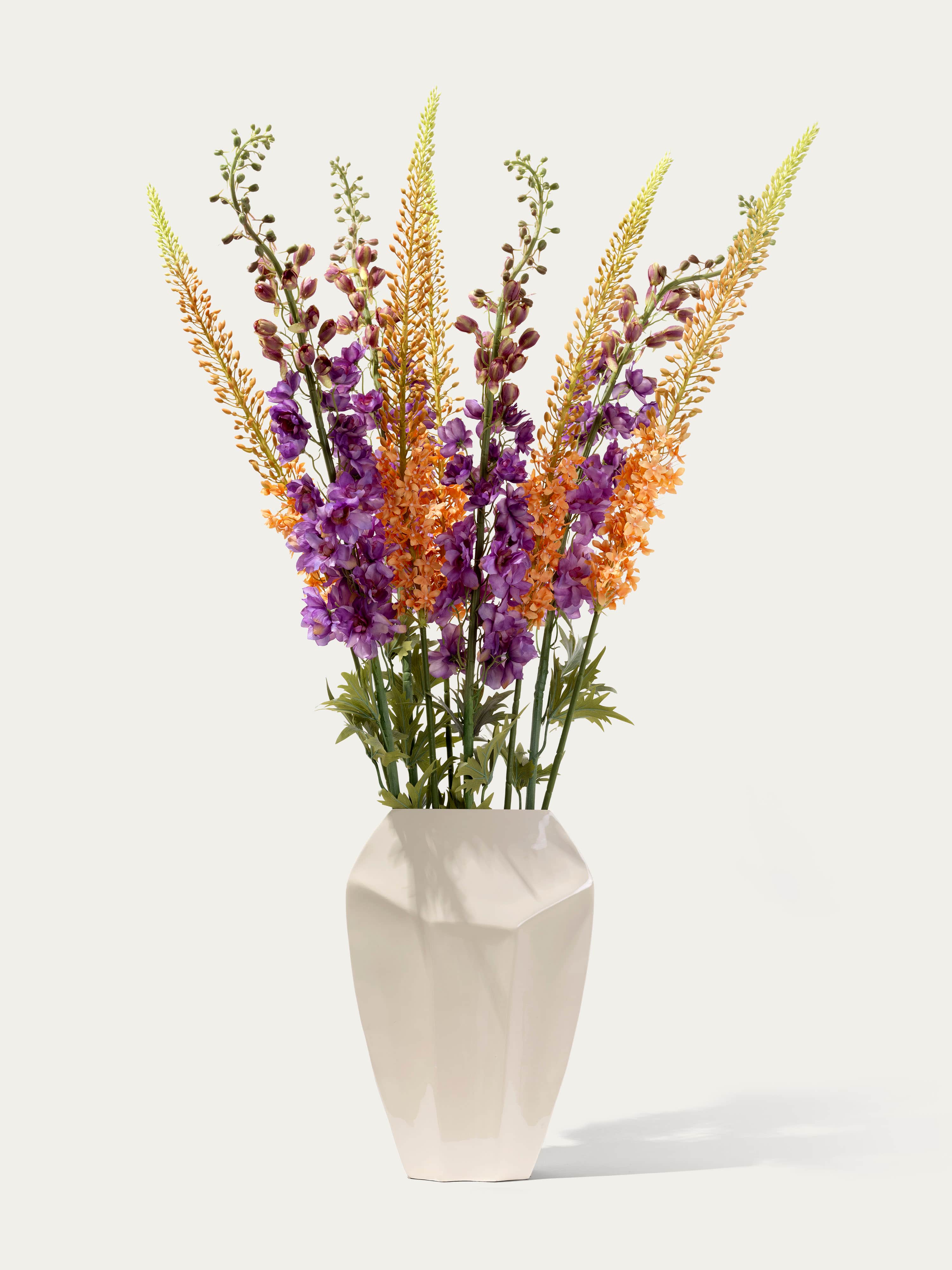 Favoriet uit deze collectie: een strakke, ondiepe geometrische vaas met zachtroze zijden eremurus en paarse delphinium. Dit boeket wordt geleverd met ons gratis bloemparfum.