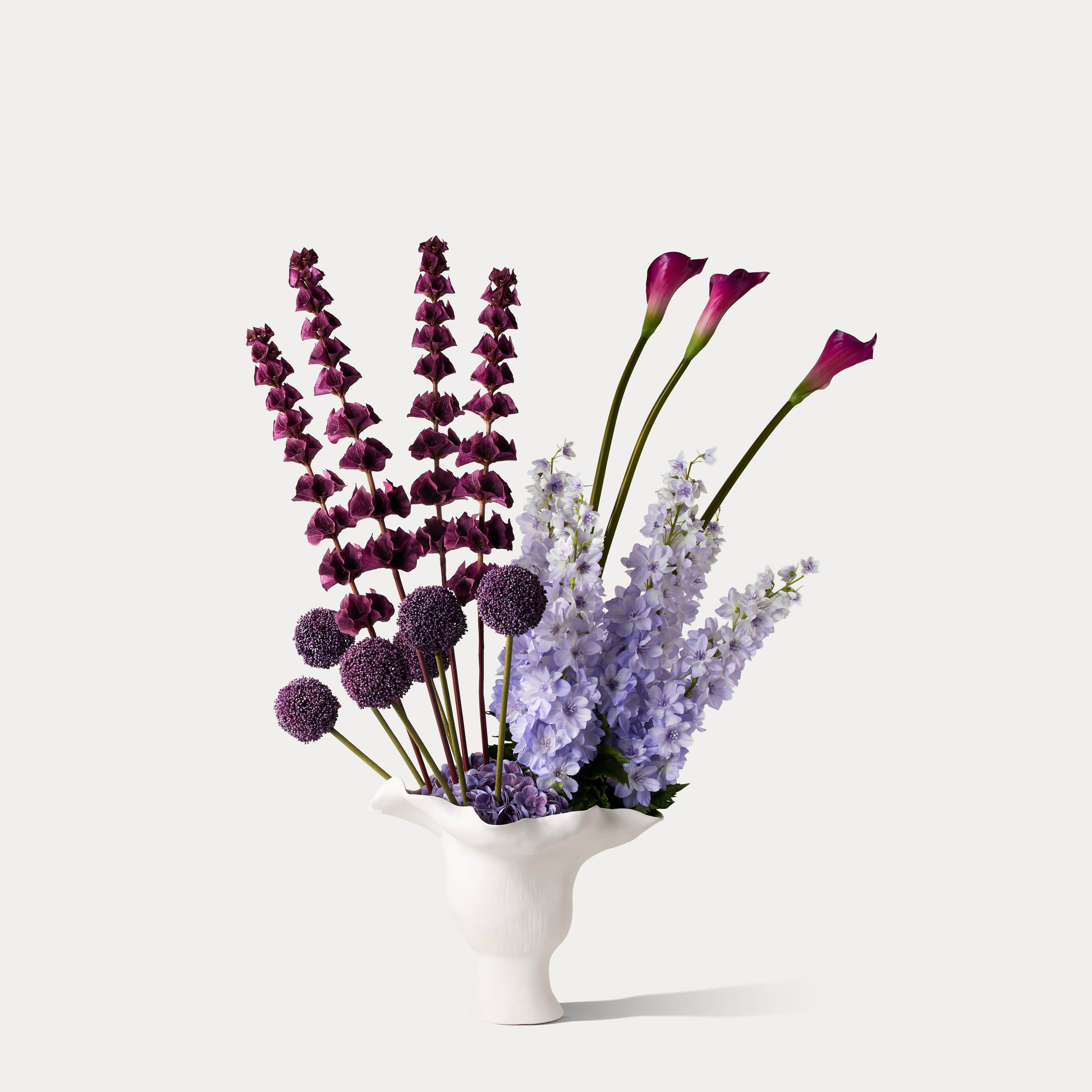 Een echte eyecatcher: een zijden boeket in paarse tinten van licht naar donker, met donkerpaarse klokken van Ierland, allium, calla en lavendelkleurige delphinium, geschikt in een witte sculpturale vaas. Het boeket wordt geleverd met ons gratis bloemparfum.