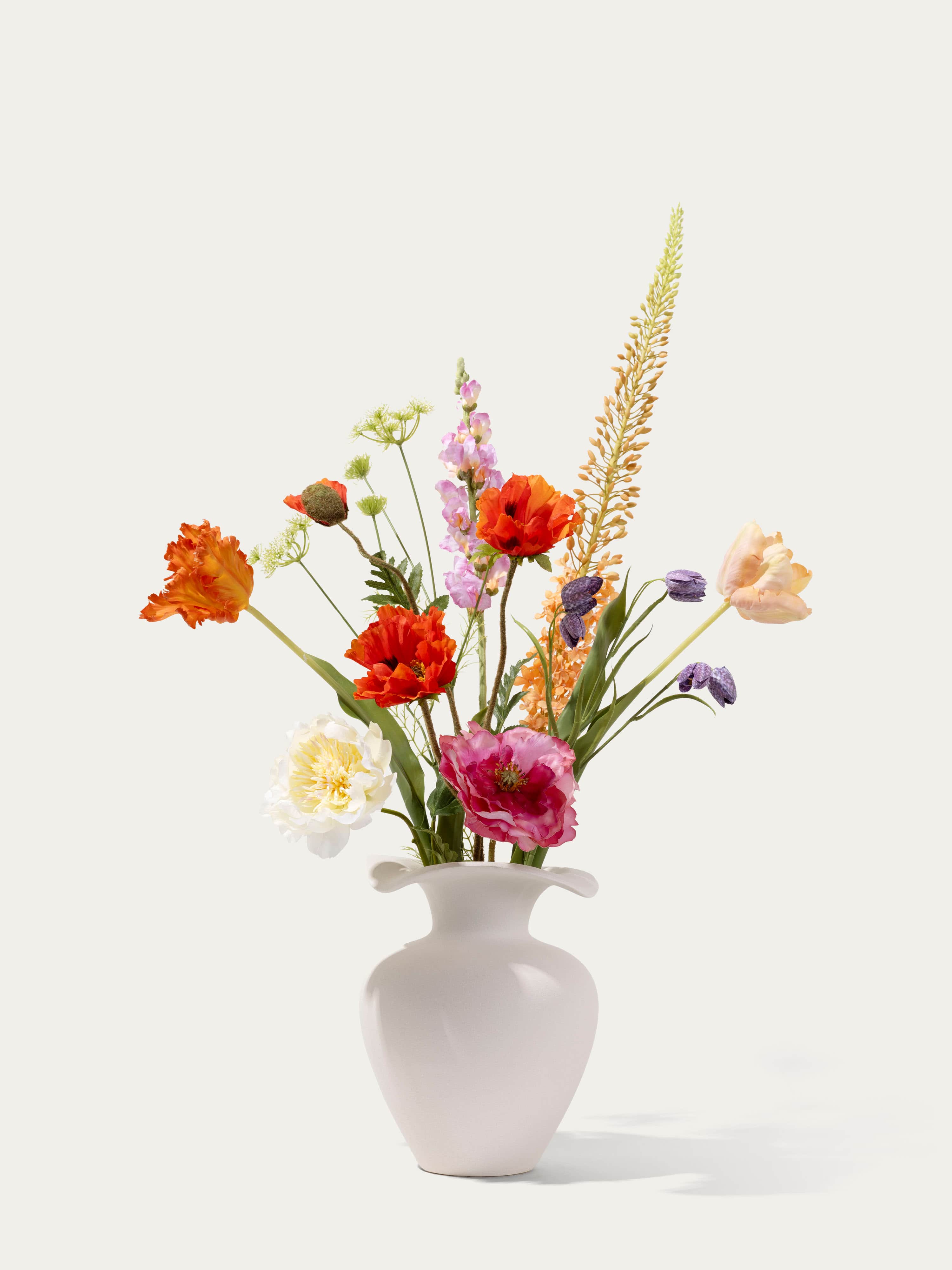 Een waanzinnig veldboeket met zijden oranje klaproos, perzikkleurige tulp, zachtgele eremurus, witte dille en paarse fritillaria, geschikt in een organisch gevormde vaas. Dit boeket wordt geleverd met ons gratis bloemparfum.