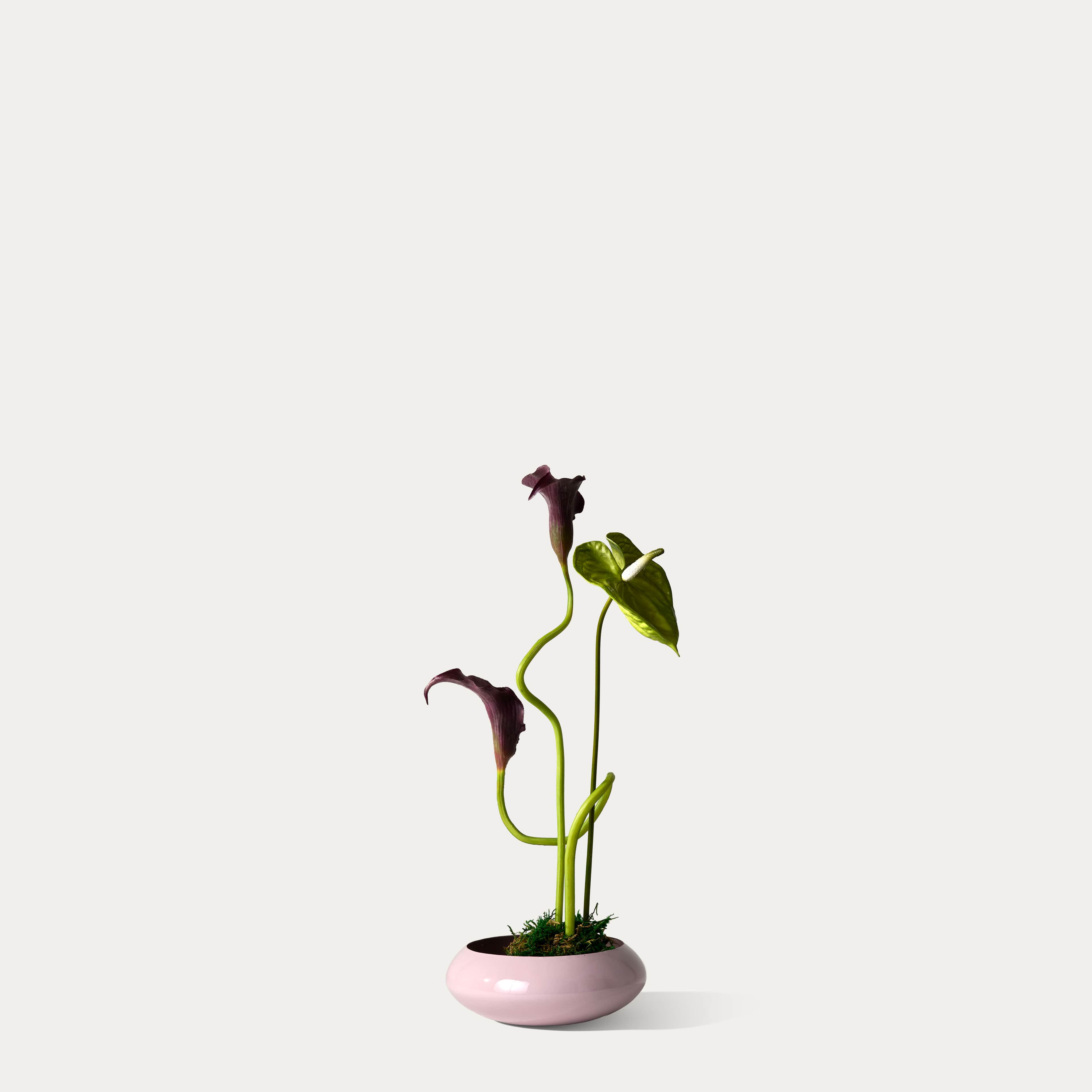 Een chic en sculpturaal zijden boeket in ikebana-stijl, met groene anthurium en diep paarse calla, geschikt in een zachtpaars schaaltje. Het boeket wordt geleverd met ons gratis bloemparfum.