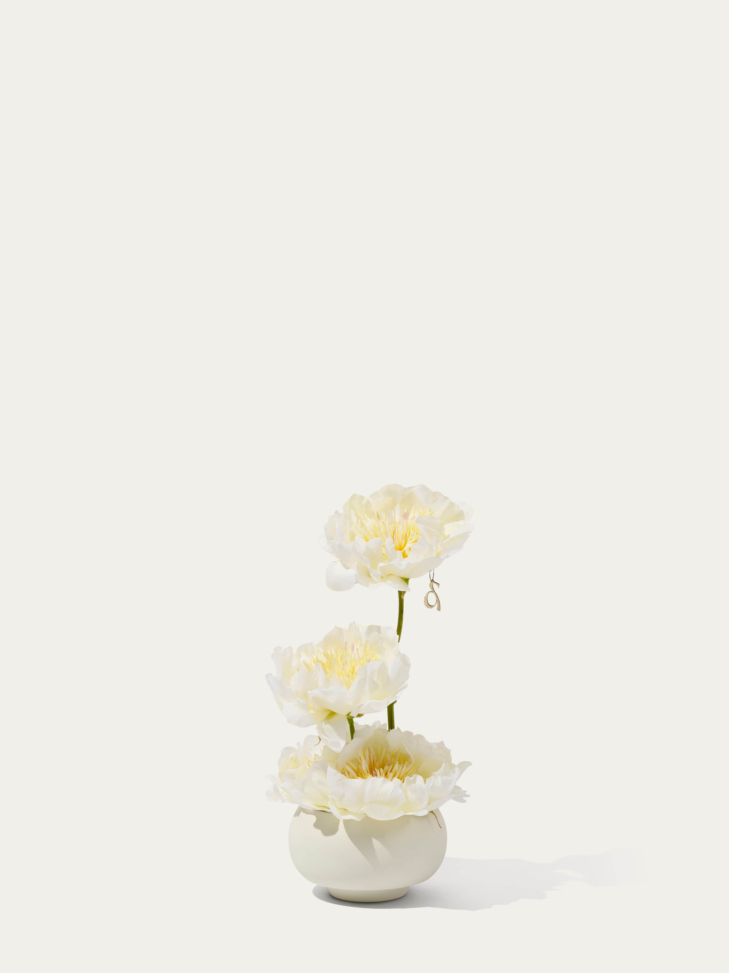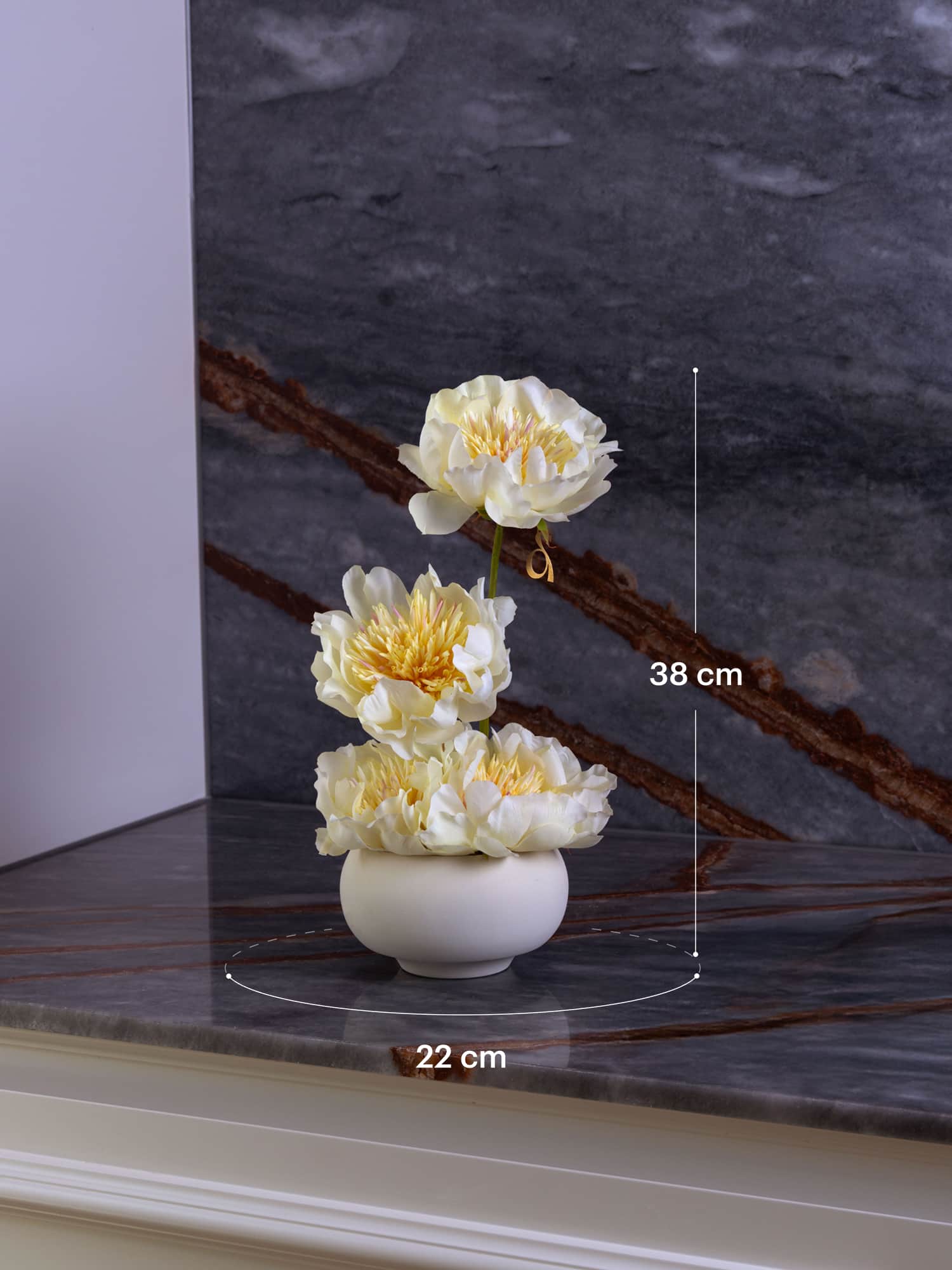 Een subtiel sculptuurtje van zachtgele real-touch pioenen, speels geschikt in een crèmewitte, matte schaal. Dit boeket wordt geleverd met ons gratis bloemparfum.