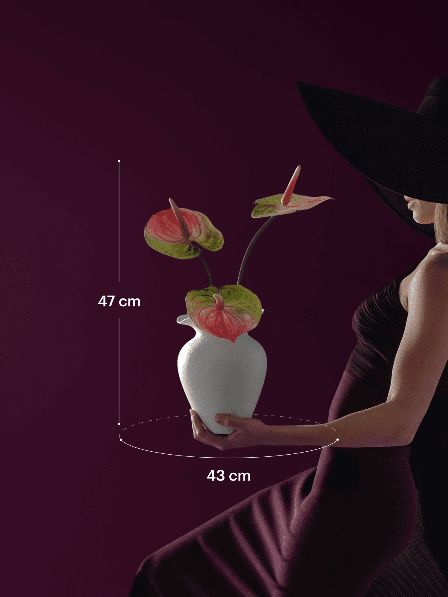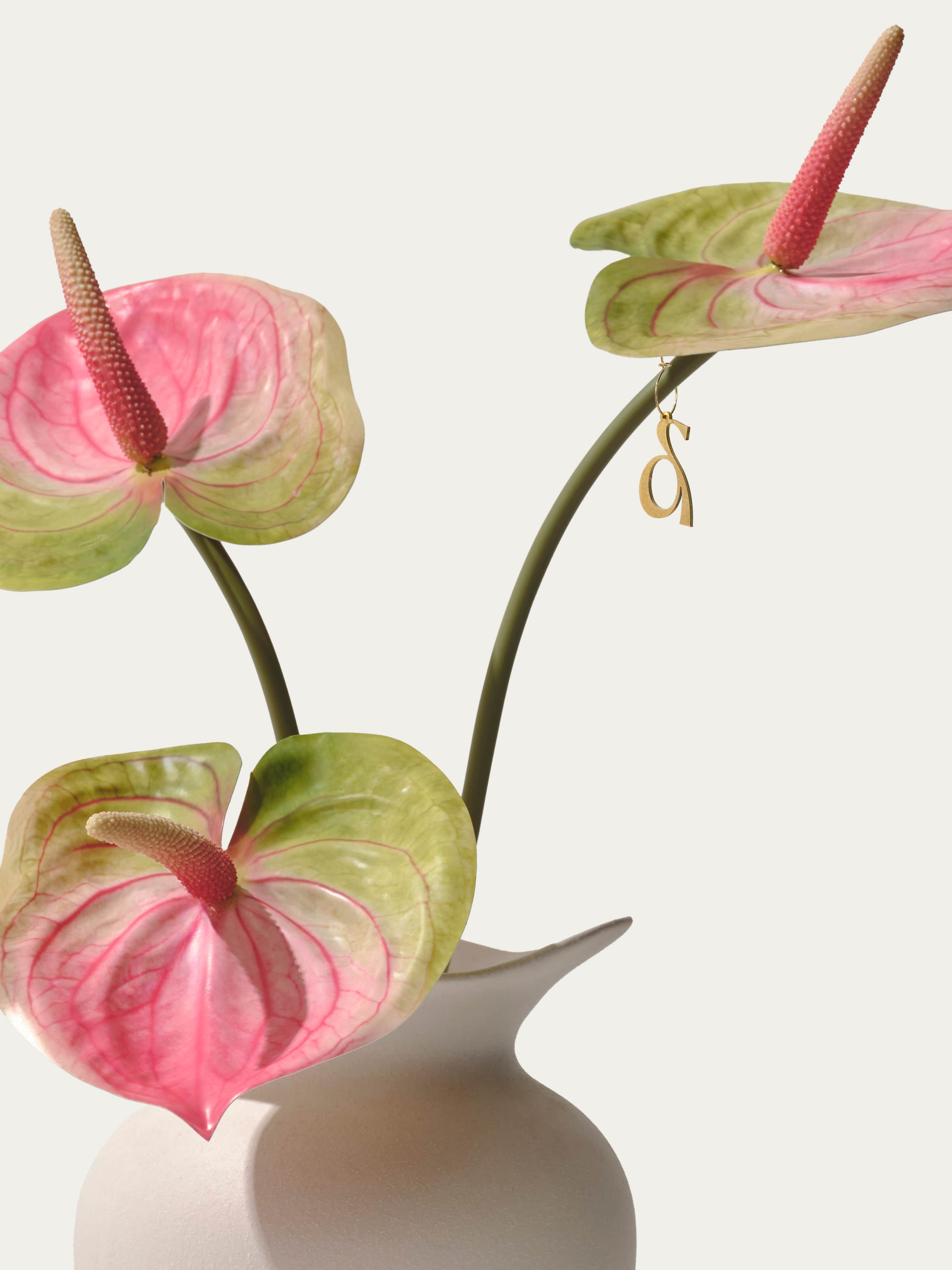 Een verfijnd boeket van zijden anthuriums in een mooi gevormde organische vaas. Dit boeket komt met ons gratis bloemparfum.