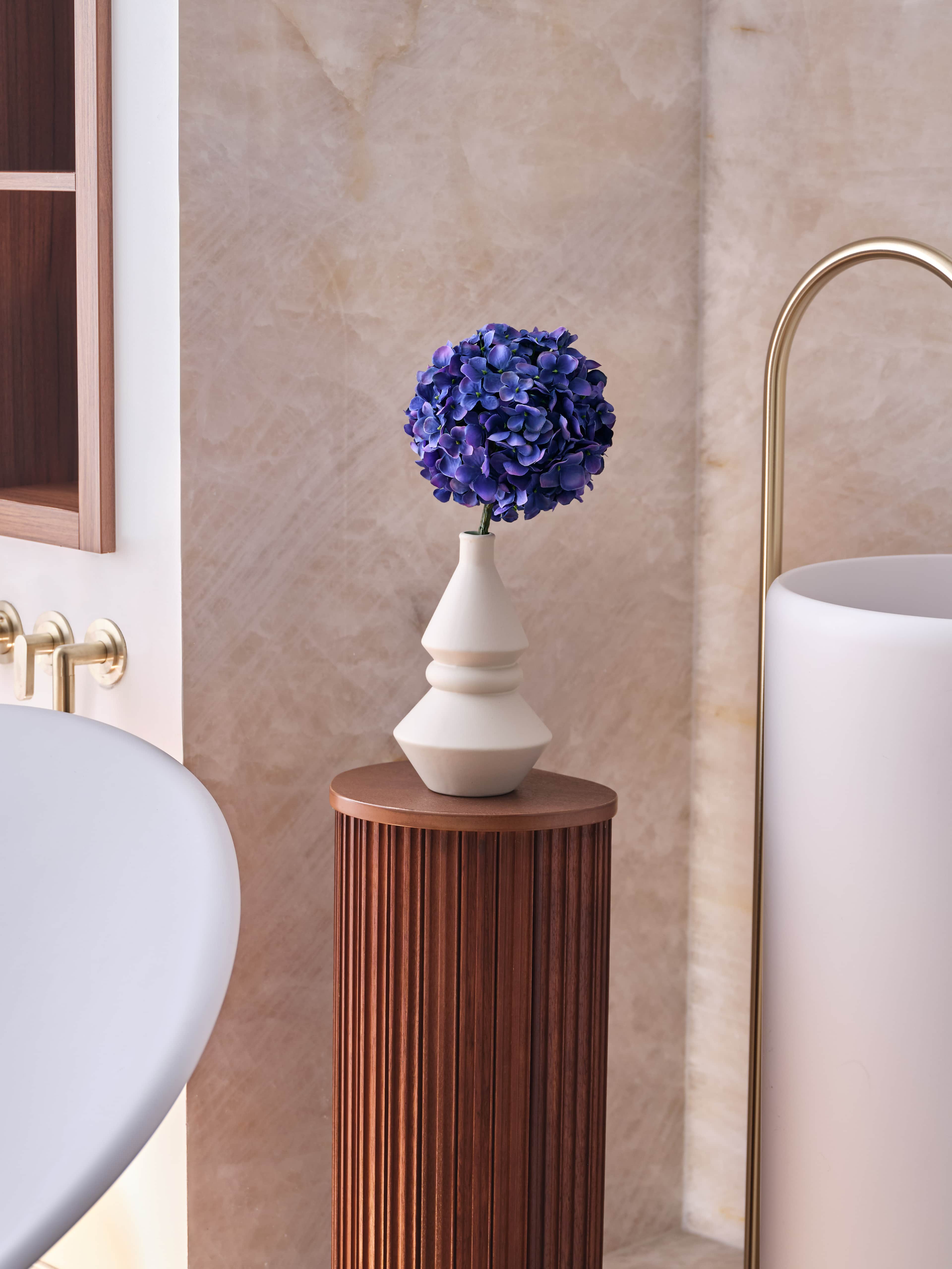 Deze krachtige diepblauwe hortensia komt perfect tot zijn recht in een lichtbeige moderne vaas met strakke lijnen. Arriveert met ons gratis bloemparfum.