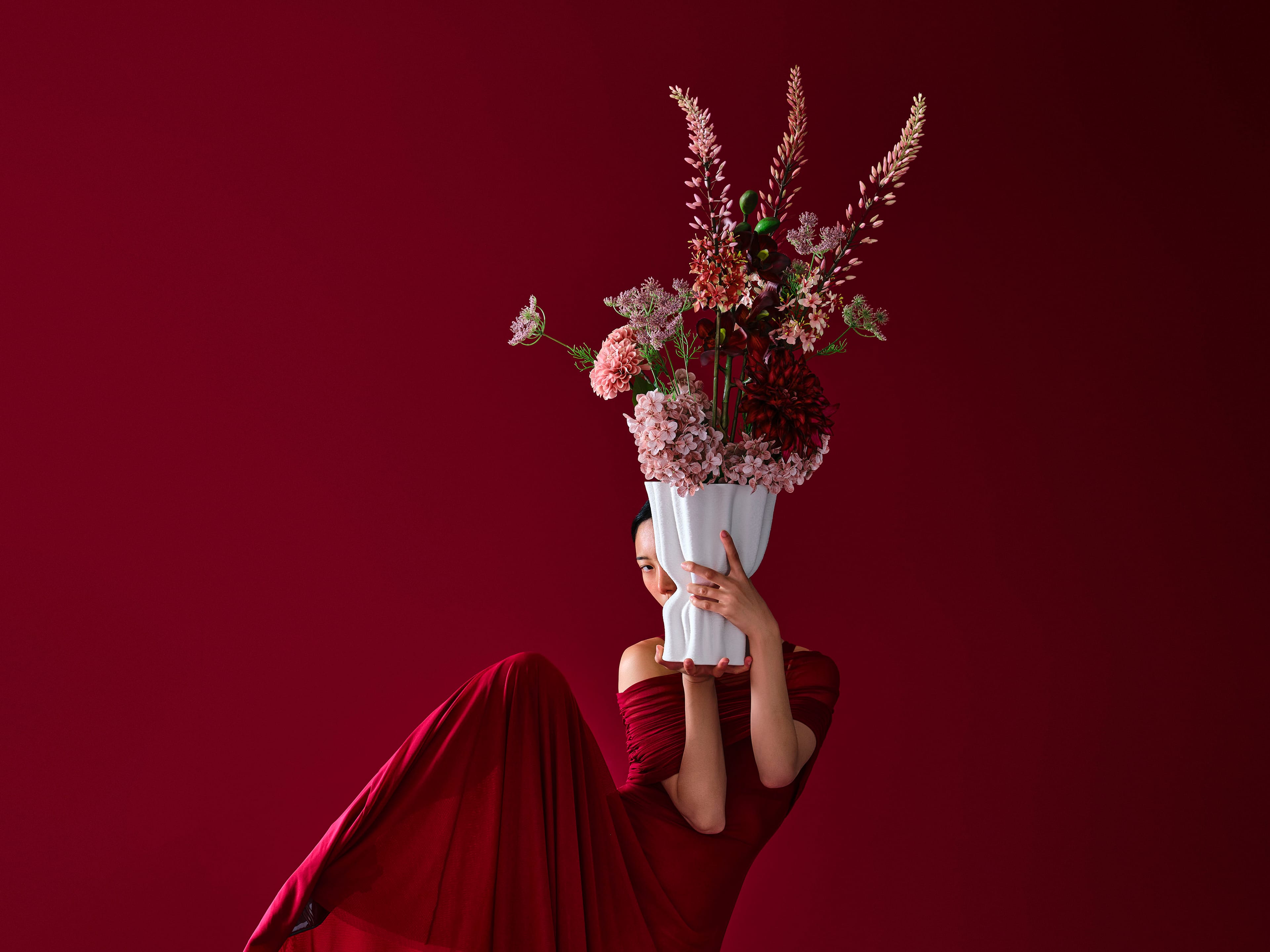 Boeket in blush- en bordeauxtonen met zijdebloemen als eremurus, primula, real-touch dahlia, cymbidium, hortensia, dille en allium, geplaatst in een organisch gevormde vaas in gebroken wit. Dit boeket wordt geleverd met ons gratis bloemparfum.