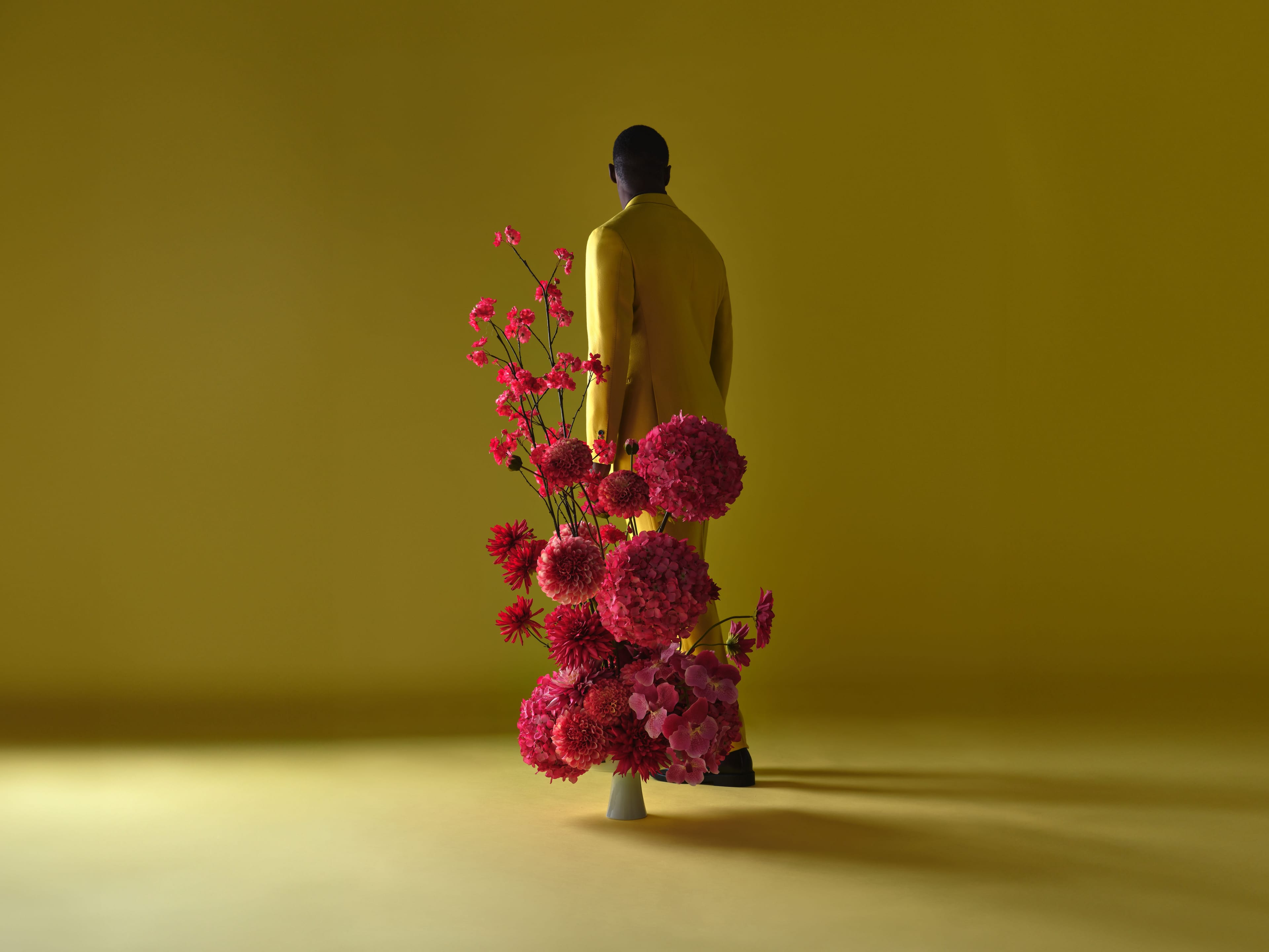 Een levendige helderroze sculptuur, rijzend met zijden dahlia's, hortensia's en bloesems. Dit boeket arriveert met ons gratis bloemparfum.